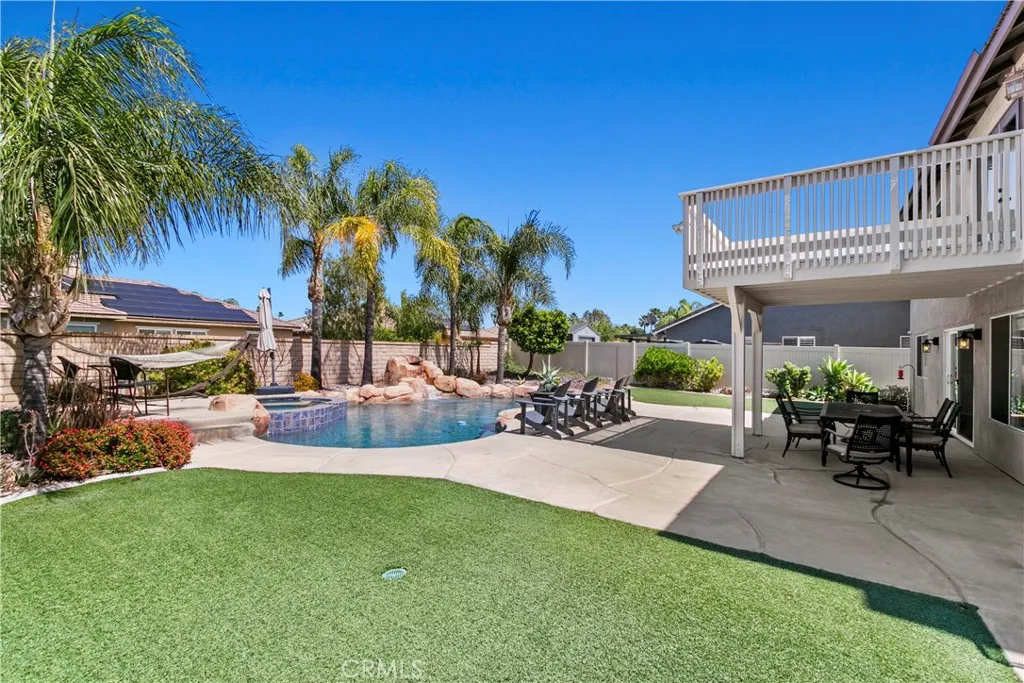 Welcome to 1209 Fernleaf Lane in desirable South Coronaan exceptional move-in ready pool home offering refined comfort and elevated style. This thoughtfully designed residence features 4 bedrooms and 3 bathrooms, including a main-level bedroom and full bath ideal for guests or multi-generational living. The open-concept floor plan showcases a beautifully appointed kitchen with granite countertops, abundant cabinetry, and a breakfast bar that flows seamlessly into the family room, highlighted by a designer fireplace and illuminated built-ins. Upstairs, the elegant primary suite offers a private balcony, walk-in closet, dual vanities, soaking tub, and upgraded shower with modern finishes and a stylish barn door accent. Two additional bedrooms share a well-designed Jack-and-Jill bath. Step outside to a resort-inspired backyard featuring a sparkling pool, spa, waterfall feature, and expansive patio surrounded by manicured landscaping and low-maintenance turfperfect for entertaining. Additional upgrades include owned solar, whole house attic fan, hardwood looking tile flooring, new carpet, travertine baths, and indoor laundry. Ideally located near top-rated schools, parks, and local amenities. No HOA. No Mello-Roos.