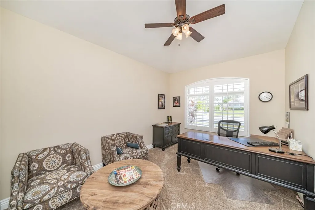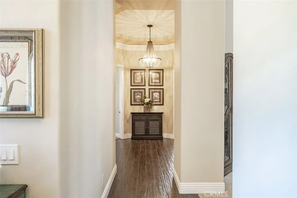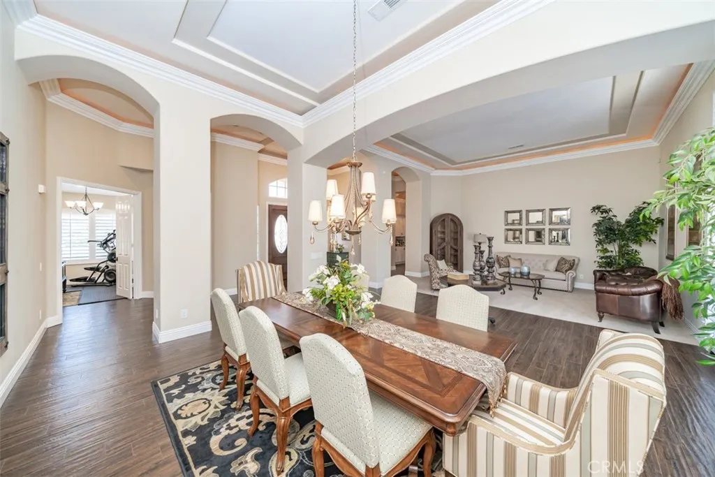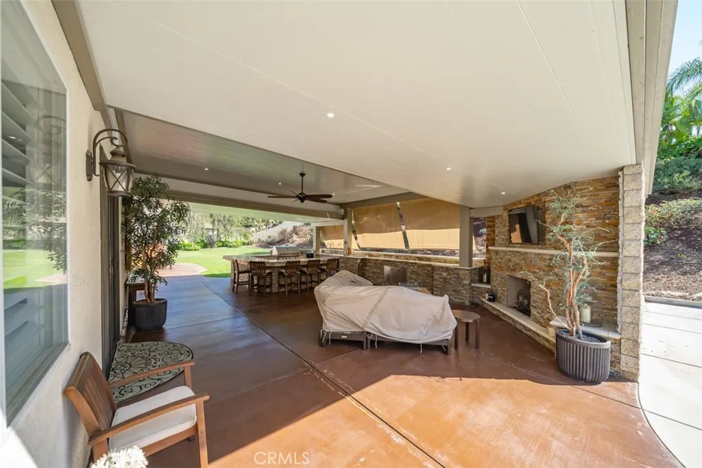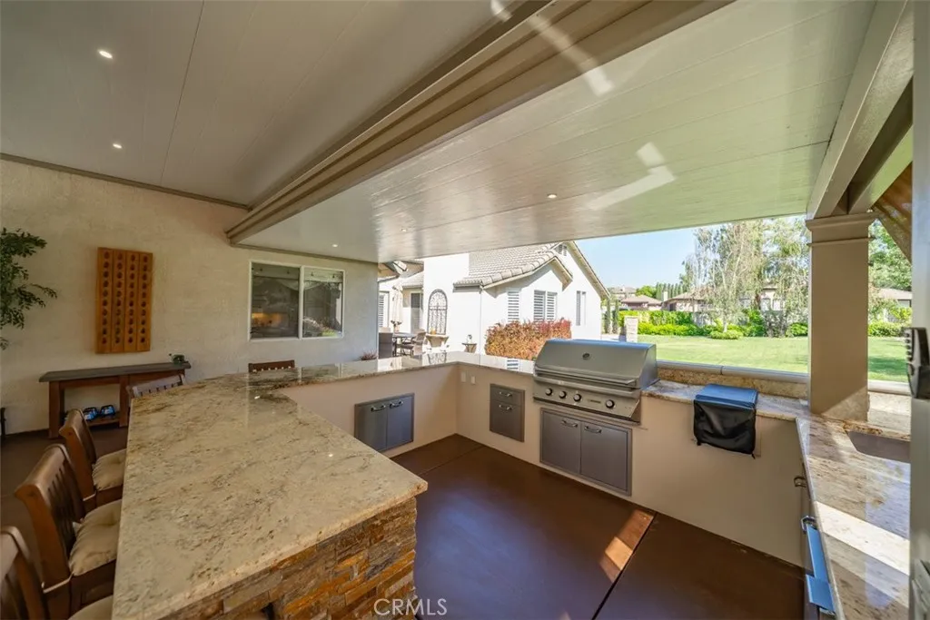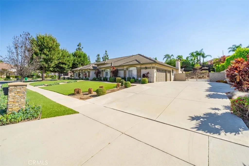 This expansive single story home, located in desirable South Corona neighborhood, has all the upgrades and features you're looking for a luxurious and comfortable style of living. Four bedrooms plus an office, three and a half bathrooms, formal living and dining, and expansive kitchen and adjacent family room are spread over nearly 4,000 square feet, located on a half acre lot. Enjoy entertaining at the formal living and dining room with 14-foot coffered ceilings. The chef's kitchen features Thermador appliances: six burner gas range, double ovens, and built-in refrigerator. There's also a wine refrigerator, Miele coffee maker, and walk-in pantry. Decora cabinets with soft-close doors and drawers line the kitchen, topped by gorgeous marble counters. And the prep island has a conveniently located drawer microwave. All rooms are generously sized, notably the family room with space for a pool table and the primary suite with fireplace and sitting area. The primary suite has a spacious walk-in closet and remodeled bath with oversized shower and free standing tub. Stepping outside, you'll have the luxury of a covered outdoor fireplace and kitchen with newer Twin Eagles gas grill, refrigerator, and bar seating which comfortably seats eight. And enjoy the convenience of gated RV parking with upgraded electrical outlet and easily fits a 55-foot RV. Other notable features include custom shutters and wood blinds, a whole-house vacuum system, new water softener and 75-gallon water heater, epoxy flooring and storage cabinets in the garage, and two outdoor sheds. Located just a short di