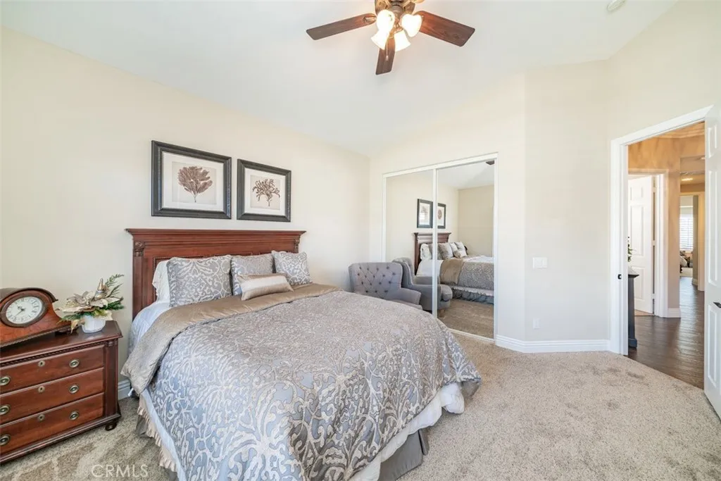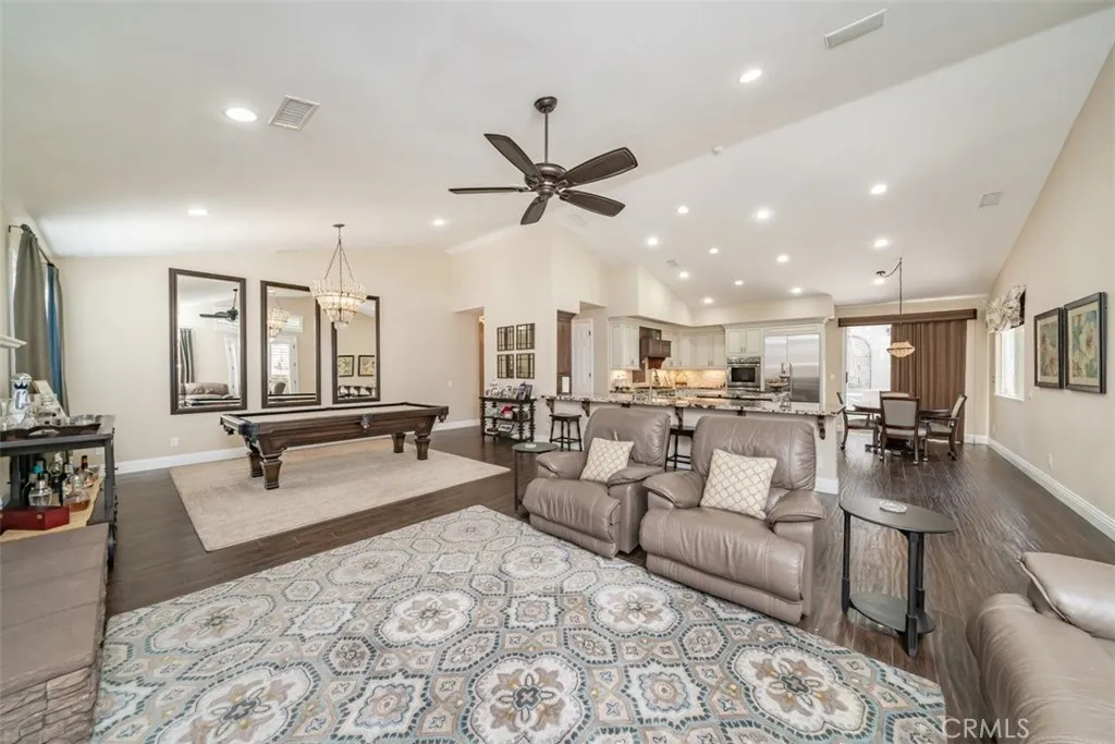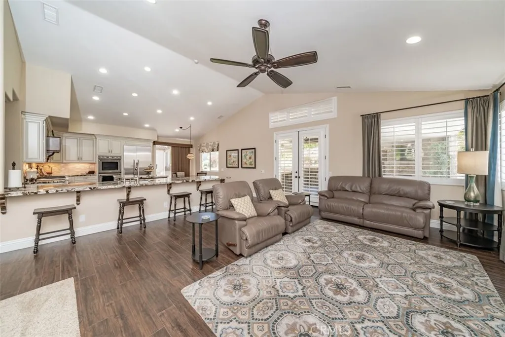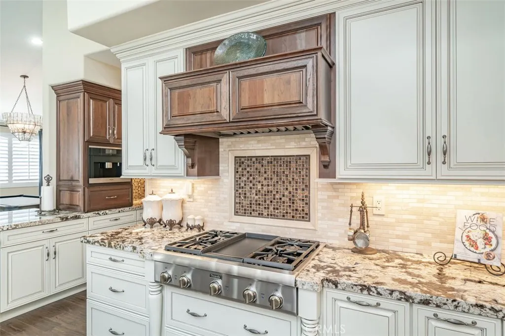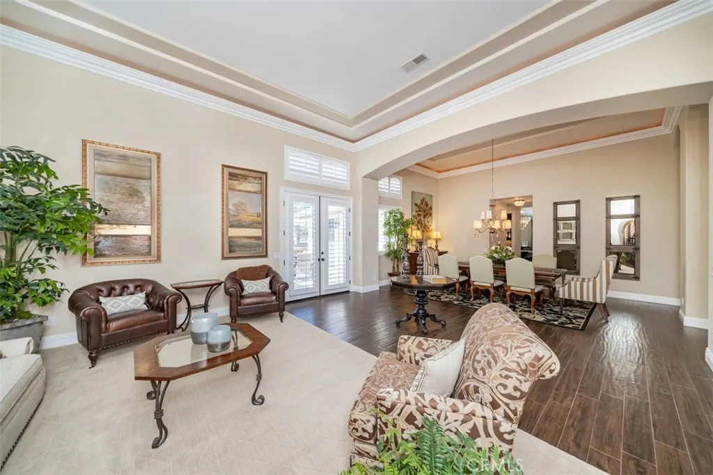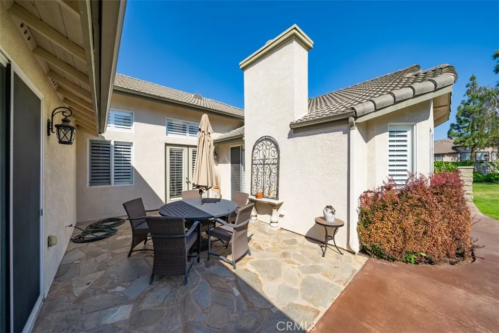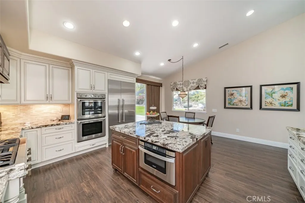 This expansive single story home, located in desirable South Corona neighborhood, has all the upgrades and features you're looking for a luxurious and comfortable style of living. Four bedrooms plus an office, three and a half bathrooms, formal living and dining, and expansive kitchen and adjacent family room are spread over nearly 4,000 square feet, located on a half acre lot. Enjoy entertaining at the formal living and dining room with 14-foot coffered ceilings. The chef's kitchen features Thermador appliances: six burner gas range, double ovens, and built-in refrigerator. There's also a wine refrigerator, Miele coffee maker, and walk-in pantry. Decora cabinets with soft-close doors and drawers line the kitchen, topped by gorgeous marble counters. And the prep island has a conveniently located drawer microwave. All rooms are generously sized, notably the family room with space for a pool table and the primary suite with fireplace and sitting area. The primary suite has a spacious walk-in closet and remodeled bath with oversized shower and free standing tub. Stepping outside, you'll have the luxury of a covered outdoor fireplace and kitchen with newer Twin Eagles gas grill, refrigerator, and bar seating which comfortably seats eight. And enjoy the convenience of gated RV parking with upgraded electrical outlet and easily fits a 55-foot RV. Other notable features include custom shutters and wood blinds, a whole-house vacuum system, new water softener and 75-gallon water heater, epoxy flooring and storage cabinets in the garage, and two outdoor sheds. Located just a short di