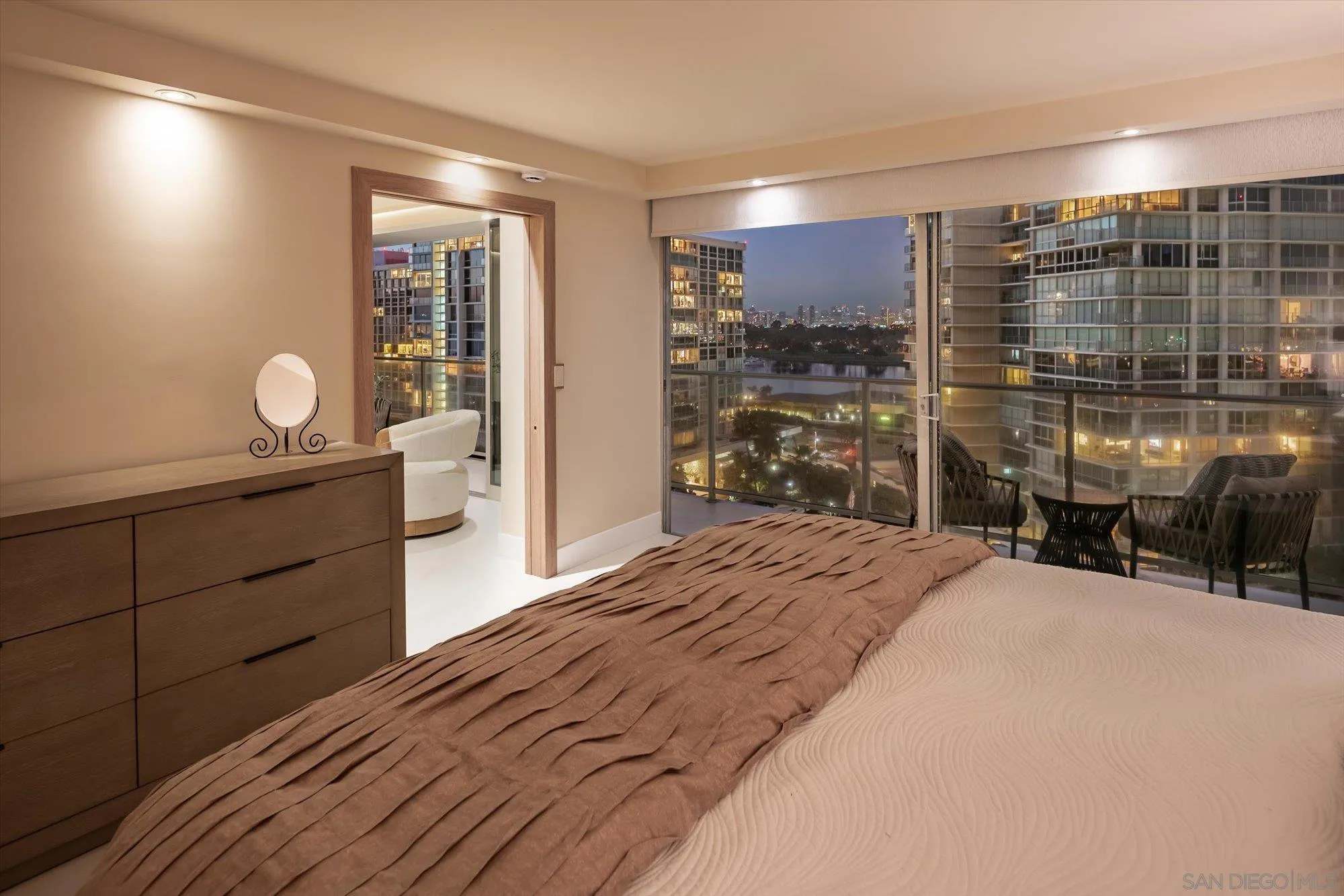 Experience elevated coastal living in this newly reimagined luxury residence. Priced below recent appraisal and offering rare, breathtaking bay and city skyline views from one of Coronado’s most sought-after towers. Thoughtfully redesigned down to the studs with top-tier craftsmanship and high-end finishes, this home blends modern elegance with exceptional value in today’s market. Impeccably crafted with high-end finishes, appliances, and fully custom furnishings, this residence has been meticulously reimagined, down-to-the-studs, with new electrical, plumbing connections, HVAC, and ducting systems. Upon entering, you’ll be greeted by an immediate sense of spaciousness, with split bedrooms designed to maximize the stunning views through extra wide custom pocket doors. Experience the elegance of 48 x 48 imported Porcelain tile flowing out to the balcony. The 9ft non- dropped ceilings enhance the sense of space, while smart storage solutions maximize organization. A culinary haven, the kitchen features custom European cabinetry, top-of-the-line, trendy white glass appliances and the timeless sophistication of 3” Quartzite Taj Mahal counters. Designer walk- in closets are illuminated by ambient LED lighting. A newly added versatile den, perfect for a home office or guest suite, features a custom-sized bed with integrated storage.