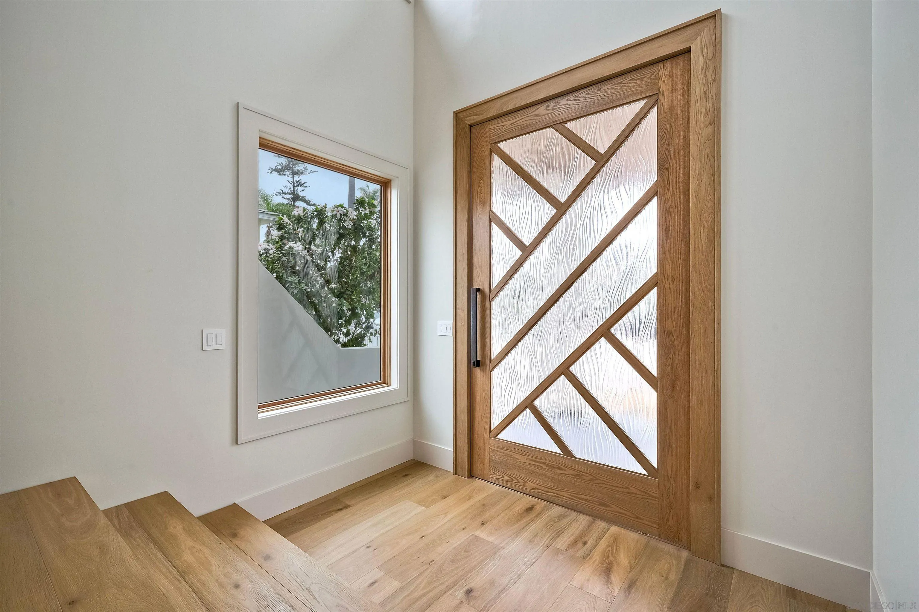 Exceptional Coastal Living Near the Coronado Golf Course! This 5-bedroom, 3.5-bath residence, completed in 2024, offers approximately 3,977 square feet of thoughtfully planned interiors just moments from the Coronado Golf Course, bayfront paths, and convenient access on and off the island. Positioned to capture sweeping views of the Coronado Bay Bridge and the San Diego skyline, the home embraces indoor-outdoor living to the fullest extent. Multiple balconies and a spacious rooftop deck ideal for sunset entertaining capture breathtaking 360 degree views. The main level features an open-concept design centered around a chef’s kitchen with oversized island, Wolf appliances, custom cabinetry, and an oversized pass-through window connecting directly to outdoor dining and grilling space. Living and dining areas open to the front balcony, creating a bright and inviting gathering environment. One of 5 large bedrooms, the primary suite offers a private retreat with vaulted ceilings, skylights, fireplace, spa-inspired bath with soaking tub and multi-head shower, and custom wardrobe storage. A secondary suite and additional bedrooms provide flexibility for guests, remote work, or extended stays. Additional highlights include elevator access to all three levels, a light-filled lower level with bedrooms and media space, and carefully curated architectural finishes throughout, including a masterfully engineered floating staircase. A compelling opportunity to own a top of the line contemporary Coronado home with impressive scale, views, and modern amenities in a prime location.