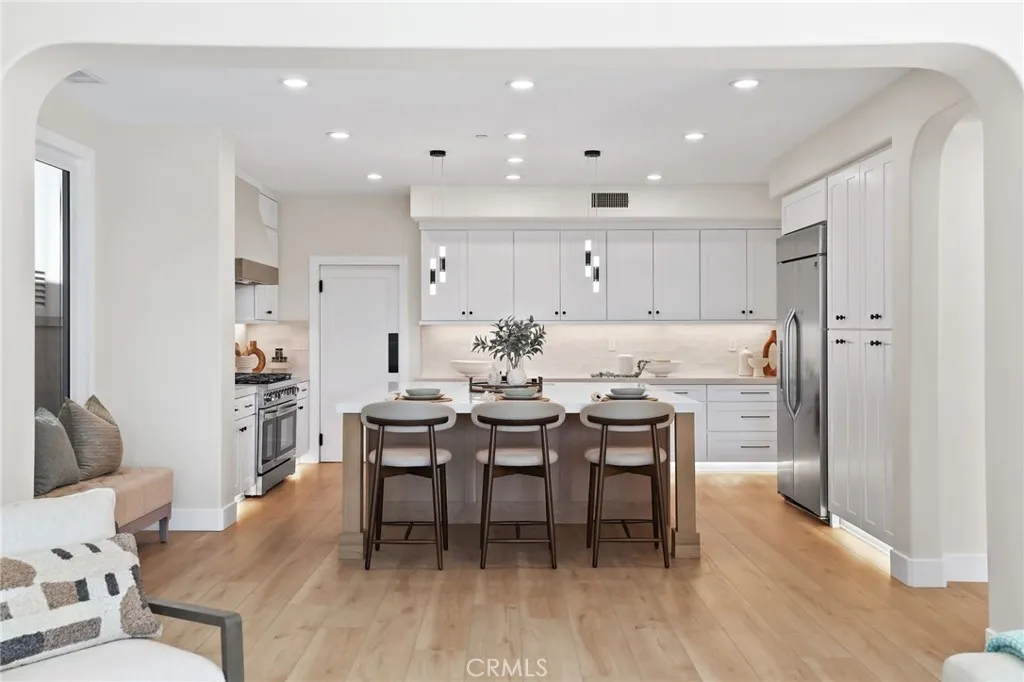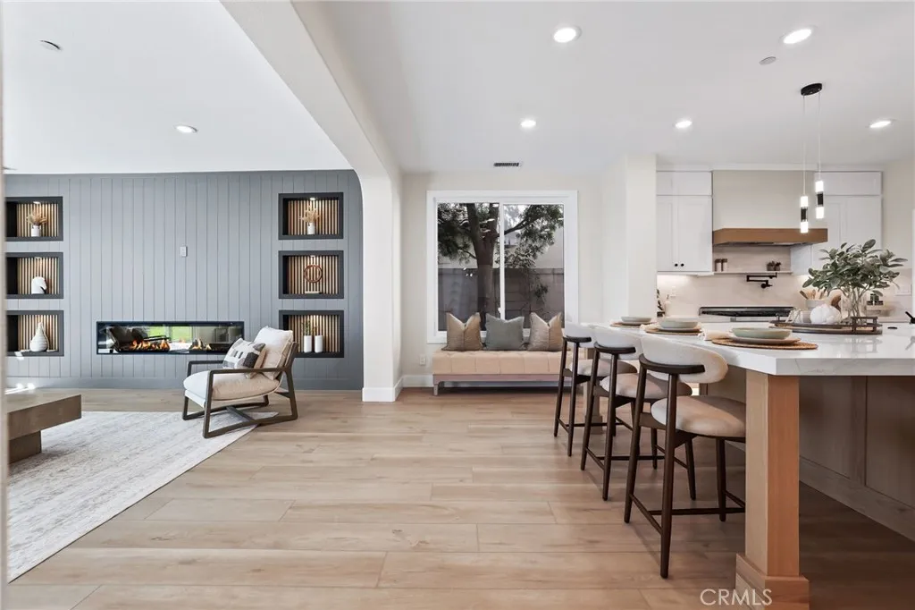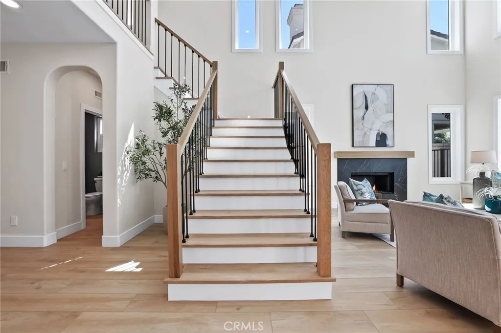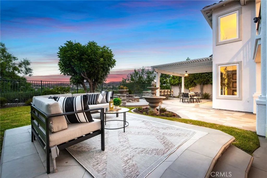 Welcome to this completely remodeled residence, where timeless architecture meets modern sophistication and breathtaking canyon and hillside views. The exterior captivates with stone accents, manicured landscaping, and a private gated courtyard leading to the entry. A three-car garage and classic clay tile roof add to the homes striking curb appeal. Inside, soaring ceilings and expansive windows fill the living areas with natural light. The open concept living room features a sleek fireplace, while the formal dining room is enhanced by a designer chandelier and seamless access to the backyard. The chefs kitchen is a true centerpiece, showcasing a large island, premium stainless-steel appliances, and custom cabinetry. A secondary prep kitchen adds convenience for entertaining. The family room highlights a modern linear fireplace with illuminated niches and sliding doors that frame sweeping canyon views. The home also offers a downstairs office and an en-suite bedroom ideal for guests or multi-generational living. Upstairs, a versatile loft provides a second living area, while two additional bedrooms include private en-suite baths. The primary suite is a sanctuary of comfort and sophistication. A spacious bedroom with accent panel wall and tray ceilings flows seamlessly into the luxurious spa-inspired bathroom. Here youll find a freestanding soaking tub, glass-enclosed shower with multiple rain showerheads, and a sleek dual vanity with LED mirrors. A cozy sitting area with its own fireplace enhances the retreat, while a private balcony captures sweeping hillside views. The ba