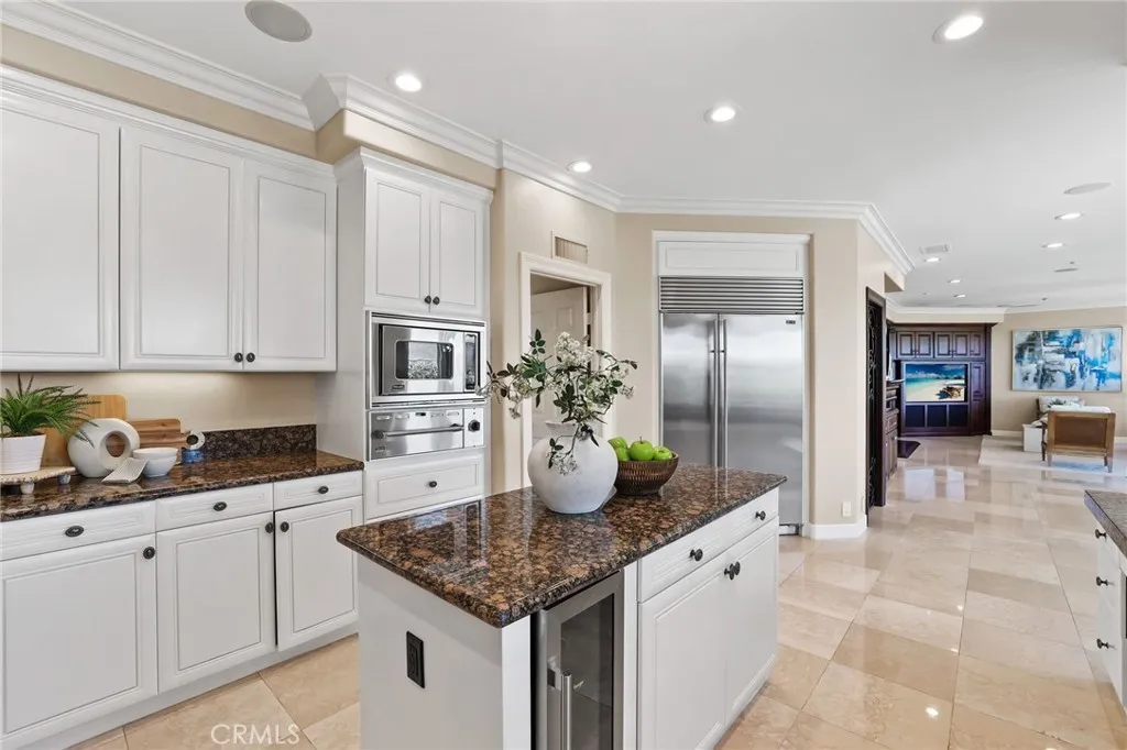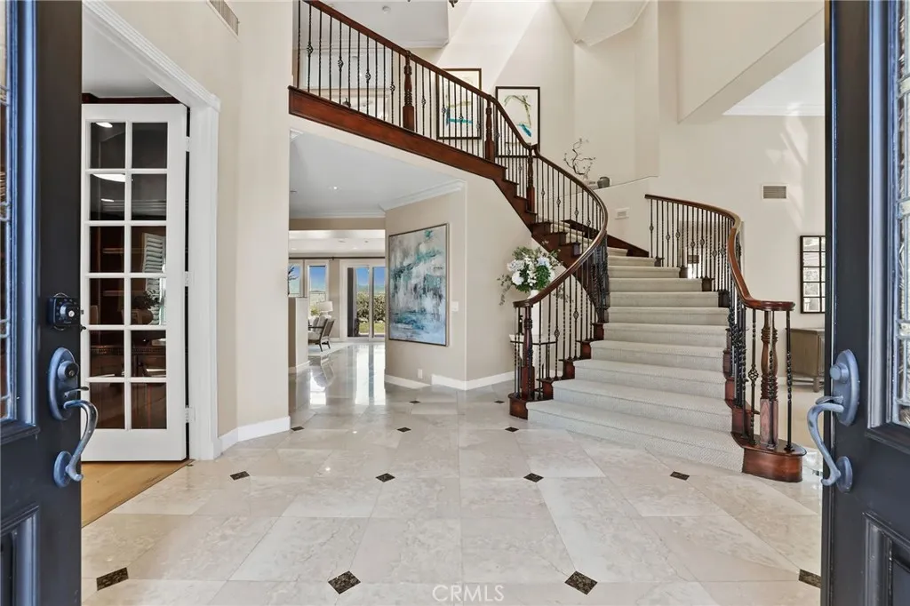 A panoramic masterpiece positioned near the highest elevations of the prestigious guard-gated community of Coto de Caza. Located toward the end of a quiet single-loaded street, this home offers exceptional privacy along with sweeping views of the golf course, rolling hills, and surrounding mountains. Recent improvements include a brand new roof, oakwood-color engineered flooring throughout both levels, a new pool pump, and fresh interior paint, creating a bright, cohesive, and updated interior. Interior features include rich wood detailing, plantation shutters, and stone flooring. The home is also equipped with a whole house water filtration system and soft water system. Spanning approximately 5,000 square feet on an expansive 0.45-acre lot, this home offers 6 bedrooms, 5 bathrooms, plus a dedicated office, thoughtfully designed for both functionality and comfort. Enter through double doors into a grand foyer with soaring ceilings and a skylight that fills the space with natural light. The living and dining areas are seamlessly connected, while expansive windows frame lush greenery and scenic views. The main level includes a private executive office with built-ins and a guest suite with ensuite bath, ideally positioned with views of the backyard garden, pool, and mountains, along with convenient access to the outdoor space. The chefs gourmet kitchen is equipped with stainless steel appliances, a 6-burner Viking Professional gas range, microwave, warming oven, center island, beverage refrigerator, and abundant cabinetry. A walk-in pantry has been converted into a wine storag