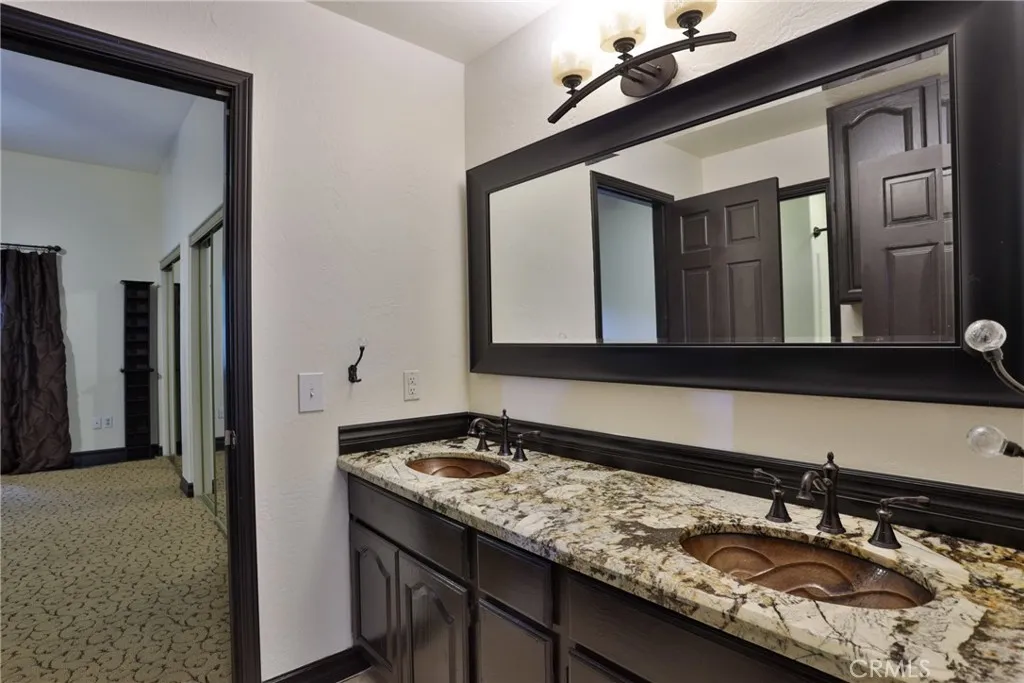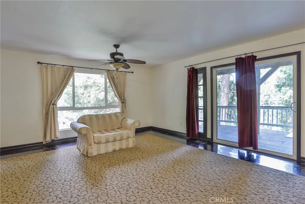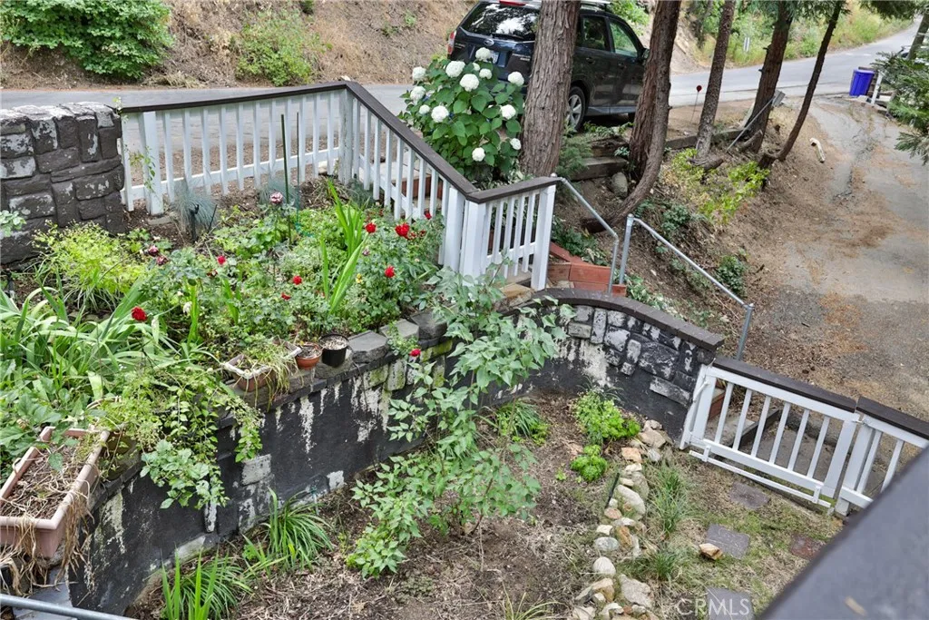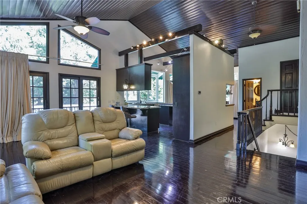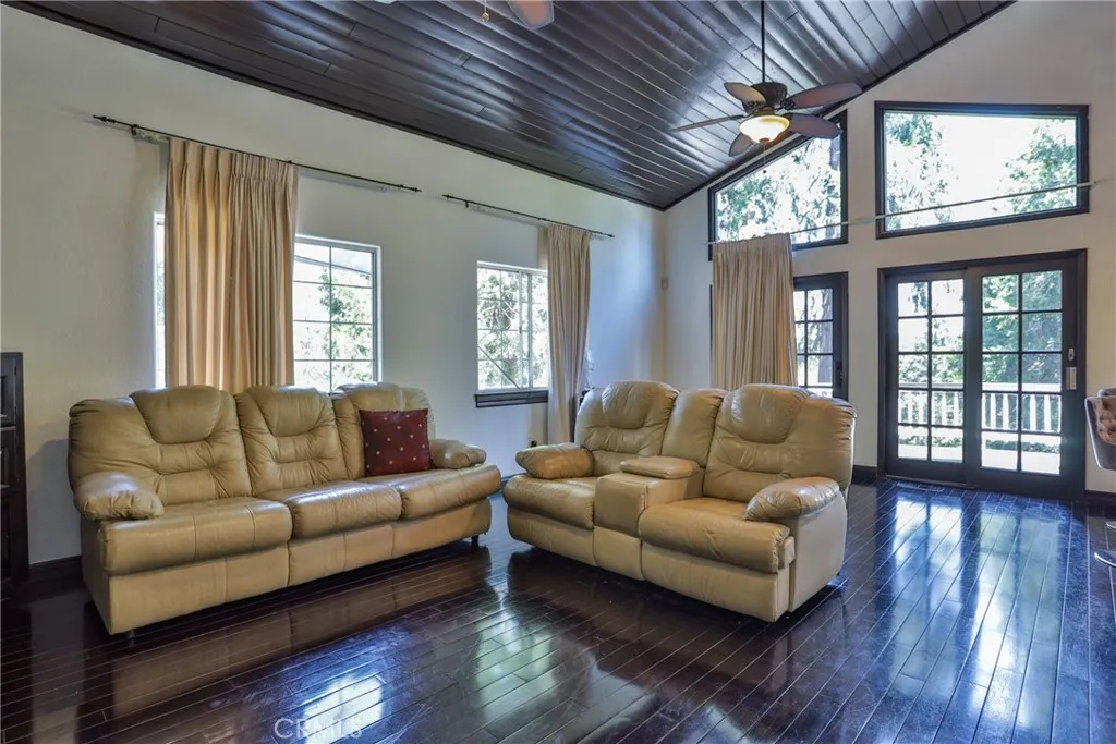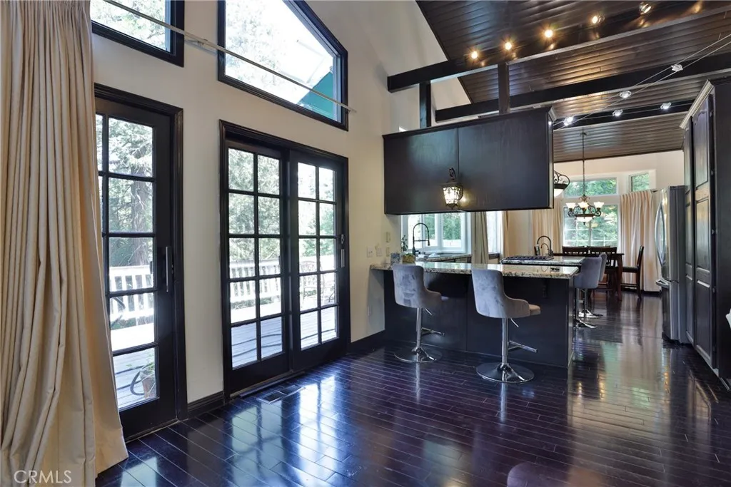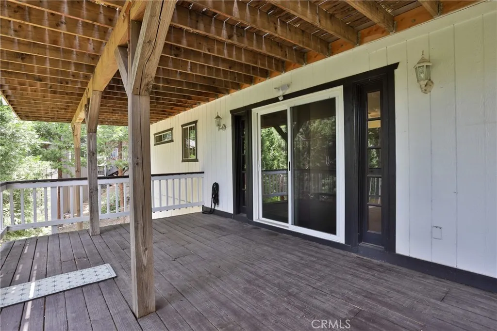 Welcome to your latest opportunity to own a piece of the mountain. There are many pluses here including but not limited to a two car garage with direct access to the inside of the house. The parking area in front of the garage is ample room for two additional vehicles. Entry into the house is through a sweet front porch which leads to glass paneled front door. No steps involved here, just level entry. Walking through the front door you are greeted with a large living room with hardwood floors, vaulted ceilings with half logs for the cabin/mountain feel. Several large windows allow in plenty of light. The stone fireplace is double sided. Take a few steps from the living room and enter the large family room with same flooring and ceiling. The double sided fireplace is here as well with large hearth. Very high ceiling would allow for a beautiful show-stopping Christmas tree. The sliding glass doors lead out to a large deck, great entertaining and barbecues with the natural gas barbecue. Entering the kitchen you will see the beautiful large granite counters and a breakfast/eating counter. A wall of windows above the sink give you lots of light and beautiful view to the trees. On the island is a hammered copper prep sink next to the large stove with oven. The wall affords a large pantry area next to the large refrigerator. A large dining table at the end of the kitchen provides plenty of seating for your meals. A couple steps up from the kitchen there is a half bath to your left and the door leading directly into the garage. This is a dream garage with loads of cupboards for sto