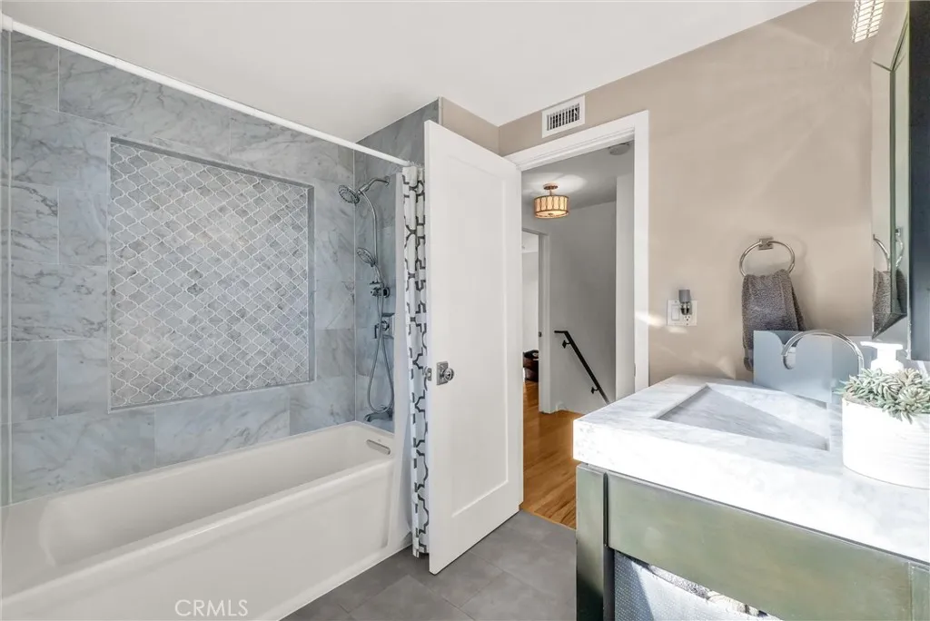 Step into modern elegance in Cypress. This professionally redesigned home sits on a quiet cul-de-sac corner lot and offers 4 bedrooms/3 baths, and nearly 2,000 square feet of upgraded living space on a 6,825 square foot lot. The overall remodel - including all bathrooms - was completed with a cohesive blend of style and function throughout. At the center of the home, the open-concept kitchen showcases solid wood shaker cabinetry, quartz countertops with an oversized peninsula, high-end appliances, glass tile backsplash, undercabinet lighting and abundant storage. The kitchen flows seamlessly into the dining room and family room, creating an inviting environment for entertaining and everyday living. Sliding doors open directly to the private backyard patio, extending the living space outdoors. The dining room also connects effortlessly to the formal living room, where a custom fireplace with an oversized mantel serves as a striking centerpiece. Solid wood shaker doors and custom baseboard molding extend throughout the entire home, adding timeless character and continuity. A convenient downstairs bedroom with an adjacent 3/4 bath provides flexibility for guests or multi-generational living. Upstairs, the primary suite is a true retreat, featuring an oversized custom closet with built-ins and elegant milk glass doors. The attached designer bathroom offers double sinks, custom tile work, seamless glass shower doors, and high-end fixtures. The second floor also includes two additional bedrooms and a beautifully appointed hall bath with a custom vanity, Carrera marble surround an