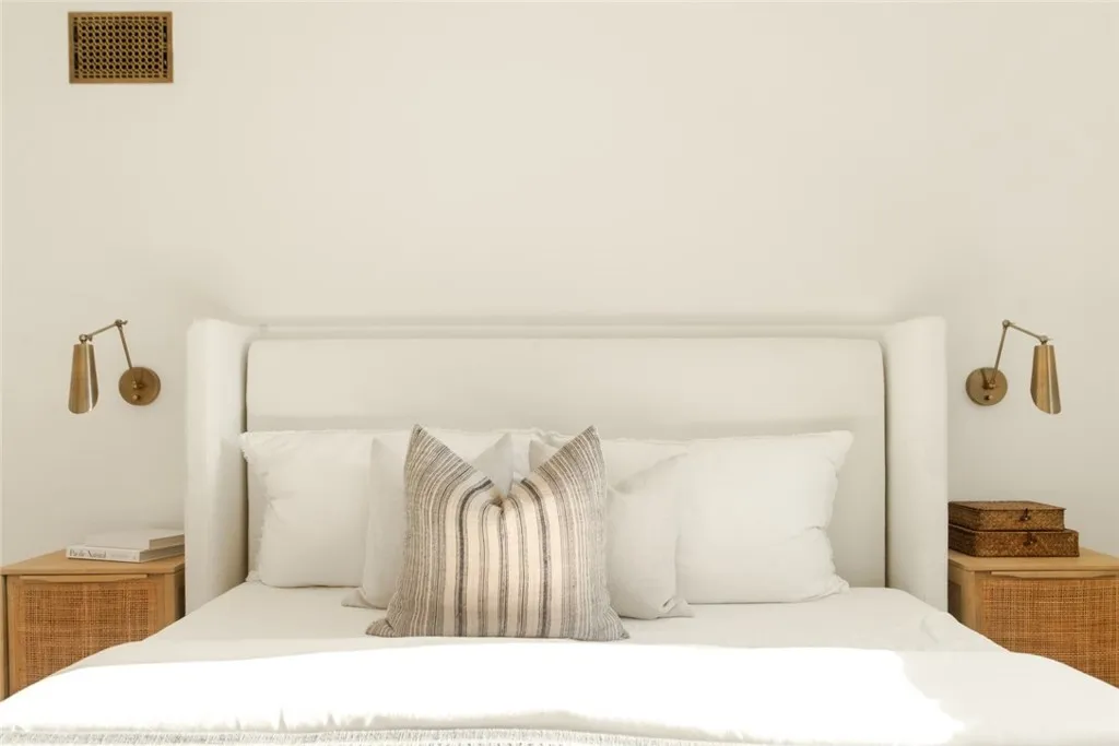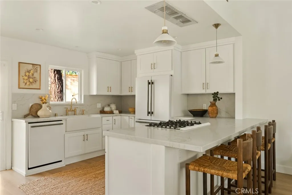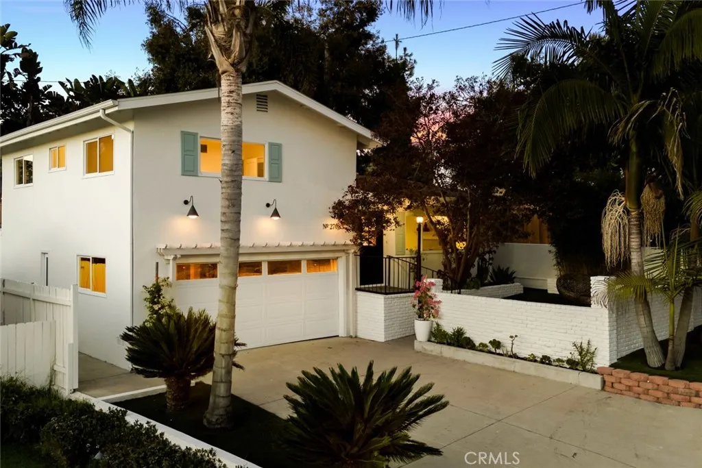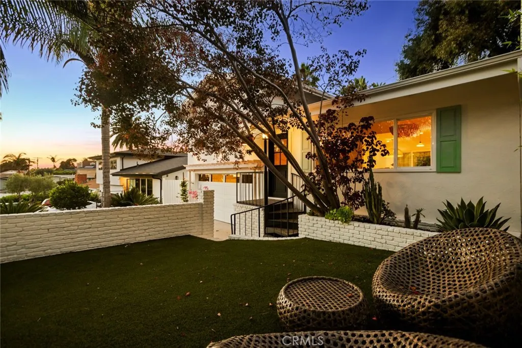 Endless charm and designer flair define this fully renovated 1960s coastal cottage in Dana Point's coveted Palisades community of Capistrano Beach. Reimagined in 2025 by local designer Shannon Vandermeer of Vandermeer Designs, 27085 Calle Dolores offers 3 bedrooms and 2 bathrooms across 1,400+ square feet of thoughtfully curated living space. Every detail reflects quality and care, from designer finishes by Pottery Barn, West Elm, and Crate & Barrel to natural Zellige tiles, marble and quartz stone surfaces, and elegant brass fixtures. A storybook first impression begins at the curb with a sprawling front lawn, mature trees, spiral staircase, Willow Blue shutters, and a French-pane front door. Inside, vaulted wood-beam ceilings, luxury vinyl plank floors, and a quartz-surround fireplace with a wood mantel create a warm, inviting atmosphere. The stunning eat-in kitchen blends beauty and functionality with an oversized peninsula island, brand-new antique white Forno appliances, a patina brass faucet, farmhouse sink, and verdant garden views. The ensuite bedroom on the lower level features custom wardrobes, a shiplap accent wall, and direct access to the backyard. Its spa-like bath showcases Moroccan Zellige tile floors, a seamless scallop-tile shower, brass fixtures, and a dual-sink marble-top vanity from Pottery Barn. Upstairs, two spacious bedrooms offer ample closet space, designer lighting, and charming views; one with a private balcony overlooking the backyard and the other with treetop and peek-a-boo ocean vistas. A second designer bathroom impresses with mosaic marble