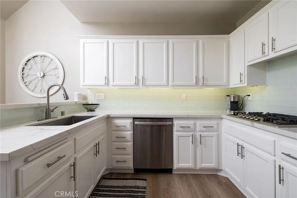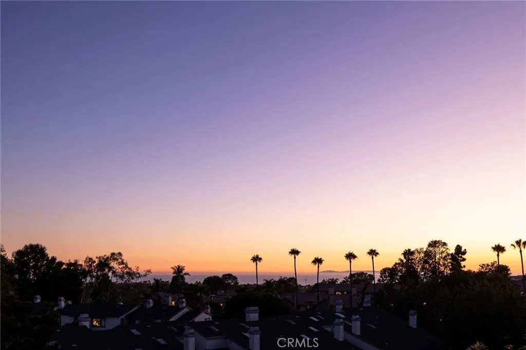 Experience elevated Dana Point coastal living in the exclusive gated community of Encantamar, where ocean views and sunset colors are your daily backdrop. This single-level home features a flowing, open concept with two bedrooms, two full baths, and extensive updates throughout, all oriented to enjoy the coastline and evening skies. Arrive to your private two-car garage with electric vehicle charging outlet and plenty of guest parking nearby. Inside, a formal foyer opens to light-filled living and dining areas with a custom fireplace and sliding doors to a view deck. A bar nook and outdoor living space make entertaining simple, and the southwest exposure frames nightly color over the water. Wide-plank floors guide you through the designer chef's kitchen, featuring quartz countertops, crisp white cabinetry, subway-tile backsplash, and stainless-steel appliances. Vaulted ceilings create an airy atmosphere in the eat-in breakfast nook and convenient quartz built-in desk, while skylights bathe the space in natural light. Both bathrooms have also been remodeled with elegant quartz finishes and upgraded fixtures. The thoughtful floor plan places the two bedrooms on opposite sides for maximum privacy and flexibility. The first spacious bedroom features vaulted ceilings, a large window with plantation shutters, and a generous walk-in closet. The primary suite serves as a private retreat, complete with a sitting area that captures stunning views, plus an upgraded en-suite bath with a double-sink vanity and large walk-in closet. Convenient in-unit laundry is located nearby. Located i
