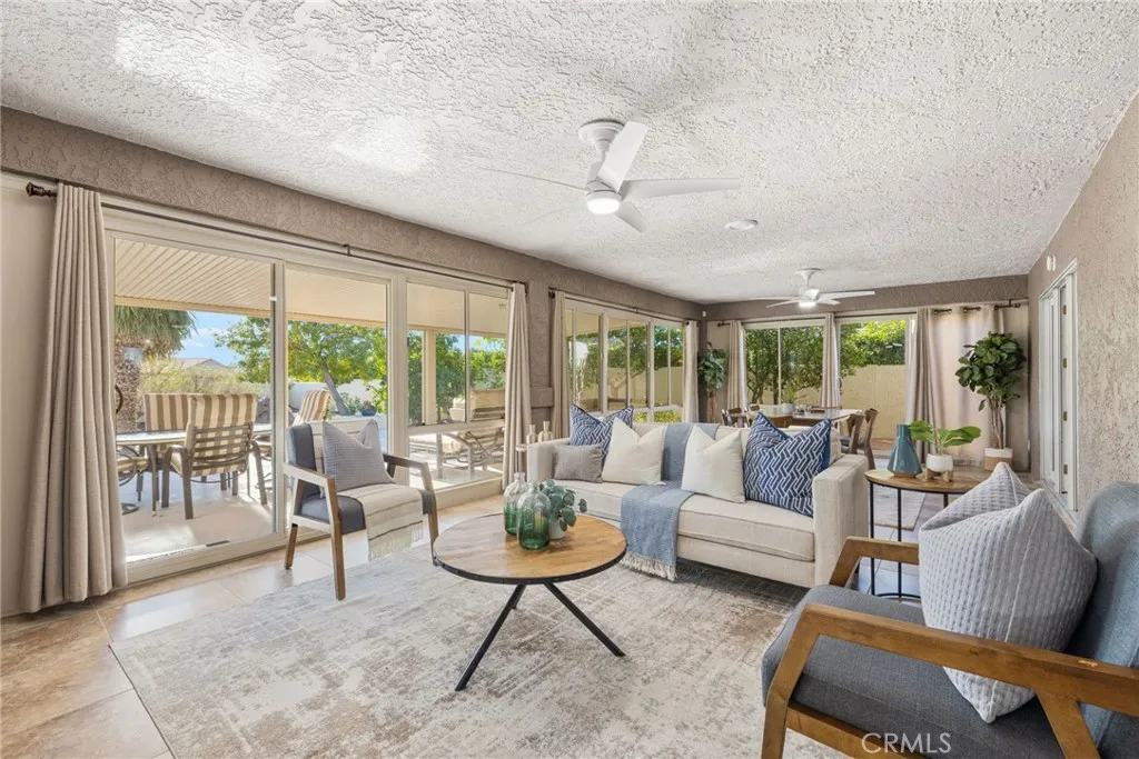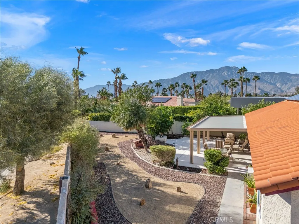 Welcome to 64991 Barnes Ct, an immaculate single-family home nestled in the beautiful golf course community of Mission Lakes Country Club. This expansive 2404 square foot residence is situated at the end of a quiet cul-de-sac on a large 9583 square foot, pie-shaped lot. The open floor plan includes a great room with wet bar, perfect for entertaining. The large permitted room addition is perfect as a family room, game room, or as a relaxing retreat. Step outside to your private back yard that includes a large covered patio with views of a rock waterfall feature, impeccably maintained landscaping, and mature fruit trees. The kitchen features granite counter tops with breakfast bar, freshly refinished cabinets, a greenhouse window, and includes a stainless steel refrigerator. The kitchen has direct access from the garage to make unloading groceries very convenient. The indoor laundry room comes complete with washer and dryer included. This home has been tastefully updated with fresh paint throughout, and new carpet in all three bedrooms. The primary suite bathroom boasts a double sink setup and large over-sized walk-in shower. Secondary bathroom has a double sink vanity and includes a Safe-Step walk-in tub. Each bedroom provides ample space, and the primary bedroom walk-in closet ensures plenty of storage. This home has solar panels to make make cooling off in the summer months very affordable. The three car garage has built in storage cabinets and plenty of space for your golf cart so you can hop in and drive to the 1st tee, country club, on site restaurant and bar, picklebal