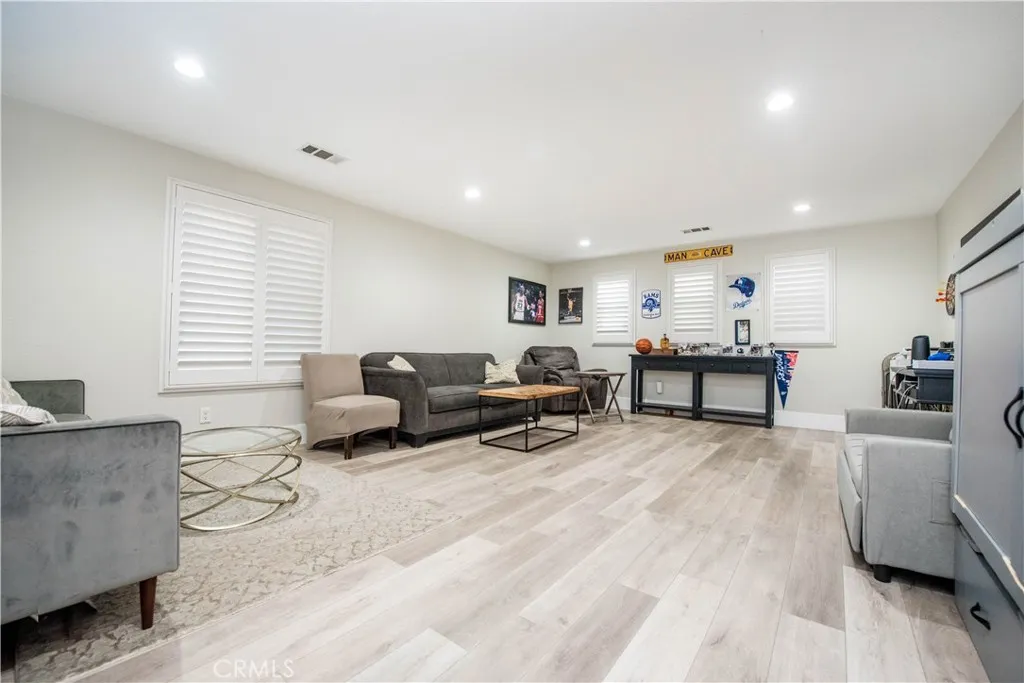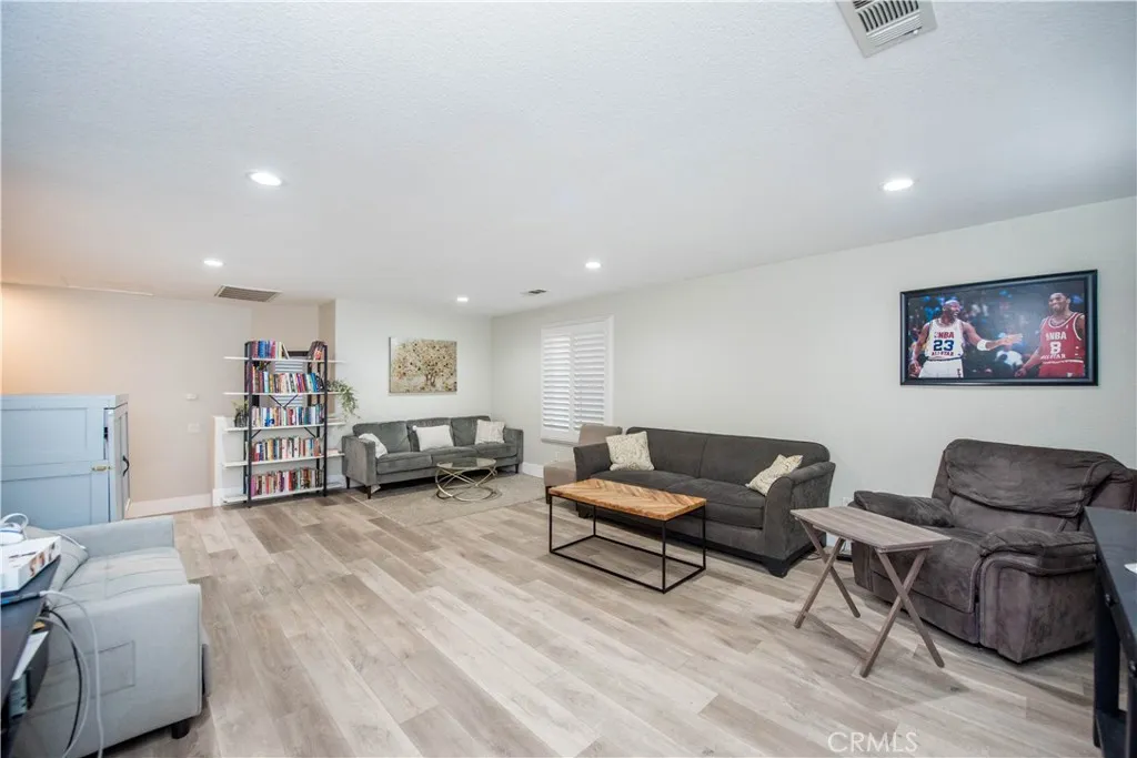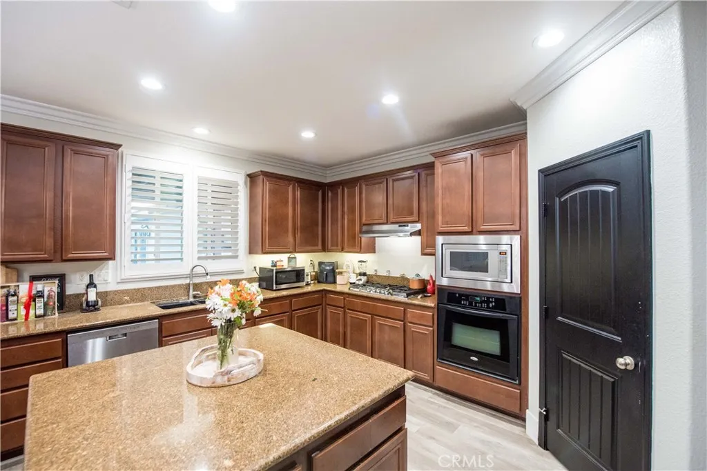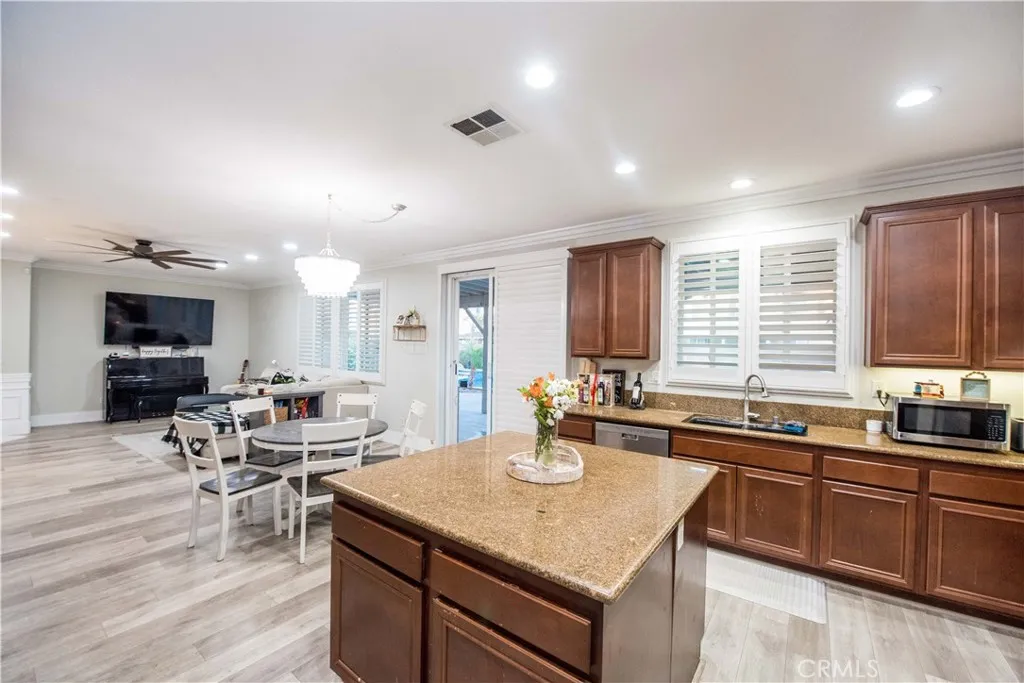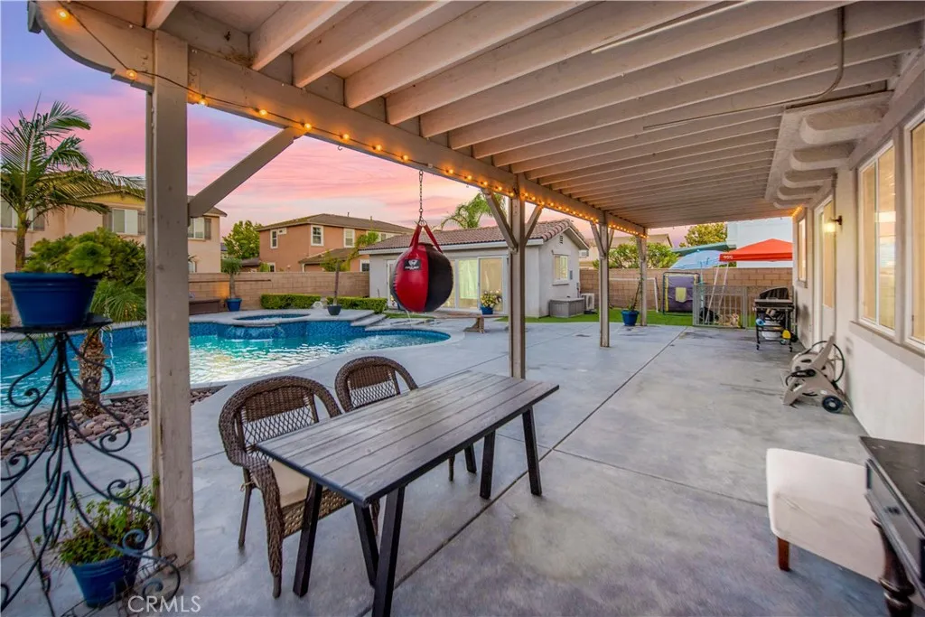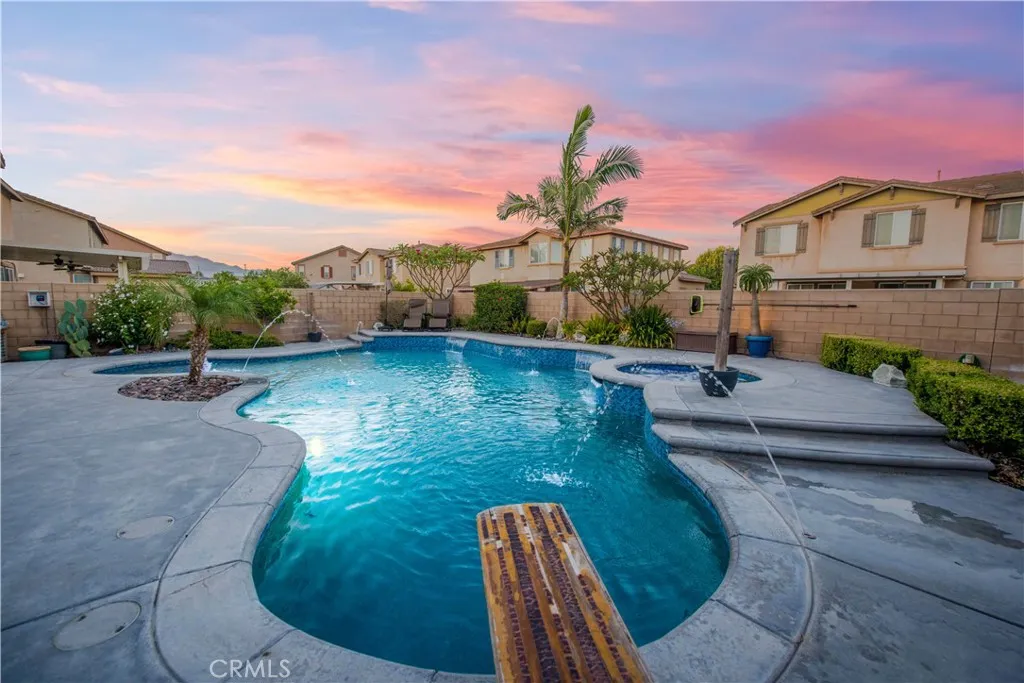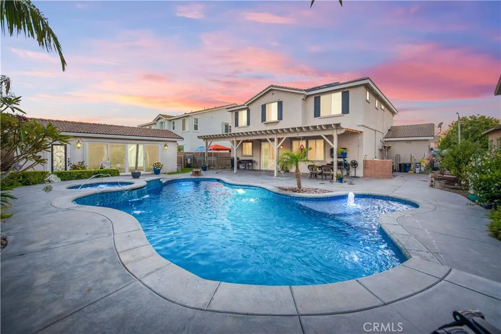 Your backyard oasis of entertainment is located on the west side of Eastvale. This beautifully appointed home offers the perfect blend of convenience, and resort-style living. This 4 bedroom, 2.5 bath, home office, plus enormous loft home has 2,802 sq ft in the main house and along with a newer ADU that offers 328 sq ft of living space. The guest house is a studio with a luxury bathroom and kitchen. This flexible space is ideal for extended family, rentable space, or a work -from-home retreat. Step into your own backyard paradise where a sparkling pool and spa invite you to relax and entertain year-round. The home comes equipped with PAID off SOLAR panels ( 26 ), delivering exceptional energy efficiency and long term savings. There is no HOA. New luxurious vinyl floor planking, with 7 inch baseboards provide for durability and style. The first floor has an enclosed office with built-in cabinets. New dazzling lights lead you through the home adorned with wainscoting. There is a separate laundry room on the first floor and 1/2 bath downstairs. All bedrooms are upstairs, along with a built-in desk / work area. The first floor office can be considered your 5th bedroom by officially adding a closet. The oversized loft is limitless with its potential use. Car enthusiasts will appreciate the finished garage with brand-new gray/black/white epoxy flooring. Inside, you'll find a bright, open layout designed for modern living, upgraded lighting, perfect for gatherings or quiet evenings at home. The kitchen has a center island and there is a separate walk-in pantry. Located close to aw