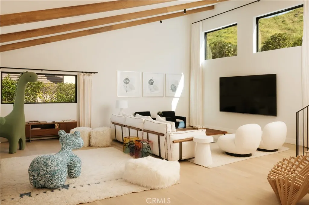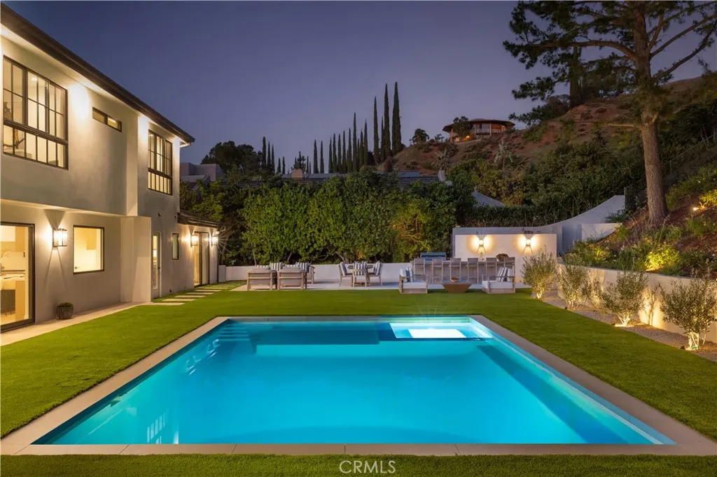 Situated in the coveted hills of Encino, this beautifully redesigned residence offers modern elegance, privacy, and sweeping views. Originally known as the iconic Karate Kid House, featured in the classic film The Karate Kid, the property carries a unique piece of Hollywood history while now showcasing a thoughtfully reimagined modern living experience. A welcoming entry introduces soaring ceilings, a striking staircase, and wide plank wood flooring that flows throughout the home. Generous living and entertaining spaces are framed by large windows that fill the interiors with natural light while capturing lush greenery and scenic hillside vistas. Living areas are anchored by sleek fireplaces, creating warm and inviting environments ideal for both everyday living and entertaining. The gourmet kitchen is thoughtfully designed with custom cabinetry, high end appliances, a large center island with seating, seamlessly opening to the surrounding living and dining spaces. Upstairs, a spacious recreation room with vaulted ceilings and exposed wood beams offers a versatile gathering space perfect for a media lounge, game room, or relaxed family living. The primary suite provides a peaceful retreat, featuring a spa inspired bathroom with a soaking tub, oversized shower, dual vanities, and an expansive walk-in closet. Designed for both entertaining and everyday enjoyment, the backyard offers a true resort like setting with a pool and spa, multiple lounge and dining areas, an outdoor kitchen and BBQ, and lush landscaping that extends up the hillside, creating a private outdoor environm