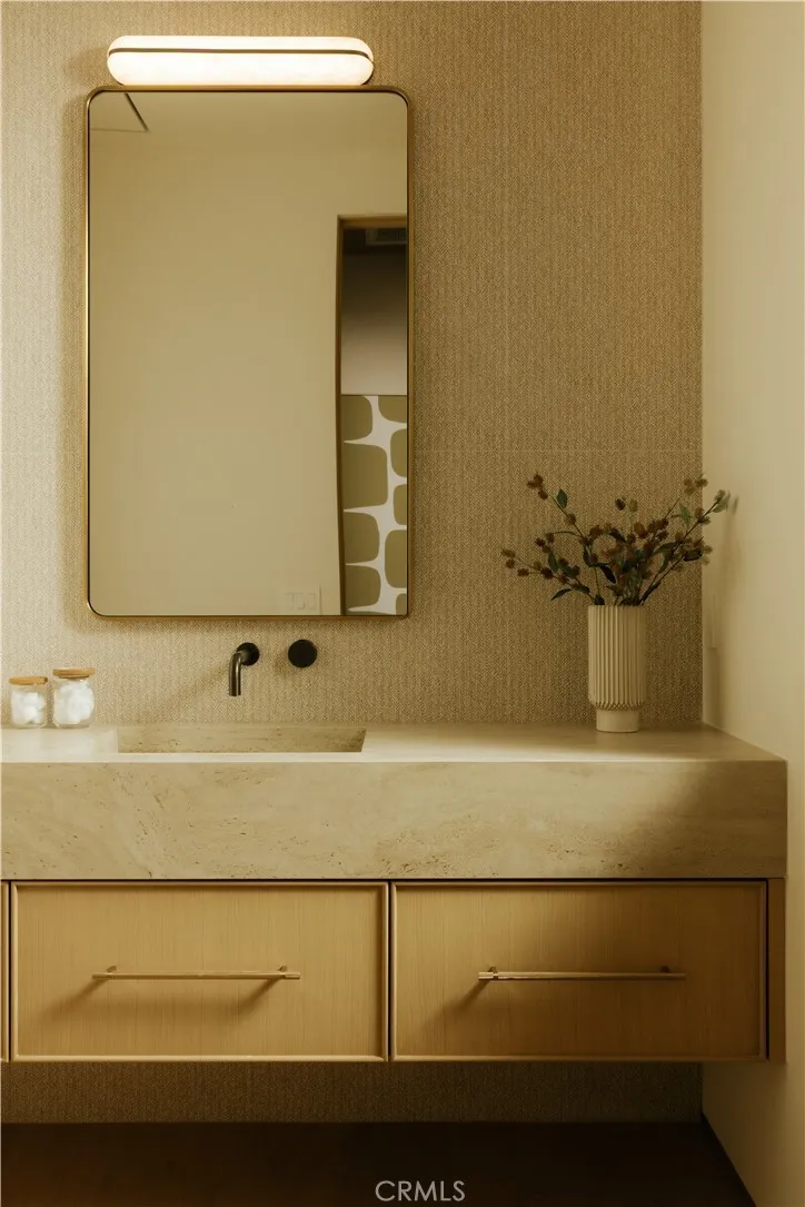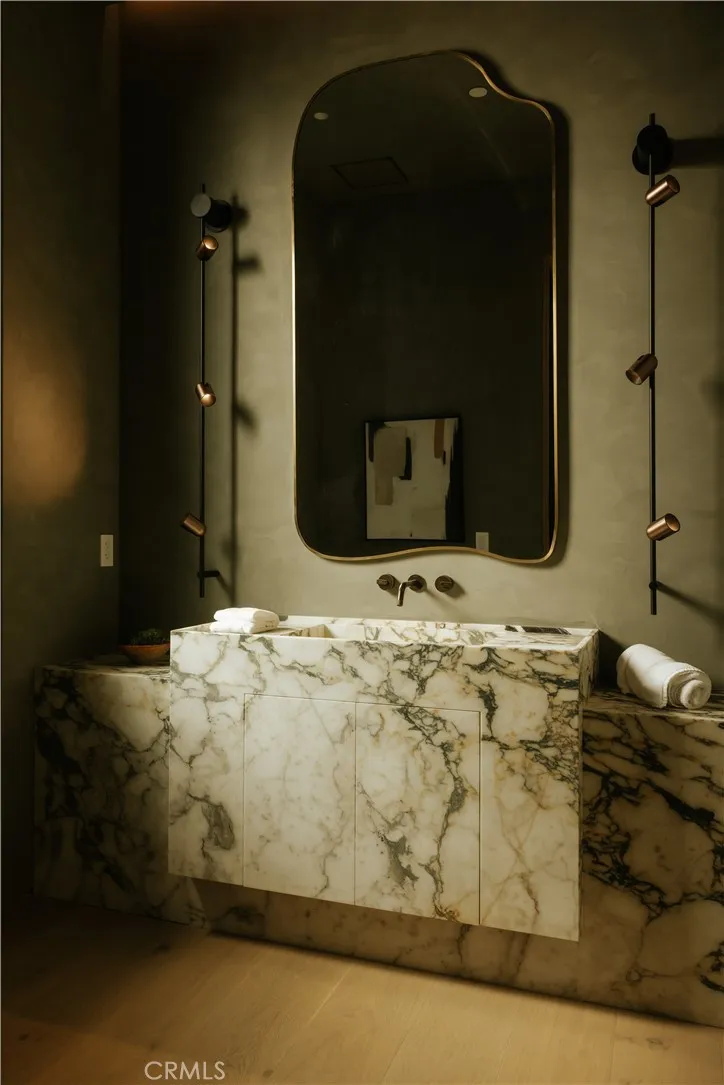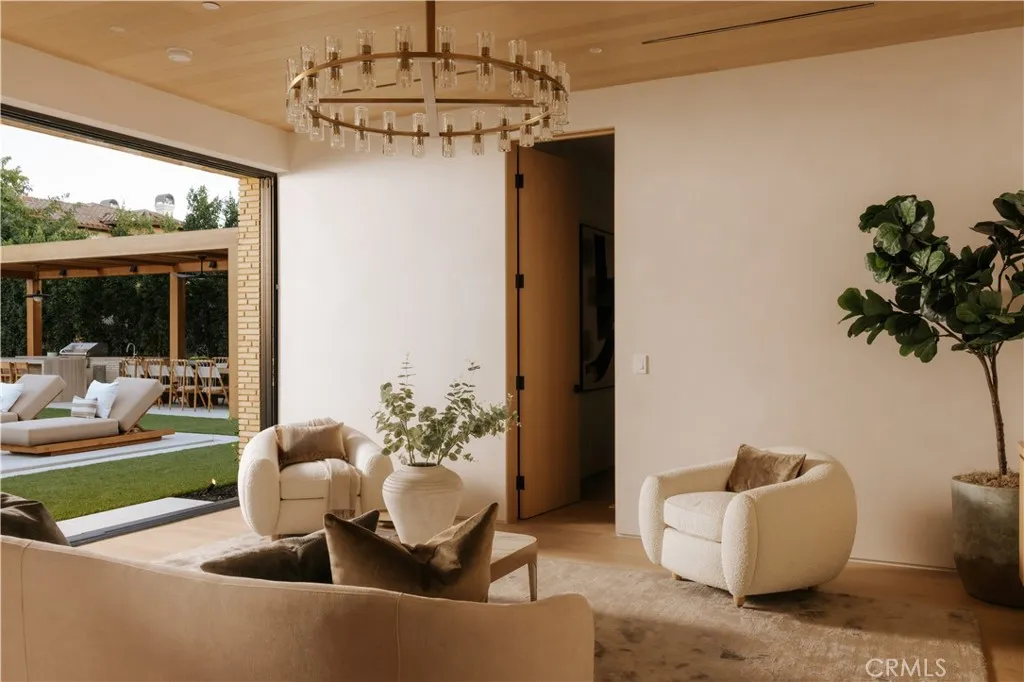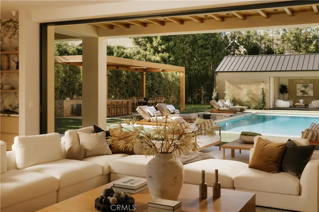 Introducing a masterfully crafted gated estate that redefines luxury living, privacy, and scale in the heart of Encinos prestigious Royal Oaks enclave. Designed by acclaimed architect Eran Gispan and elevated by bespoke interiors from Sophea Design, the residence delivers a seamless balance of modern sophistication and resort-style livingcrafted at the highest level. A grand circular motor court with paver detailing, and two mature olive trees creates a timeless sense of arrival and privacy. Inside, soaring two-story ceilings, hand-applied plaster walls, and warm wood detailing frame a light-filled, open floor plan. Wide-plank white oak floors extend throughout the entire home. The kitchen is a true statement of form and function, anchored by a double island wrapped in dramatic Calacatta Viola marble, Custom white oak cabinets, premium Miele appliances, and a separate prep kitchen with walk-in pantry. Adjacent to the dining area, a serving bar with limestone countertops and backsplash enhances entertaining flow, while the family room is defined by a sculptural travertine stone. The main residence features six bedrooms, all en-suite, in addition to an office, a dedicated movie theater, gym, lounge and game room. The primary suite is a private sanctuary, highlighted by a private balcony and a spa-inspired bath wrapped in leathered Taj Mahal stone, complete with a skylit shower that fills the space with soft natural light. Designed for year-round enjoyment, the grounds unfold as a true private resort. The expansive backyard includes an oversized pool with spa, sunken firepit,