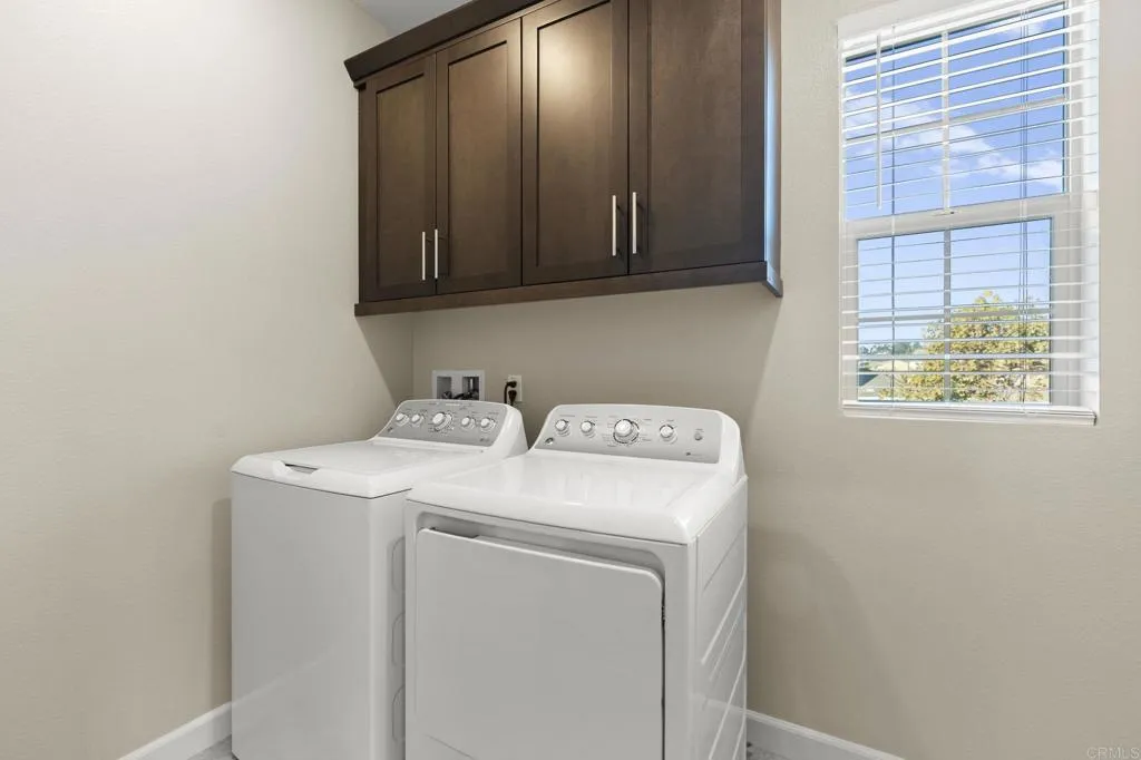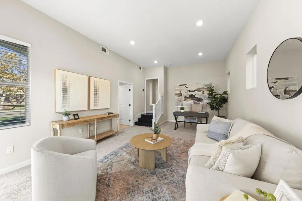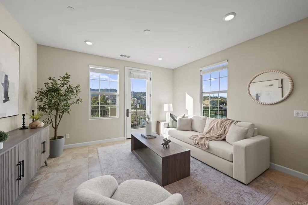 Located in the desirable Martingale neighborhood of Harmony Grove Village, this stunning three-story live/work home offers modern design, flexible workspace, and sweeping Ridgeline mountain views. Built in 2020, this home offers 3 bedrooms, 3.5 bathrooms, live/work space, and 2,204 sq ft of thoughtfully designed living space. The property features an open-concept floor plan, upgraded finishes, solar, tankless water heater, new carpet, and two second-level balconies with ridge line mountain views. The first level includes a builder designed live/work/play flexible area with private entry, private full bathroom, recessed lighting, and multiple windows that create a bright, inviting atmosphere. This space is separated from the main living areas while staying conveniently connected under one roof. The full bathroom is thoughtfully designed with accessibility in mind, featuring tile flooring that flows seamlessly into the step-less shower. The shower is equipped with convenient handrails and a retractable seat for comfort and ease of use. Additionally, supportive grab bars are positioned throughout the room, ensuring safety and confidence. The main living area showcases an open floor plan that seamlessly connects the kitchen, dining, and family spaces. The gourmet kitchen features quartz countertops, a center island with bar seating, stainless steel appliances, dark wood cabinetry, and a full tile backsplash. The adjoining dining and living areas are highlighted by large windows, doors leading to the balcony, and tile flooring throughout. The second level primary suite includes
