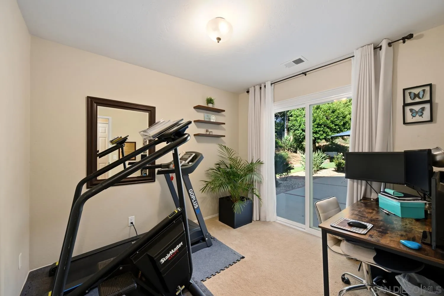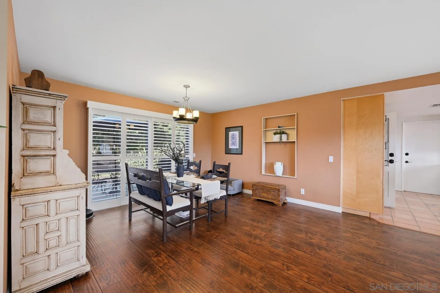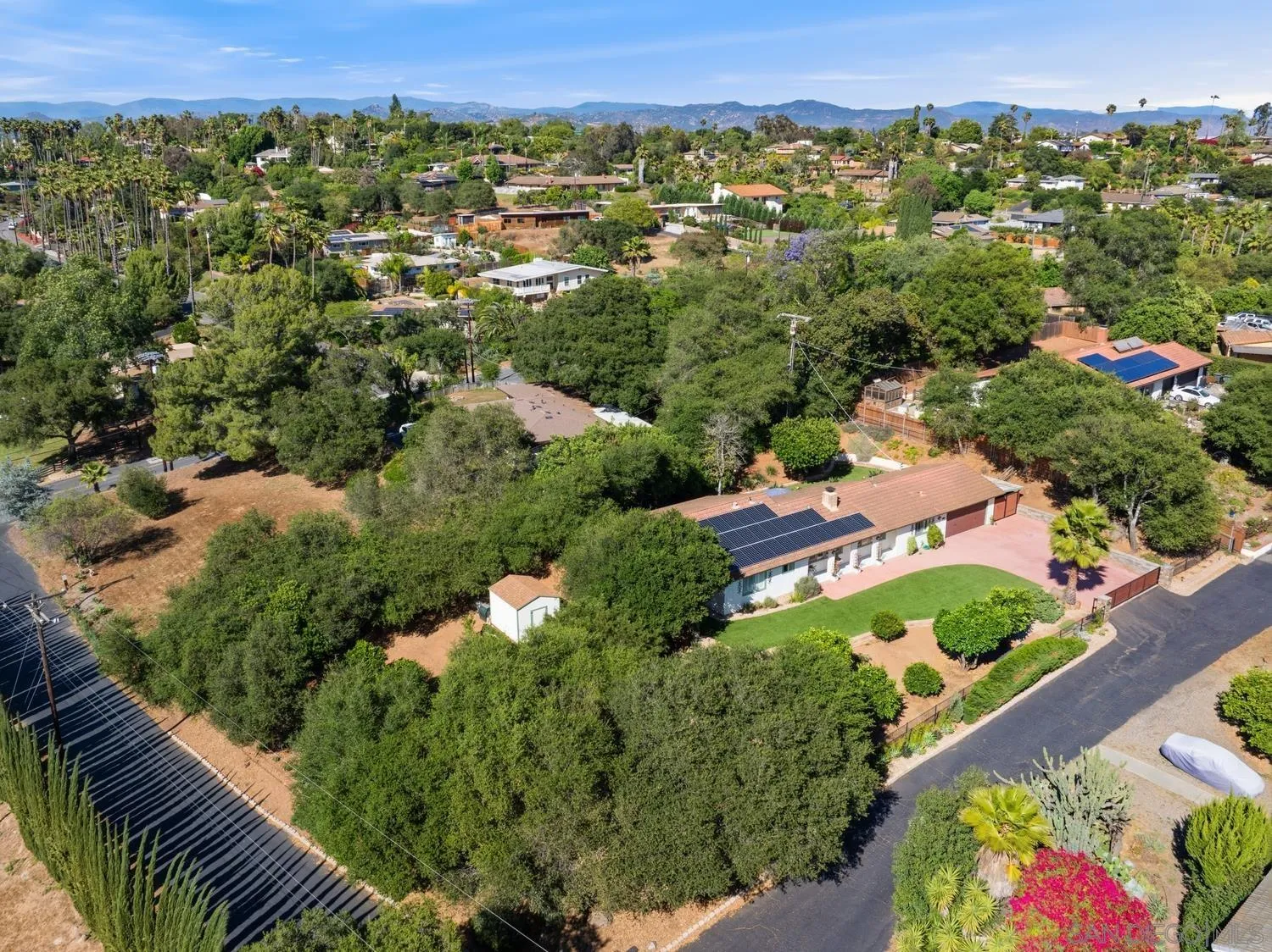 Nestled on a quiet cul-de-sac on a sprawling 0.71-acre fully gated corner lot, this beautifully updated single-story home offers exceptional privacy. From the moment you arrive, you're welcomed by charming wood beam accents, an open and airy floor plan, elegant shuttered windows, and stunning flooring that flows throughout. The expansive living area is the heart of the home, featuring a striking dual-sided brick fireplace with hearth that seamlessly connects to the dining space, perfect for both relaxing and entertaining. The remodeled kitchen impresses with granite countertops, a breakfast bar, and modern cabinetry, providing abundant storage. A separate laundry room adds convenience, offering extra storage and direct access to the backyard. The flexible layout includes two spacious bedrooms plus a dedicated office, easily convertible into a third bedroom. The generous primary suite features an updated bathroom and a walk-in closet for added comfort. Outside, you’ll find a private backyard retreat complete with organic fruit trees, low-maintenance landscaping, a large patio, turf, and shade trees. There’s ample space to garden, entertain, or create your own outdoor oasis—with plenty of room for a future ADU. The side yard provides space for RV or boat parking and easy backyard access. Additional highlights include owned solar, enhancing energy efficiency and long-term savings. With an attached two-car garage and a prime location just blocks from Felicita Park with its scenic trails and green spaces, this home perfectly blends comfort, functionality, and natural beauty.