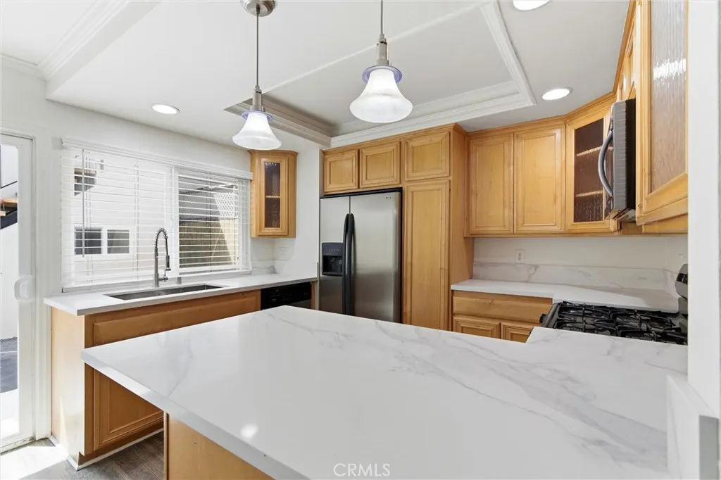 Welcome to Chateau Blanc, where comfort, space, and opportunity come together in one of Fountain Valleys most desirable communities. This 4 bedroom, 3.5 bath (with studio) townhome offers the kind of layout that just feels right from the moment you walk in. Wide plank luxury vinyl flooring, fresh paint, and an abundance of natural light create a clean, inviting space that is both move in ready and easy to make your own. The updated kitchen features upgraded cabinetry, brand new quartz countertops, and a functional layout complete with a gas range, microwave, and dishwasher, all opening seamlessly to your dining and living areas. Upstairs, the primary suite features a walk-in closet and private bath, while the additional bedrooms provide flexibility for family, guests, or a home office. But what truly sets this home apart is the detached studio apartment above the garage, a rare and valuable bonus. Complete with its own bathroom, closet, and space for a kitchenette, this separate living area is currently generating $1,400 per month in rental income. Whether you continue to rent it, use it as a private guest suite, or create a dedicated work-from-home space, it opens the door to real financial flexibility. Step outside to your sunny private patio, which leads directly to the two-car garage with washer and dryer hookups, creating that ideal indoor-outdoor California flow. And just beyond your front door, enjoy a peaceful greenbelt setting along with resort-style amenities including a community pool and spa, tennis courts, and play areas. This is more than just a home, its a sm