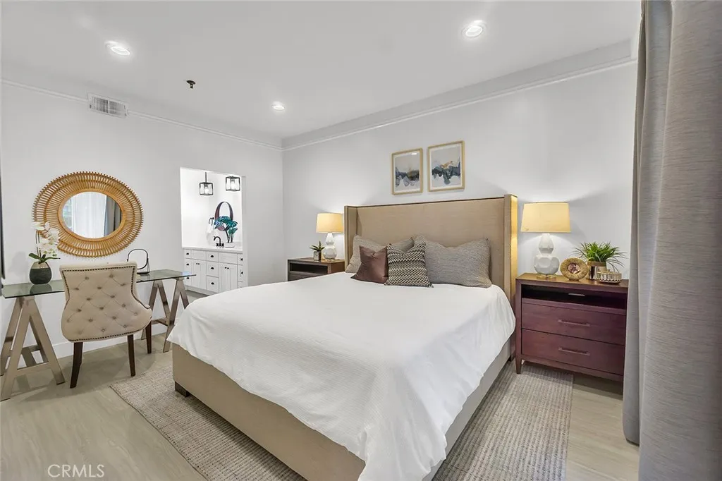 Charming Garden Grove Condo! Located in the desirable gated community of Greenbrier Terrace, this single-level 2-bedroom, 2-bathroom home offers 1,057 square feet of comfortable living space and is truly move-in ready. Enjoy access to resort-style amenities, including a heated pool and spa. Step inside to find smooth-finish walls, LED recessed lighting, and a bright, open layout that seamlessly connects the dining and family rooms. The spacious kitchen is thoughtfully appointed with a white subway tile backsplash, quartz countertops, newer stainless steel appliances, a gas stove, deep pantry, and a pass-through window to the living areaperfect for entertaining. A laundry area with an electric dryer is conveniently located just off the kitchen. The primary bedroom is generous in size and features a large walk-in closet, double-sink vanity, and a spacious shower area. The second bedroom is ideally situated on the opposite side of the condo, adjacent to the updated hall bathroom, which includes a new, larger vanity. Additional highlights include central HVAC, private covered parking, and a detached 2-car garage with extra storage. The home also offers a high level of privacy, both indoors and out, and includes a private patio for relaxing or entertaining. Dont miss this opportunity to own a beautifully maintained home in a tranquil community, close to local shopping, dining, and freeway access!