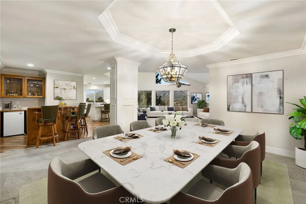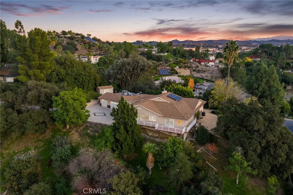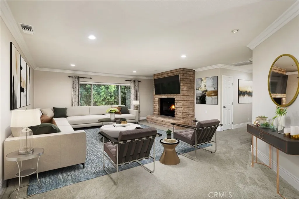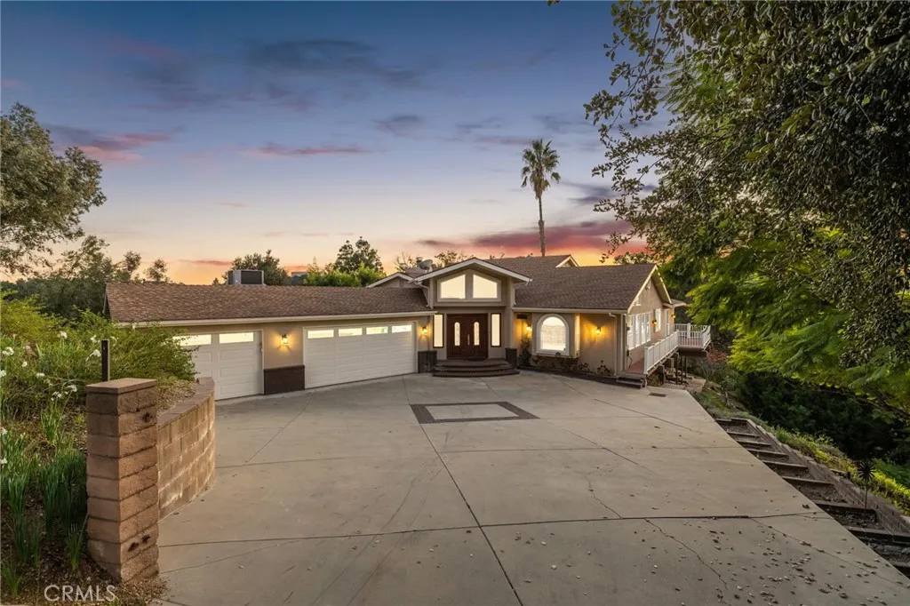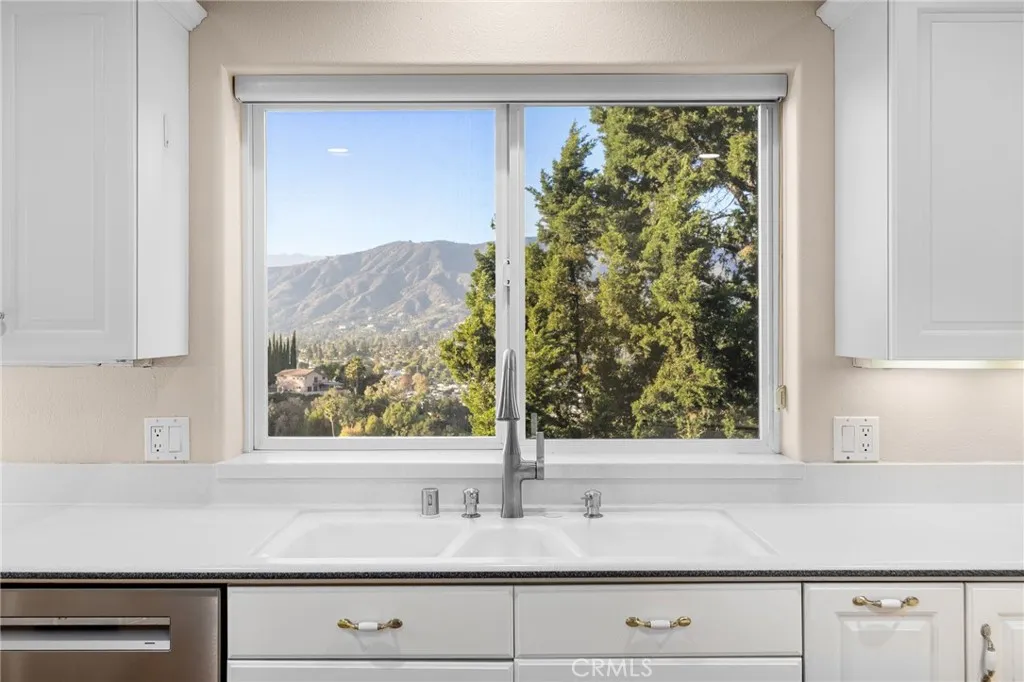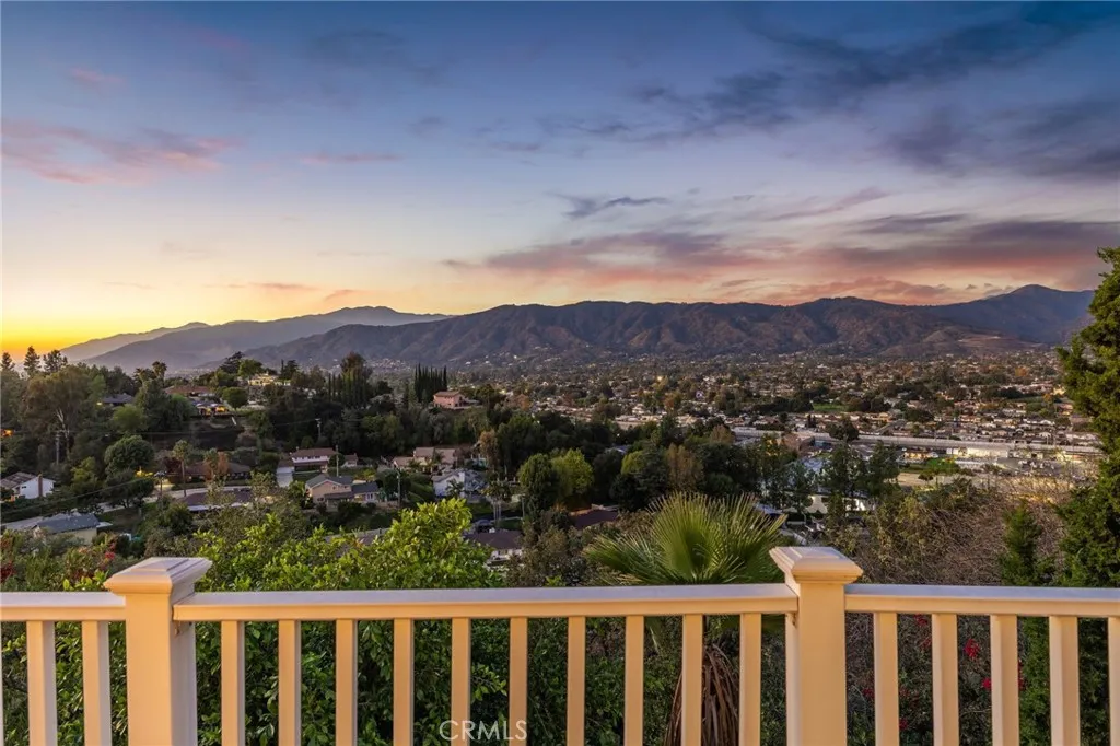 Updated Single-Story Home with Panoramic Mountain Views. Nestled on a secluded hillside lot with ultimate privacy, this beautifully updated single-story residence is accessed via a long, private driveway that opens to an extra-wide front motor court. Double wood-and-glass entry doors welcome you into a bright foyer with tile flooring that flows seamlessly into the expansive open-concept living areas. The dramatic family room showcases vaulted ceilings, a wall of picture windows framing sweeping mountain views, a bay window overlooking the front yard, and complete openness to kitchen. The kitchen features classic white shaker cabinetry, stainless steel appliances, recessed lighting, hardwood flooring, and a peninsula with casual countertop seating. Adjacent to the family room is a well appointed wet bar equipped with a sink, under-counter refrigerator, glass-front upper cabinets, and a curved radius counter perfect sitting and entertaining. The formal living room serves as a stunning focal point with its floor-to-ceiling Roman-brick fireplace and raised hearth, recessed lighting, elegant crown molding, and an expansive picture window. A versatile bonus room (easily convertible to a fourth bedroom) includes a dry bar that could be transformed into a kitchenette, crown molding, and sliding glass doors opening to the backyard. Down the hallway, the generously sized primary suite offers carpeting, direct access to a private balcony showcasing beautiful mountain views. The primary bathroom includes a glass-enclosed walk-in shower, a soaking tub with marble surround, dual-sink wit
