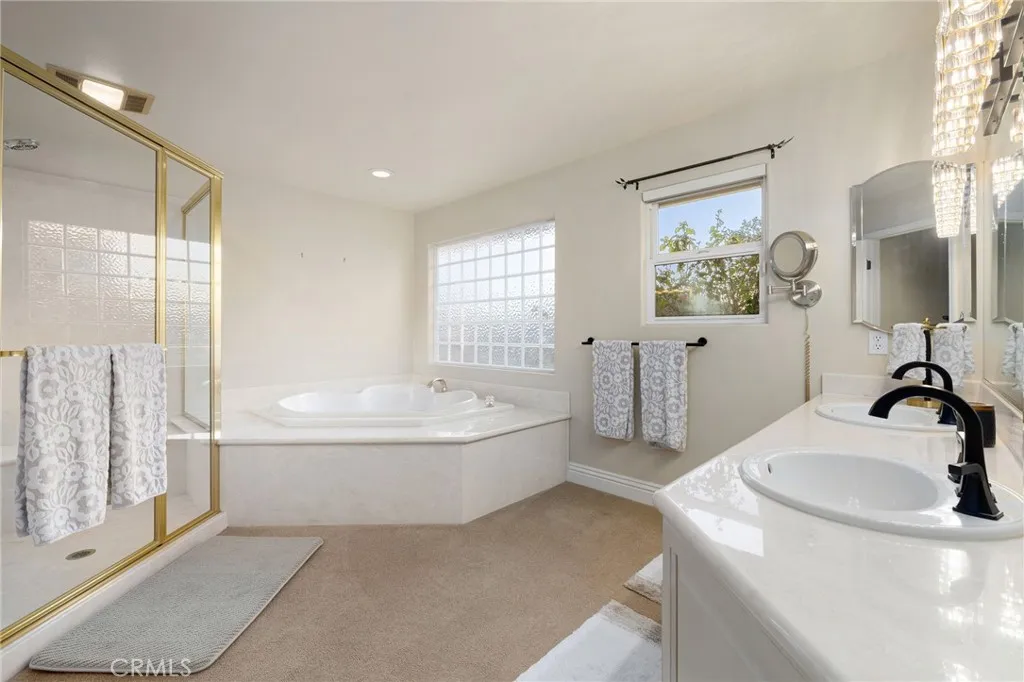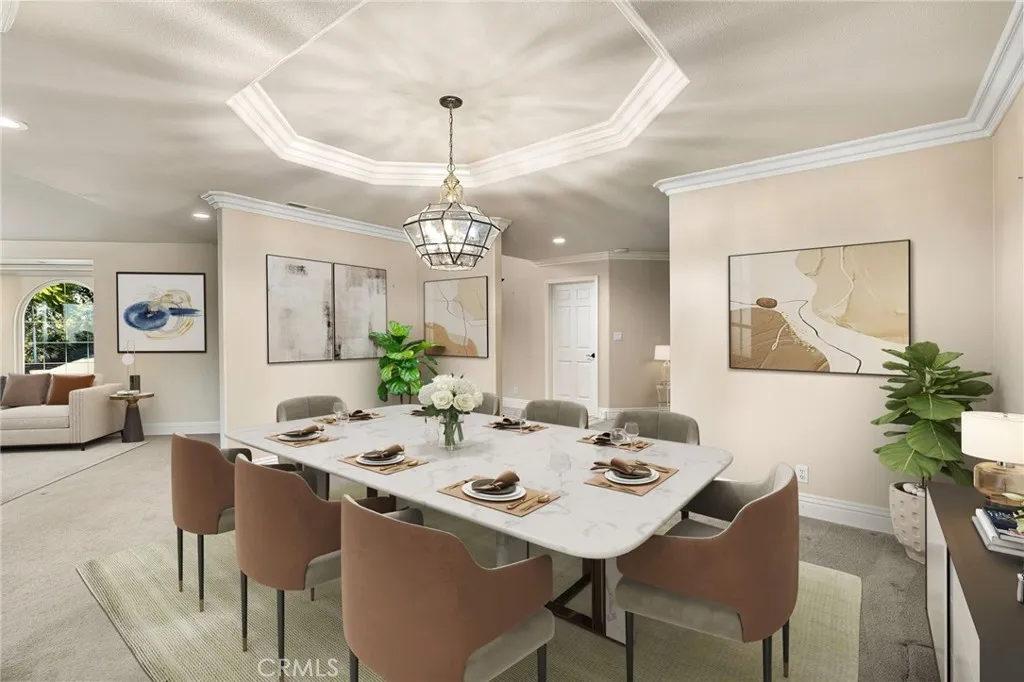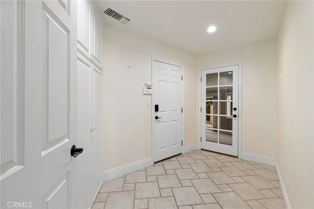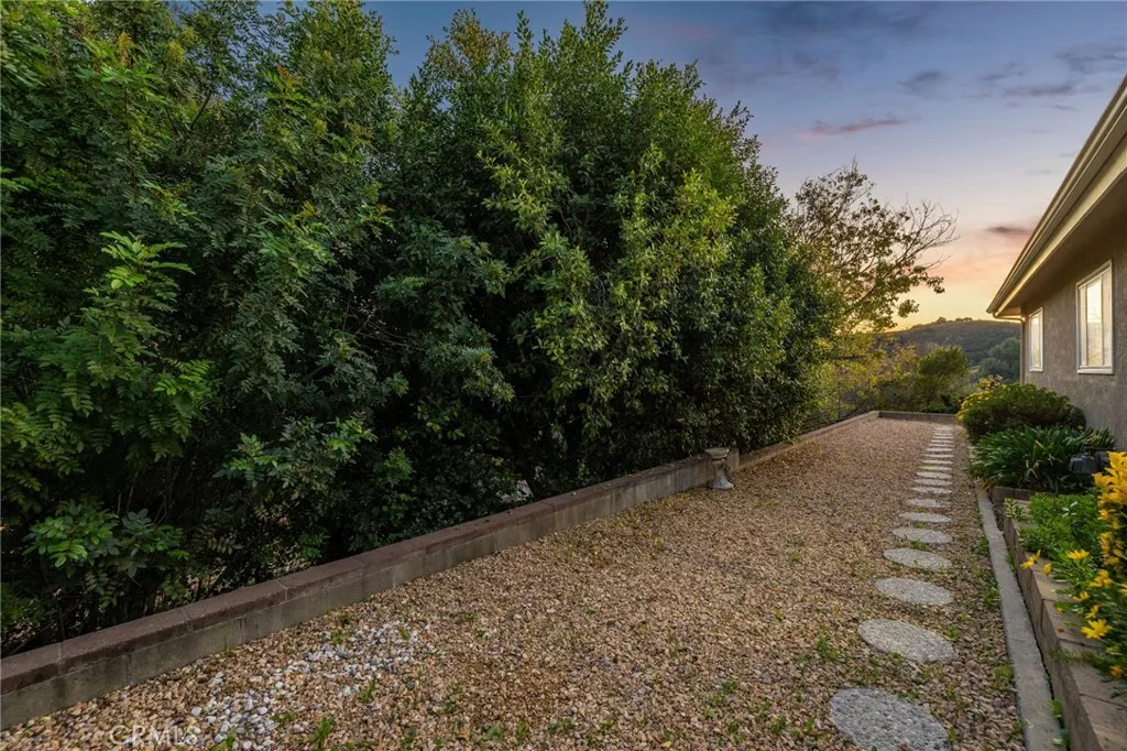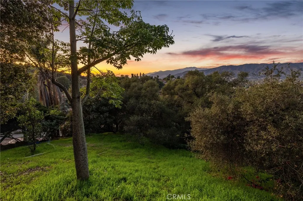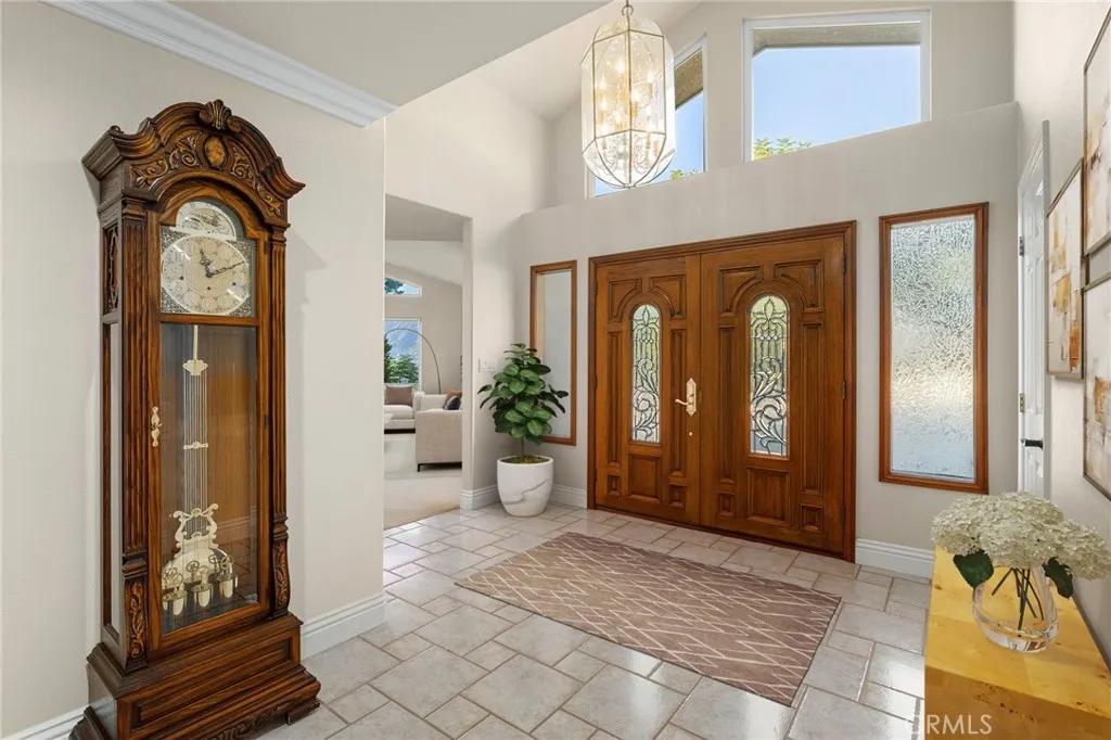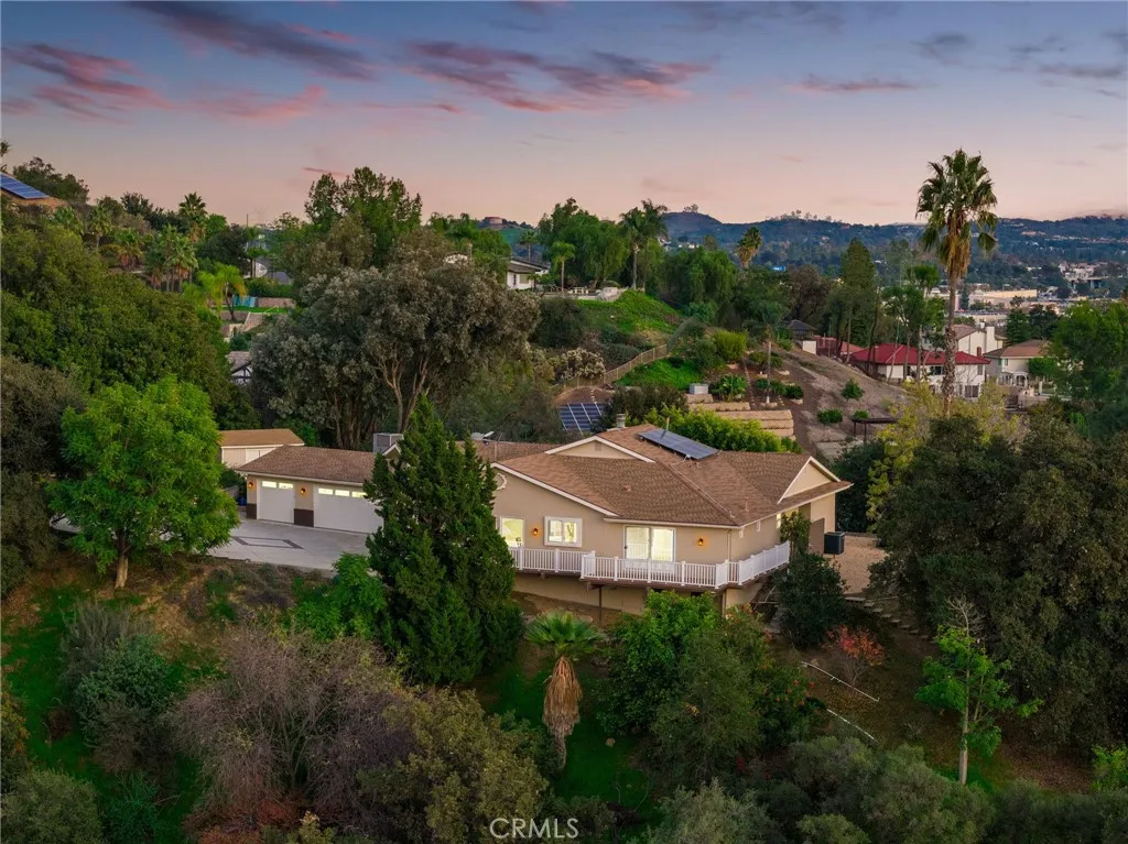 Updated Single-Story Home with Panoramic Mountain Views. Nestled on a secluded hillside lot with ultimate privacy, this beautifully updated single-story residence is accessed via a long, private driveway that opens to an extra-wide front motor court. Double wood-and-glass entry doors welcome you into a bright foyer with tile flooring that flows seamlessly into the expansive open-concept living areas. The dramatic family room showcases vaulted ceilings, a wall of picture windows framing sweeping mountain views, a bay window overlooking the front yard, and complete openness to kitchen. The kitchen features classic white shaker cabinetry, stainless steel appliances, recessed lighting, hardwood flooring, and a peninsula with casual countertop seating. Adjacent to the family room is a well appointed wet bar equipped with a sink, under-counter refrigerator, glass-front upper cabinets, and a curved radius counter perfect sitting and entertaining. The formal living room serves as a stunning focal point with its floor-to-ceiling Roman-brick fireplace and raised hearth, recessed lighting, elegant crown molding, and an expansive picture window. A versatile bonus room (easily convertible to a fourth bedroom) includes a dry bar that could be transformed into a kitchenette, crown molding, and sliding glass doors opening to the backyard. Down the hallway, the generously sized primary suite offers carpeting, direct access to a private balcony showcasing beautiful mountain views. The primary bathroom includes a glass-enclosed walk-in shower, a soaking tub with marble surround, dual-sink wit