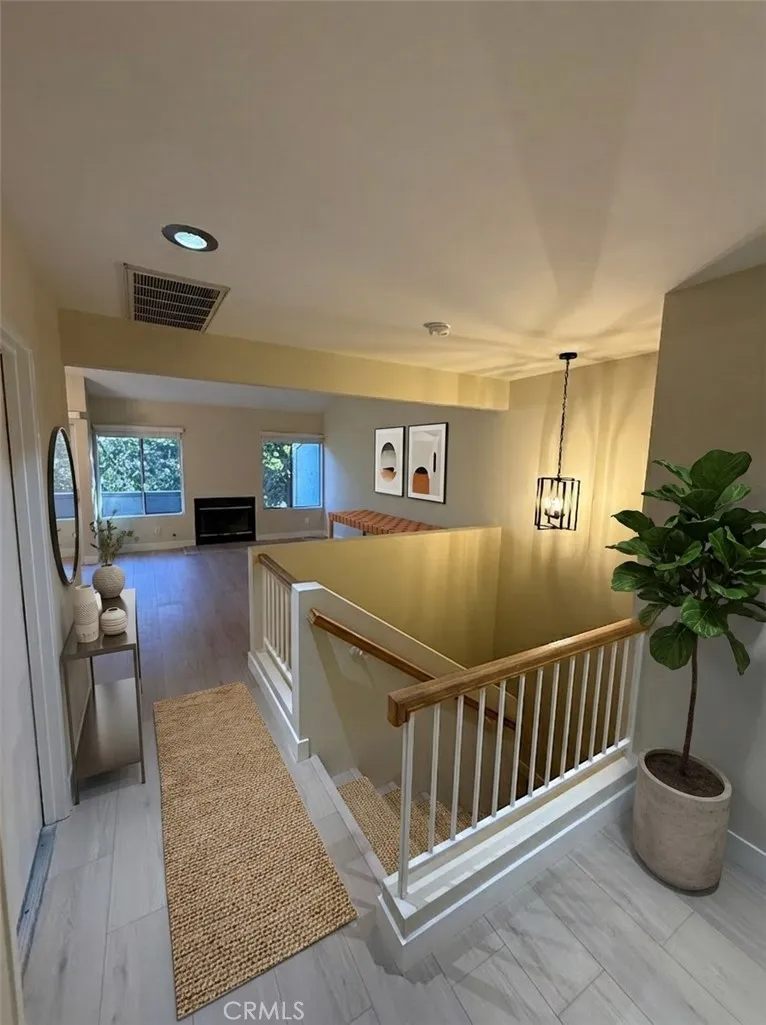This spacious Granada Hills townhome offers a unique floor plan featuring three bedrooms on the lower level. The entrance is marked by a private patio leading into a formal entryway with new flooring that extends throughout the home. The main level includes a generous living room with a fireplace and a formal dining area with high ceilings. The kitchen provides ample cabinet and counter space, along with an additional dining area. Upstairs, you will find a guest bathroom and significant storage space. The downstairs level houses three spacious bedrooms. The primary bedroom and first guest bedroom both offer access to a long private patio. The primary suite includes extensive closet space and a private bathroom, while a full bathroom serves the other downstairs rooms. Additional features include laundry hookups in the attached two-car garage. The well-maintained HOA community offers beautiful landscaping, a pool, and a spa, with convenient access to nearby freeways.