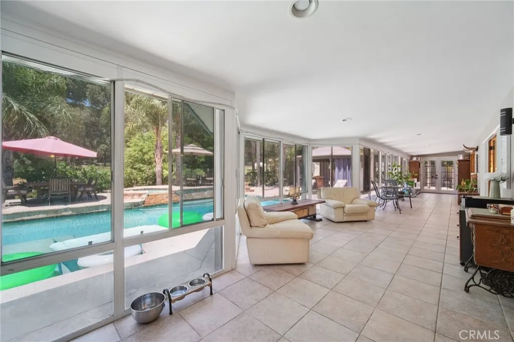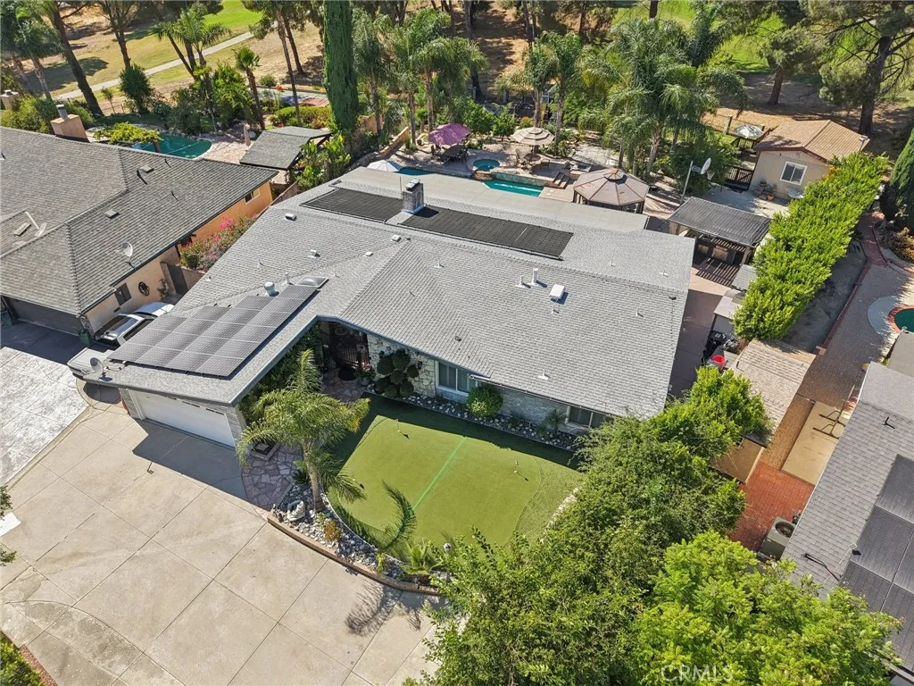 Welcome to 16857 Colven Rd, a beautifully upgraded and private Granada Hills retreat nestled on a rare 20,564 sq ft flag lot backing directly to the 14th tee box of Knollwood Country Club Golf Course. This 3-bedroom, 2.5-bathroom home measures approximately 2,516 sq ft of interior living space, with an additional 545+/- sq ft sunroom and 300+ sq ft pool house with bathroomideal as a guest retreat, studio, or flex space. It may be different from public records. Buyer to verify permit status and square footage. Upgrades include vaulted ceilings, recessed lighting, tiled floors, Marvin Windows with Plantation Shutters, a 60' glass-enclosed sunroom, and a finished garage with insulation, drywall, and recessed lighting. A tankless water heater ensures comfort and efficiency, and a 2021 mini-split system provides zoned cooling. Paid-off solar panels (installed in 2015) offer long-term energy savings. The property is accessed via a 160' private driveway leading to a sprawling ranch-style home. The front yard features custom lighting, fountains, ample parking, and a 320 sq. ft. 4-hole putting green. A custom wrought iron gate secures the front porch, blending curb appeal with peace of mind. The remodeled kitchen boasts rich cabinetry, a two-level granite island, tile floors, a garden window, and recessed lighting. It opens to a spacious den, and a solid wood French door connects to the west patio. The sunroom features tinted windows, recessed lighting, and French doors on both sides, plus two 10 Longview sliders and a 13 Marvin wood-clad French door. The primary suite offers tiled