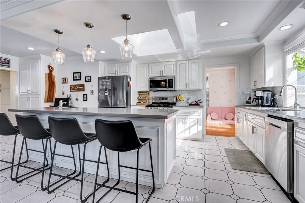 Welcome to this beautifully updated home situated in the coveted Harbor Pines! This charming property is flooded with natural light and offers an inviting living space with a functional floorplan. Step inside to the spacious foyer welcoming you with gleaming hardwood floors and recessed lighting. Currently being used as a kids play area and formal dining - personalize this space to make it your own! The upgraded kitchen offers an open concept with quartz countertops, stainless appliances, and ample cabinetry throughout. The centerpiece of the home, the oversized kitchen island, offers a convenient breakfast bar and seamlessly connects the kitchen and living room for easy entertaining. Primary bedroom offers hardwood floors, built-in closet organizer, and a generous size bathroom with a dual sink vanity and jacuzzi tub. Huge backyard with endless potential. Timed sprinklers keep the grass maintained with ease, the large patio offers a built-in bbq island, and the garden beds yield seasonal vegetables. The space is perfect for entertaining, relaxing evenings, or family gatherings. Impressive bonus room off the garage with a closet! This flex space is perfect for a home office, gym, or third bedroom. Additional features include HVAC with wifi thermostat, security cameras, long driveway, and detached two-car garage with epoxy resin floor. This charming neighborhood is located conveniently to parks, dining, & freeways. Truly move-in ready and waiting for its next owner.