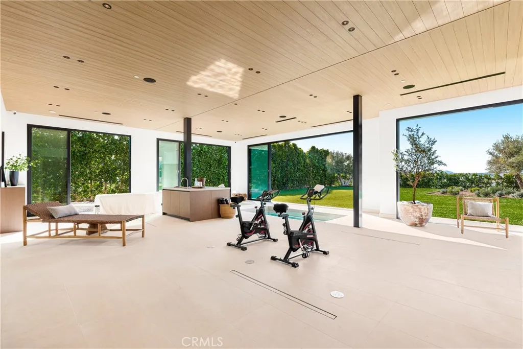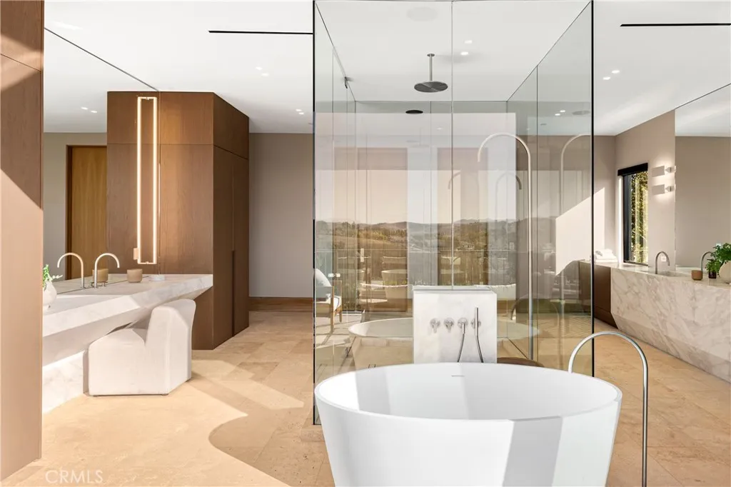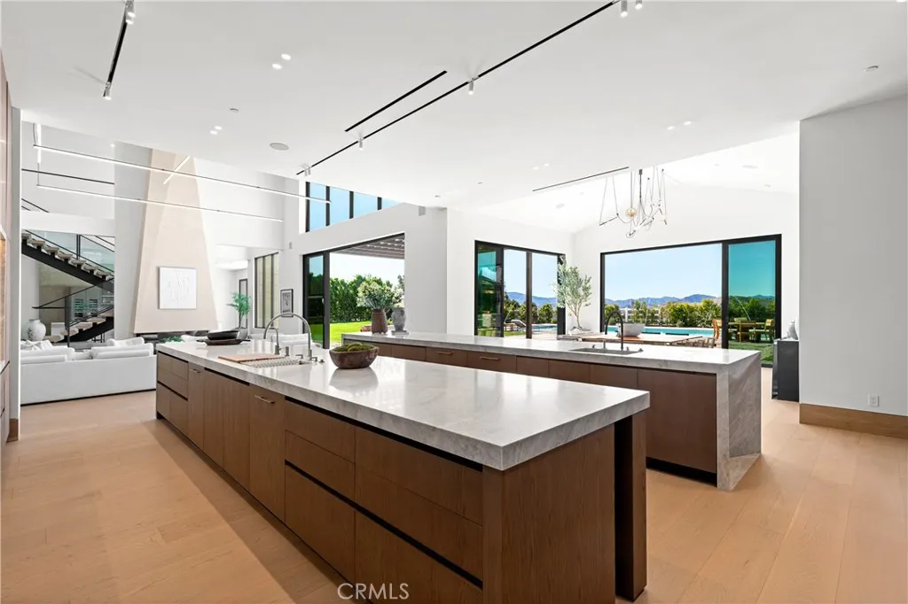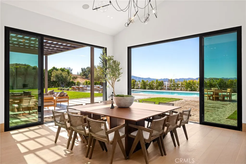 Completed in 2025, this stunning custom estate is sited in the prime Ashley Ridge section of Hidden Hills and features panoramic pastoral & sunset views! Sited on a beautiful, almost all flat 1.2-acre lot, this home offers a rare blend of modern elegance & timeless design. Spanning approximately 14,850' of luxury living space, highlights of the sunny, open floor plan include soaring ceilings & sliding walls of glass that open to the private & spacious grounds, plus a beautiful chef's kitchen with two islands & counter seating, a separate full prep kitchen, big breakfast room, spacious family room with an artistic fireplace, entertainer's lounge with wet bar, formal dining room, custom office, media room, and a truly amazing, glass encased gym with steam, sauna, indoor spa and cold plunge! There are five bedrooms in the main house, including the gorgeous primary suite with all stone bath, two superb, oversize walk-in closets and a walk-out balcony showcasing the endless sunset views. There is also a separate two bedroom and two bath guest house complete with a full kitchen, plus there is approval for a future barn if desired. The superbly private grounds offer loads of off-street parking, a sparkling pool with fountains and large adjoining spa, a full barbecue center, lush grassy areas, mature trees, and wide-open pastoral and sunset views. Located conveniently close to the highly rated public & private schools, excellent local restaurants, and the nearby beaches of Malibu, this beautifully built home has much to offer. **The home is also available for lease at $95,000 per m