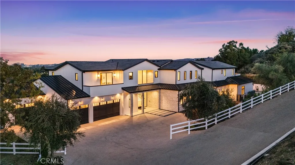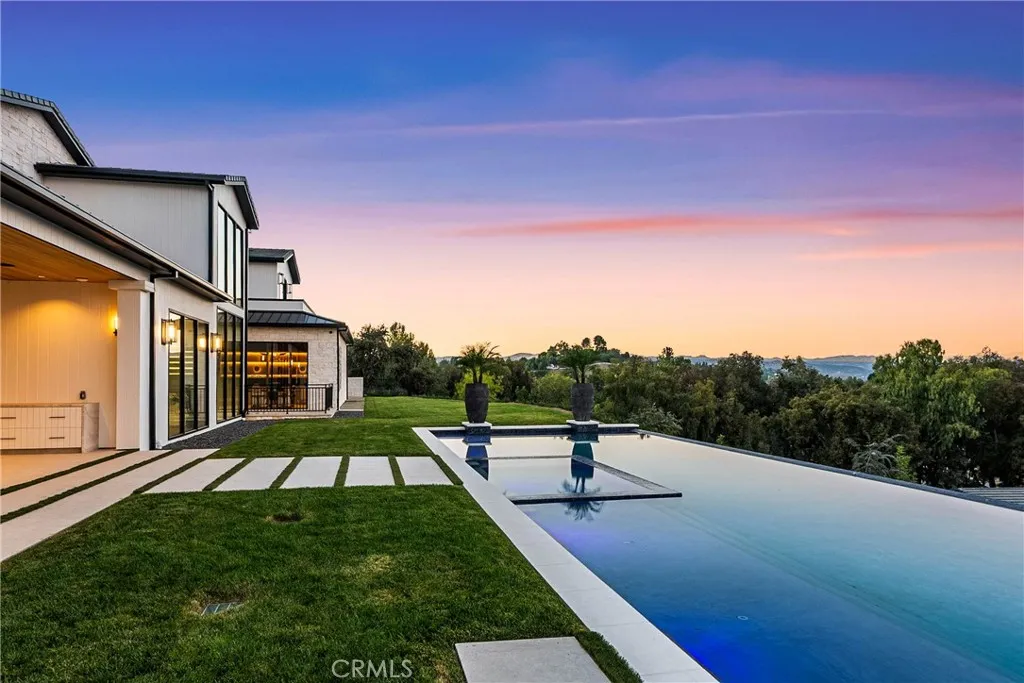 Panoramic views and curated design define this gorgeous, newly constructed estate, nestled at the end of a quiet cul de sac and sited on a large private lot within the guard-gated community of Hidden Hills. Perfectly positioned to capture the sweeping pastoral and city light views, this custom-built residence delivers a seamless blend of elevated architecture and indoor-outdoor living. The sunny, open floor plan centers around a stunning chef's kitchen with oversized island, prep kitchen, and counter seating that flows into the dramatic great room, anchored by a two-sided fireplace & sliding walls of glass that frame the endless views. Designed for grand scale entertaining and everyday comfort, the home features a spacious game and recreation room, custom home office, dedicated wellness wing with gym, steam room & sauna, a plush home theater with fabric covered walls, a sleek lounge with wet bar, and a glass encased, refrigerated wine cellar. Both levels include an additional den or flex spaces, and all six ensuite bedrooms are thoughtfully designed, connected by a floating architectural staircase and serviced by an elevator. The luxurious primary suite is a true retreat, complete with fireplace, stone-wrapped spa bath with steam shower, boutique sized custom closet, and a large, wraparound balcony with commanding views. The estate comprises four distinct structures. In addition to the main residence, which includes garages for seven cars with custom epoxy floors, the grounds feature a pool pavilion complete with a built-in barbecue and pool bath, a detached 965 square foot