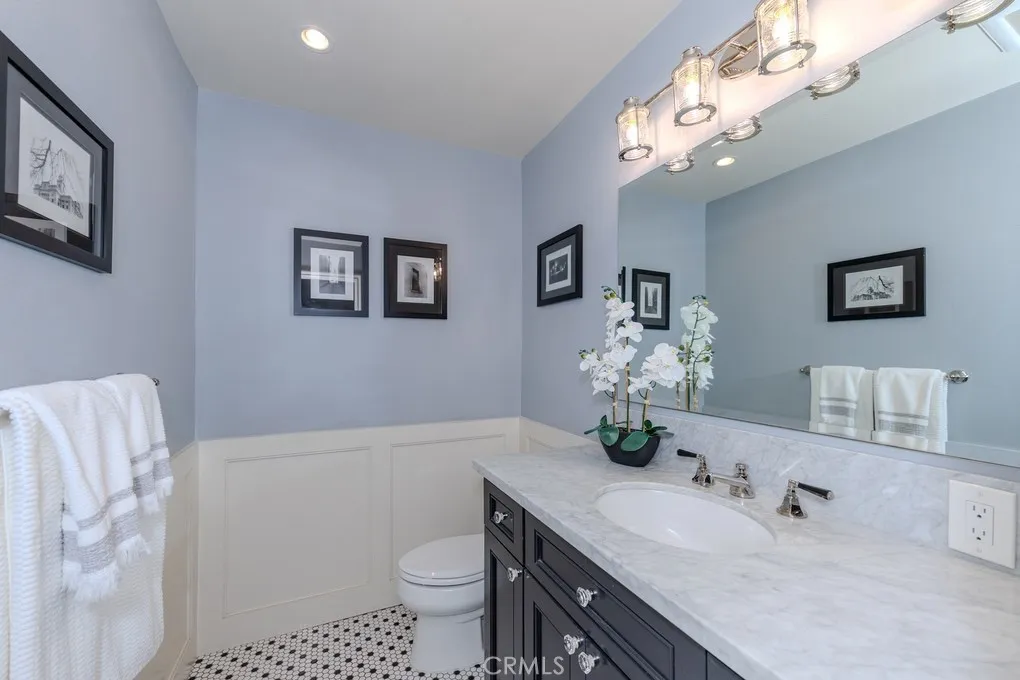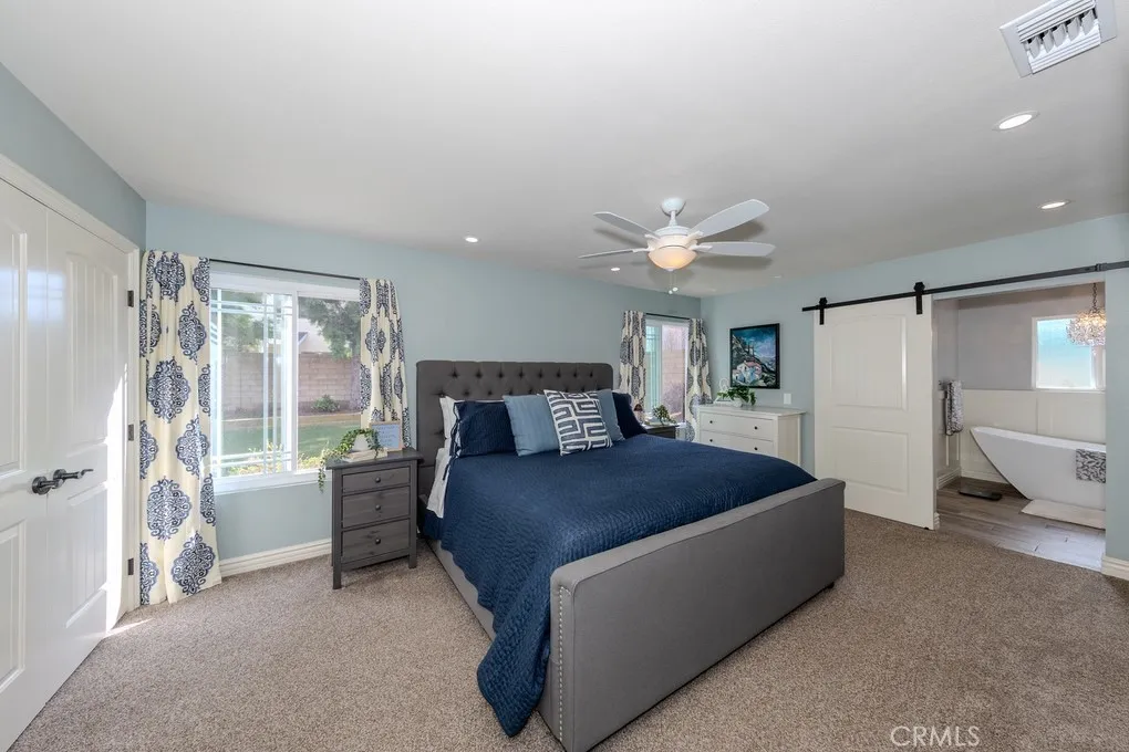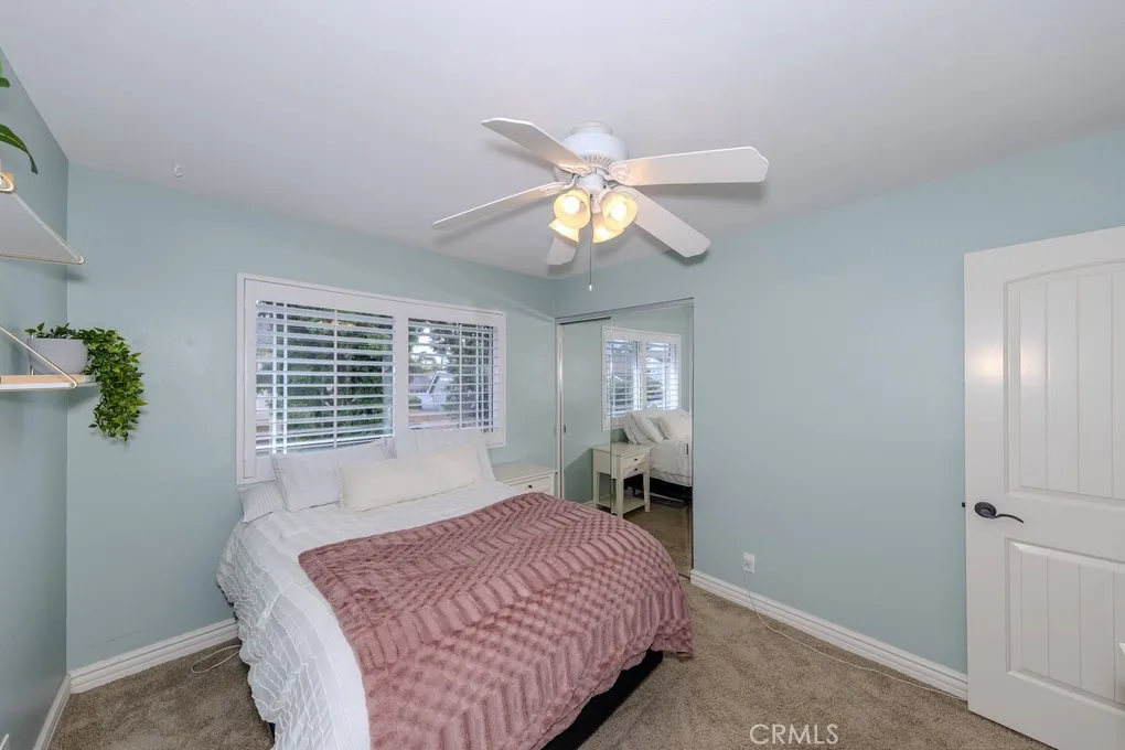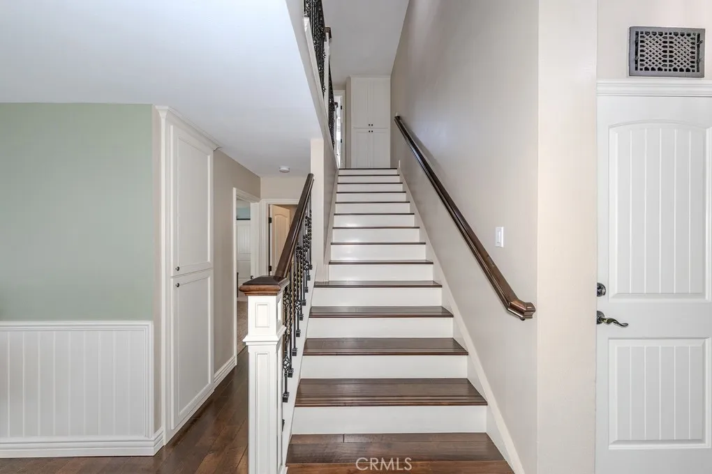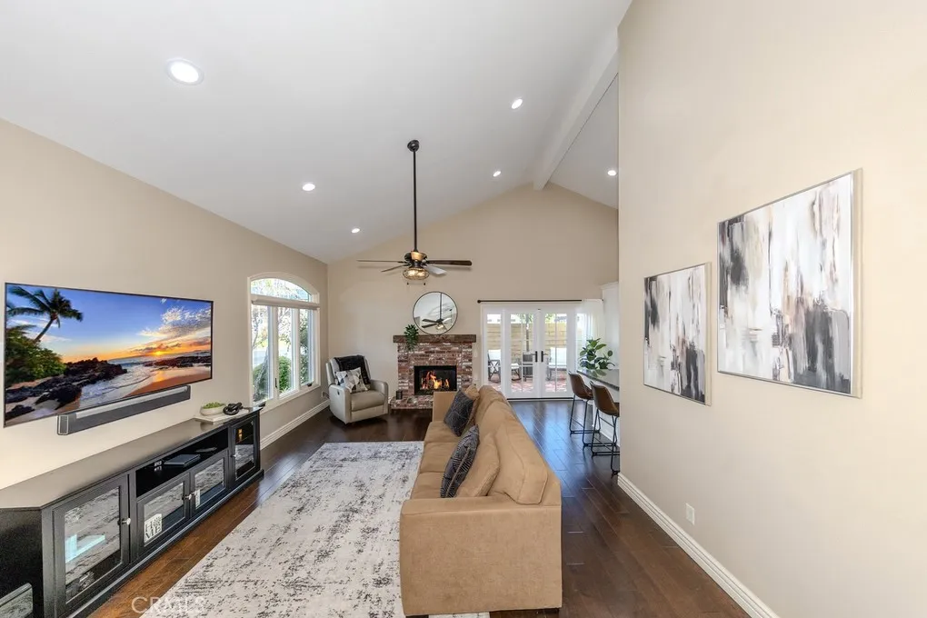 Absolutely turnkey home situated on a premium interior corner lot in the highly sought-after Landmark Tract. From the moment you arrive, the beautiful curb appeal and meticulously landscaped front yard make a lasting impression. Step inside and youre greeted by soaring cathedral ceilings in the bright, open living room, featuring an abundance of natural light, a custom cozy fireplace, and French doors leading to the charming side patio. The living room flows seamlessly into the beautifully remodeled kitchen, which offers Quartz countertops, soft-close drawers, a custom pantry cabinet, spice rack, built-in wine fridge with wine storage, and backyard-facing windows. The kitchen opens to the spacious family/dining room, complete with a custom built-in workspace featuring cabinetry, a printer drawer, soft-close drawers, and a glass-top desk. Sliding glass doors flood the room with natural light and provide easy access to the backyard patio. A standout feature of this home is the expanded main-floor primary ensuite bedroom, offering both a wardrobe closet and a walk-in closet. The luxurious primary bathroom includes a stand-alone soaking tub beneath a chandelier, a separate walk-in shower with marble seat and shower niche, dual sinks, privacy toilet, and elegant tile flooring. The main floor also includes a fully remodeled guest half bath with custom cabinetry and a marble countertop. Beautiful wood flooring and staircase, accented by a wrought-iron railing with wood handrail. Upstairs, youll find three additional bedrooms, all with shuttered windows & ceiling fans. Two feature