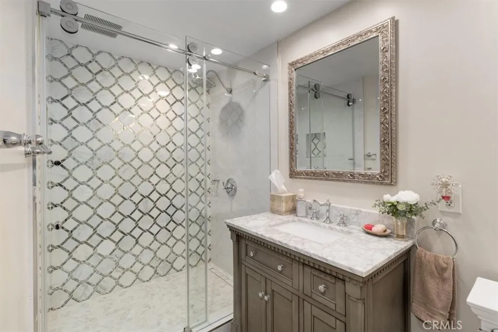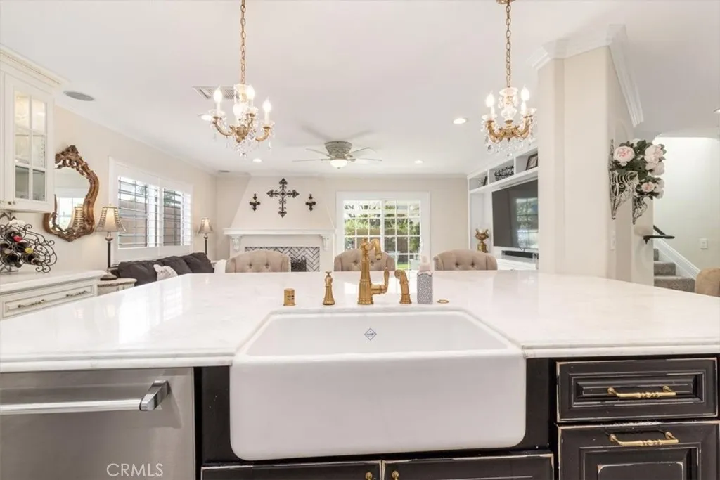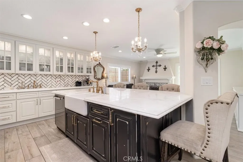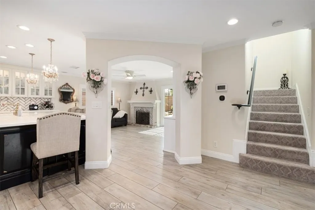 Welcome to this stunning and highly upgraded 5 bedroom, 4 bathroom home featuring an exceptional and rare floor plan with two full bedrooms and two beautifully upgraded bathrooms conveniently located on the main level. This layout provides outstanding flexibility for multi-generational living, extended guests, or the perfect home office setup. Upon entry, you are greeted by an oversized formal living room filled with natural light and elegant finishes, which flows seamlessly into the formal dining room designed for entertaining. Between these two impressive spaces is a custom wine storage and bar area that adds sophistication and enhances the homes entertainment appeal. The gourmet kitchen serves as the true centerpiece of the home, showcasing an oversized marble island, high-end Bertazzoni appliances, white cabinetry, a designer herringbone backsplash and extensive counter and storage space. The kitchen opens directly to the family room, which features one of the homes two fireplaces and creates a warm and inviting atmosphere for everyday living. The main level is finished with beautiful tile wood flooring that enhances both style and durability. Upstairs, the home offers three additional spacious bedrooms, all with comfortable carpeting. The luxurious primary suite includes dual walk-in closets and a resort-style master bathroom complete with a soaking tub, upgraded countertops, high-end materials, and spa-inspired finishes. Every bathroom in the home has been thoughtfully upgraded with premium countertops, stylish tile work, and custom shower designs. Additional features