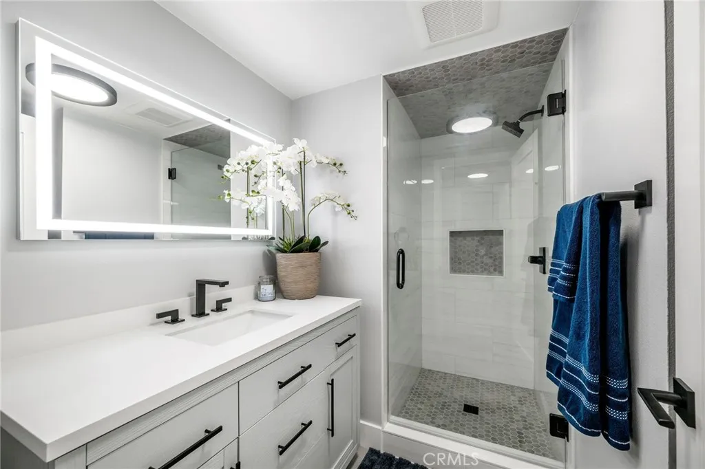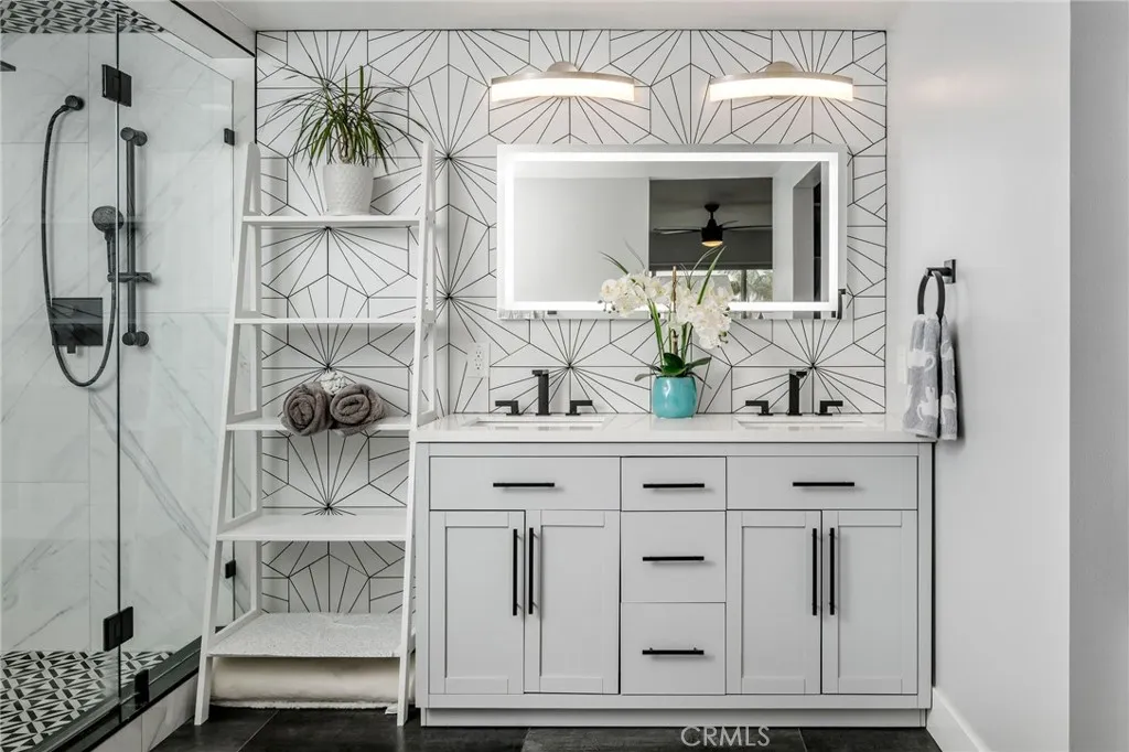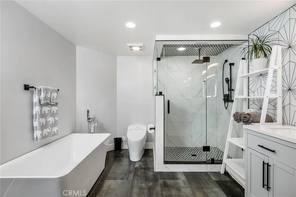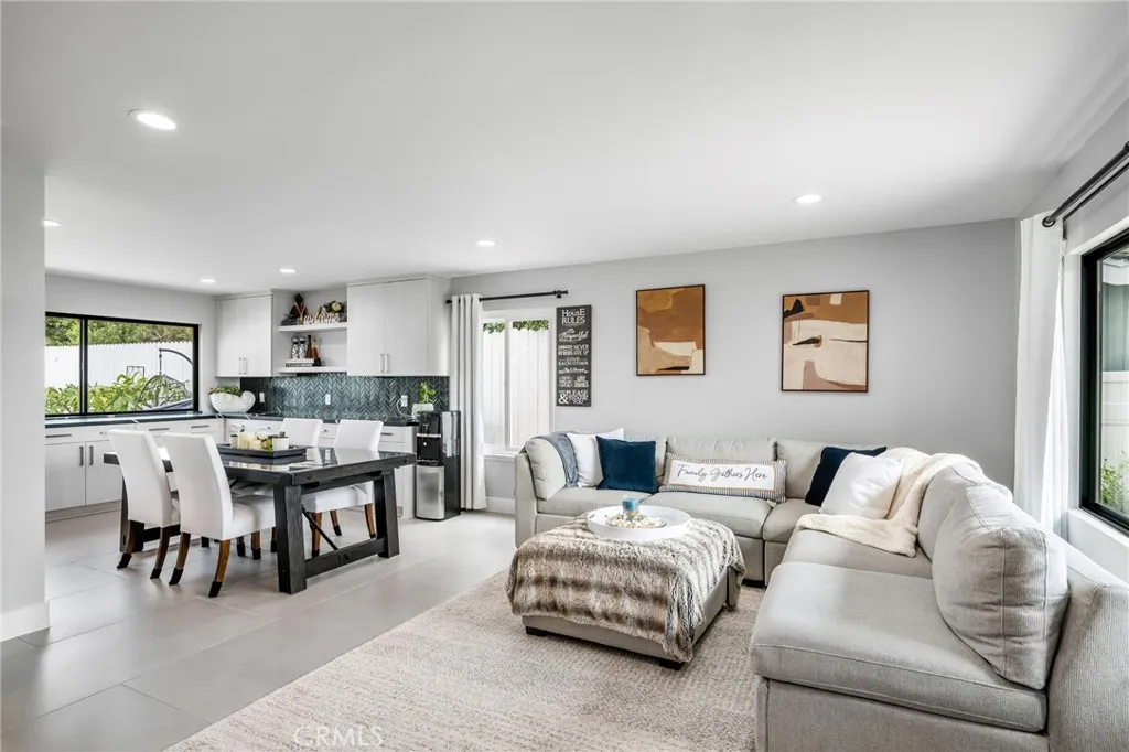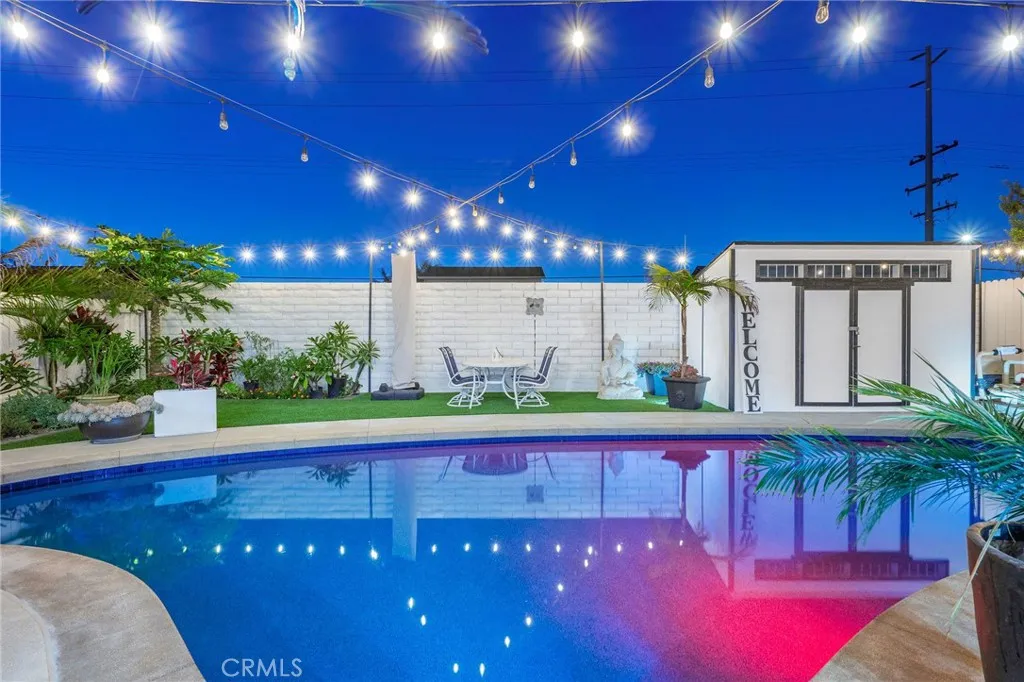Nestled in one of Huntington Beachs most highly sought-after neighborhoods, this beautifully renovated home perfectly blends modern luxury with everyday functionality. Step inside to find a home that feels brand-new, with every detail thoughtfully designed for style, comfort, and entertaining. The elegant entry features a spiral staircase that gracefully separates the formal and casual living spaces. To one side, a light-filled living room welcomes guests; to the other, a cozy family room with a modern gas fireplace wrapped in striking black porcelain tile mirroring the sleek black quartz countertops and backsplash in the adjacent kitchen. The chefs kitchen offers abundant storage and top-of-the-line appliances, including a six-burner range, smart refrigerator, microwave drawer, and a beverage fridge for effortless hosting. Dual sliding glass doors connect the indoor living areas to a private backyard retreat, where a covered patio provides shaded comfort and an inviting space to relax by the newly resurfaced saltwater pool. The pool sparkles with an abalone pebble-tec finish, and all new pool equipment. The artificial turf and updated hardscape keep maintenance to a minimum so weekends are for lounging! One of the best features is the main-level bedroom with a full bath, offering a flexible second primary suite for multi-generational living, or guests. Upstairs, the primary suite is a true sanctuary, featuring a spa-inspired bathroom with a freestanding soaking tub, a walk-in shower, and a large closet. The fifth bedroom is currently open to the primary, making it perfec