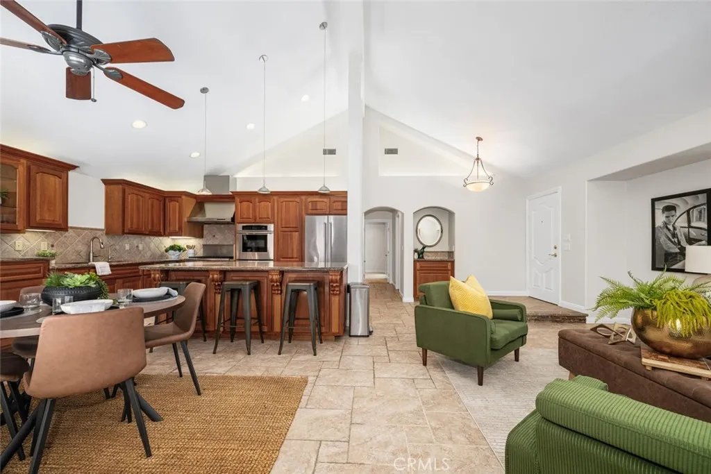 Welcome to this rare single level 2-bedroom, 2-bathroom townhome in the sought-after community of La Cuesta By The Sea. This desirable end-unit has been completely reimagined from its original design, offering a seamless blend of style and functionality. As you enter, youre greeted by soaring vaulted ceilings and expansive tile flooring that flows throughout the Great Room. The spacious living area features a cozy gas fireplace and a beautiful bay window, creating a warm and inviting atmosphere. The kitchen is truly an entertainers dream, showcasing stainless steel appliances including a Thermador gas range with hood vent, double-door refrigerator, double oven, and dishwasher. Custom cherry wood cabinetry and granite countertops add both elegance and practicality, while the oversized islandcomplete with cabinetry on both sidesprovides exceptional storage and workspace. Adjacent to the kitchen, the dining area offers a built-in buffet and sliding glass doors that open to a large backyard patioperfect for enjoying Southern Californias year-round sunshine and indoor-outdoor living. Down the hall, youll find a guest bathroom with a shower and a well-appointed guest bedroom with a ceiling fan. There is also side-by-side washer/dryer in the hall closet. The primary suite has been thoughtfully redesigned to include a private patio, walk-in closet, dual vanities, and a spa-like jetted tub for ultimate relaxation. Additional highlights include an attached 2-car garage with overhead rafters for extra storage, central HVAC, and double-pane windows throughout. Residents also enjoy acce