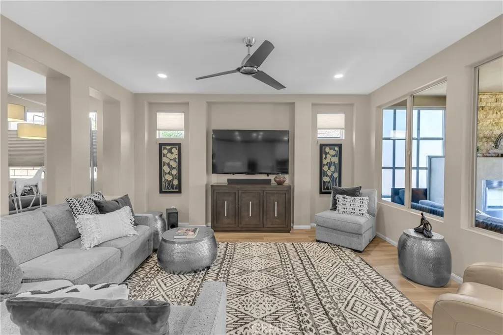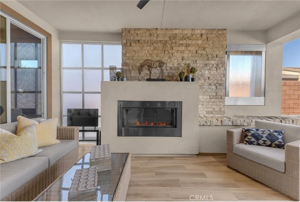 Set on a quiet cul-de-sac, this home offers privacy, smart upgrades, and the relaxed indoor/outdoor lifestyle buyers love at Trilogy Polo. Inside, the main living area features a flexible bonus room perfect for an office, hobby space, or visiting guests. Smart upgrades include top-down bottom-up shades, fans throughout, laundry room built-ins, a water softener, and a finished garage with overhead storage. The open plan kitchen adds everyday convenience with a dedicated wine fridge that makes hosting easy. A full sliding glass wall opens the dining area to a tiled Arizona room with a water-wall feature and built-in fireplace, extending the living space year-round. Outside, a large backyard with a fountain and mature citrus trees delivers a private setting for morning coffee or evening gatherings. The bedrooms are nicely appointed, with the primary suite including an expanded sitting area, walk-in closet, and dual sinks for added convenience. Experience the Trilogy Polo lifestyle! Schedule your private showing today.