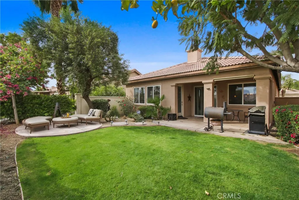TURNKEY, APPROVED for SHORT TERM RENTAL, DIRECT ACCESS TO GREENBELT AND GOLF COMMUNITY! This beautifully 2 bedroom 2 bath home located within the Indian Palms Country Club features a spacious open-floor plan with a great room, gas fireplace, open kitchen, tile floors, high ceilings and a primary bedroom with en-suite bath. The kitchen has plenty of cabinetry, granite countertops, tile backsplash, a center island with seating and built-in appliances. The spacious primary bedroom has a large ensuite bathroom with soaking tub, walk-in shower and walk-in closet. It overlooks a private lush backyard and greenbelt. The large guest bedroom and remodeled bathroom with walk-in shower are perfect for guests. Additionally, the home has a an outdoor covered patio, a spacious backyard with direct access to the greenbelt, automatic sprinkler/drip system and a 2 car garage with an additional golf cart space. The Indian Palms Country Club Community offers amazing amenities such as a golf course, clubhouse, tennis/pickleball/bocce courts, community pool, community spa, gym, showers, fitness classes, restaurant, hotel and ground maintenance/tree trimming. Enjoy the best Indio has to offer located just minutes to hiking trails, casinos, restaurants and Coachella!