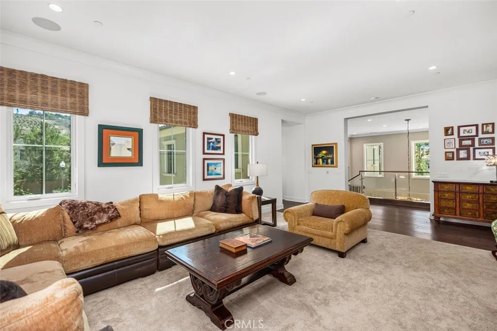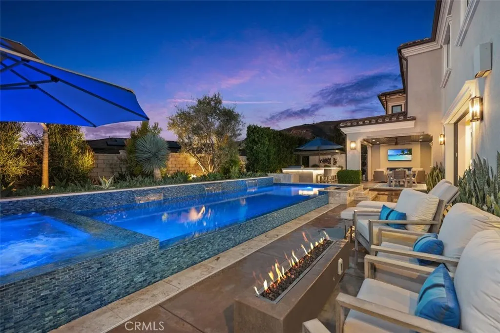 Nestled Amongst Tranquil Avocado Orchards and Rolling Hills, This Extraordinary Alta Vista Residence Embodies the Pinnacle of Modern California Luxury. Perched on an elevated corner lot with commanding hillside views, 116 Knob Creek rests within the exclusive Vistas enclave at The Groves of Orchard Hills. Boasting over $1 million in interior and exterior upgrades, this modern architectural masterpiece blends refined sophistication with effortless indoor-outdoor living. From the moment you arrive, the homes modern interpretation of Spanish Colonial architecture is framed by lush landscaping, citrus trees, and a welcoming pedestrian approach. Inside, more than 6,000 square feet of open-concept living unfolds beneath soaring ceilings, where abundant natural light connects the interiors to serene surroundings. The dramatic foyer introduces a spectacular formal dining room with clerestory windows rising over twenty feet, flanked by dual glass staircases with sleek steel accents. Perfect for entertaining, this grand space opens to a private courtyard with a tranquil wall fountain. The magnificent great room, anchored by a 60-inch stone-clad linear fireplace, flows seamlessly to a resort-style California Room designed for alfresco gatherings. The chefs kitchen is a showpiece appointed with Sub-Zero, Wolf, and Miele appliances, dual integrated refrigerator/freezers, quartz countertops, and custom Genoa cabinetry. Multiple pocket doors dissolve the boundaries between indoor and outdoor spaces, revealing a breathtaking backyard oasis. Outdoors, enjoy a full outdoor kitchen with Lynx
