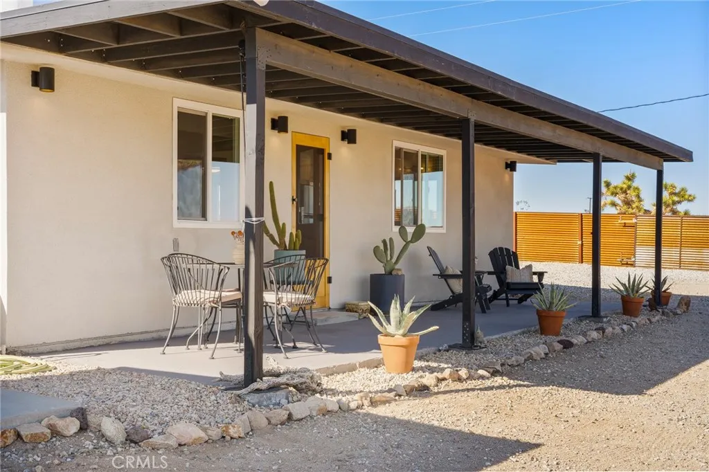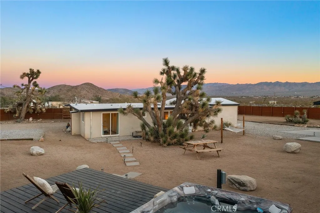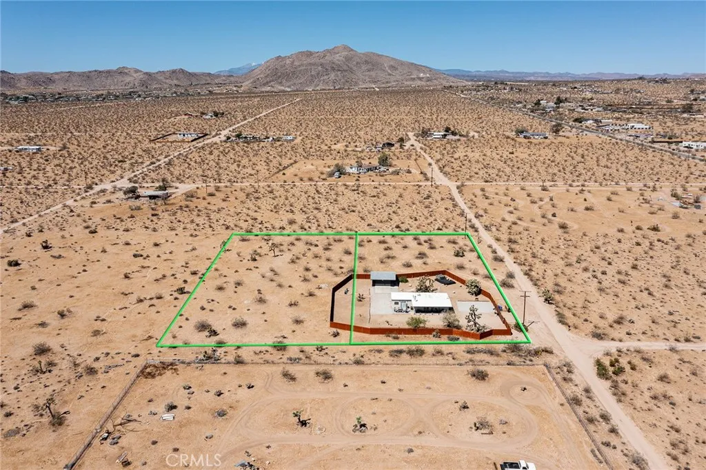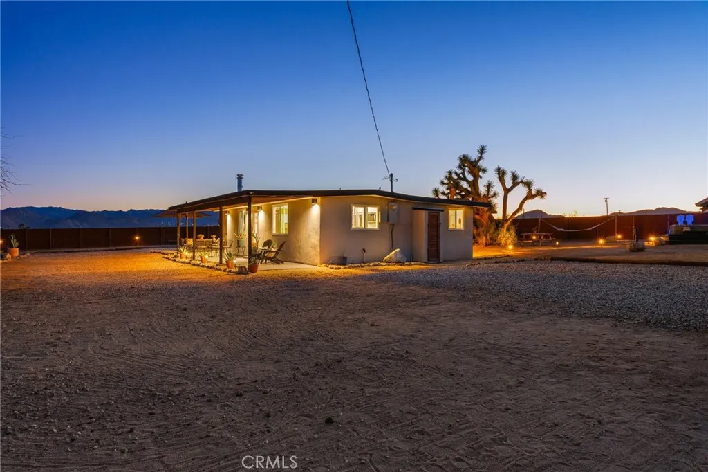 Exceptional Joshua Tree property on 2.5 total acres comprised of two separate legal 1.25-acre parcels, sold together. Located just off a paved road and only minutes from Joshua Tree National Park, this property offers privacy, convenience, and long-term flexibility. The 2-bedroom, 1-bath home features an open-concept layout with polished concrete floors throughout and seamless flow between the living, dining, and kitchen areas. The dining space is anchored by a statement Malm fireplace, adding warmth and architectural character. The kitchen is equipped with a Bertazzoni induction range, while mini-split systems provide efficient year-round heating and cooling. Additional seller improvements include dimmers on all ceiling lights, separated bathroom switches, a checked and labeled electrical panel, and repaired garage wiring. The shaded front porch has been enhanced with a retrofitted awning, repaired porch area, poured concrete step, and custom screen door. Exterior improvements also include stucco repairs and a Eufy security system with five exterior cameras. In the rear, the refurbished oversized deck and large hot tub capture expansive 360-degree desert and National Park views, creating an ideal setting for stargazing, entertaining, and quiet desert living. One parcel is approximately 1 acre fenced with heavy-gauge metal fencing and accessed through a motorized solar-powered gate. Mature desert landscaping, including established Joshua Trees, enhances the setting, and the lot has been cleared of toxic and potentially dangerous cacti and plants. The property is also connec