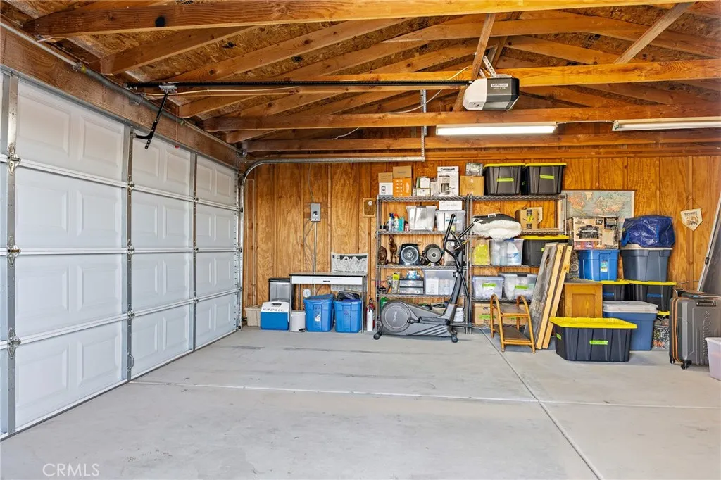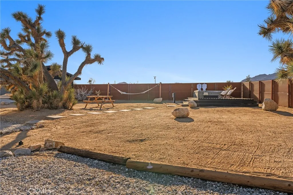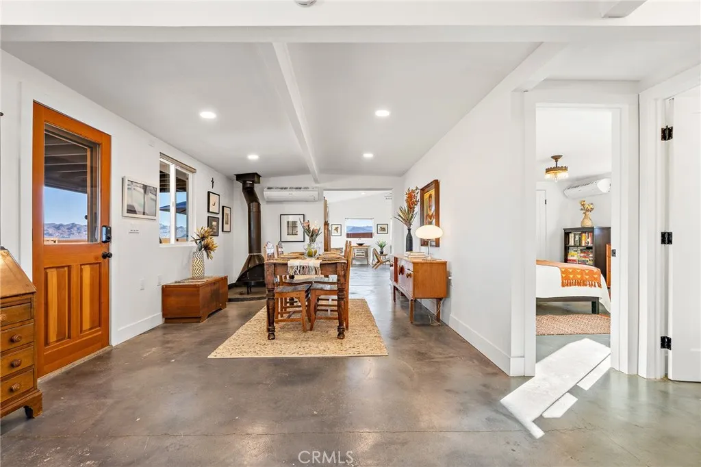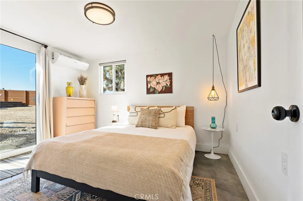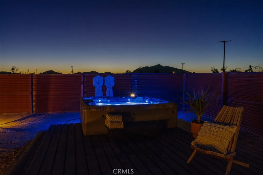 Exceptional Joshua Tree property on 2.5 total acres comprised of two separate legal 1.25-acre parcels, sold together. Located just off a paved road and only minutes from Joshua Tree National Park, this property offers privacy, convenience, and long-term flexibility. The 2-bedroom, 1-bath home features an open-concept layout with polished concrete floors throughout and seamless flow between the living, dining, and kitchen areas. The dining space is anchored by a statement Malm fireplace, adding warmth and architectural character. The kitchen is equipped with a Bertazzoni induction range, while mini-split systems provide efficient year-round heating and cooling. Additional seller improvements include dimmers on all ceiling lights, separated bathroom switches, a checked and labeled electrical panel, and repaired garage wiring. The shaded front porch has been enhanced with a retrofitted awning, repaired porch area, poured concrete step, and custom screen door. Exterior improvements also include stucco repairs and a Eufy security system with five exterior cameras. In the rear, the refurbished oversized deck and large hot tub capture expansive 360-degree desert and National Park views, creating an ideal setting for stargazing, entertaining, and quiet desert living. One parcel is approximately 1 acre fenced with heavy-gauge metal fencing and accessed through a motorized solar-powered gate. Mature desert landscaping, including established Joshua Trees, enhances the setting, and the lot has been cleared of toxic and potentially dangerous cacti and plants. The property is also connec