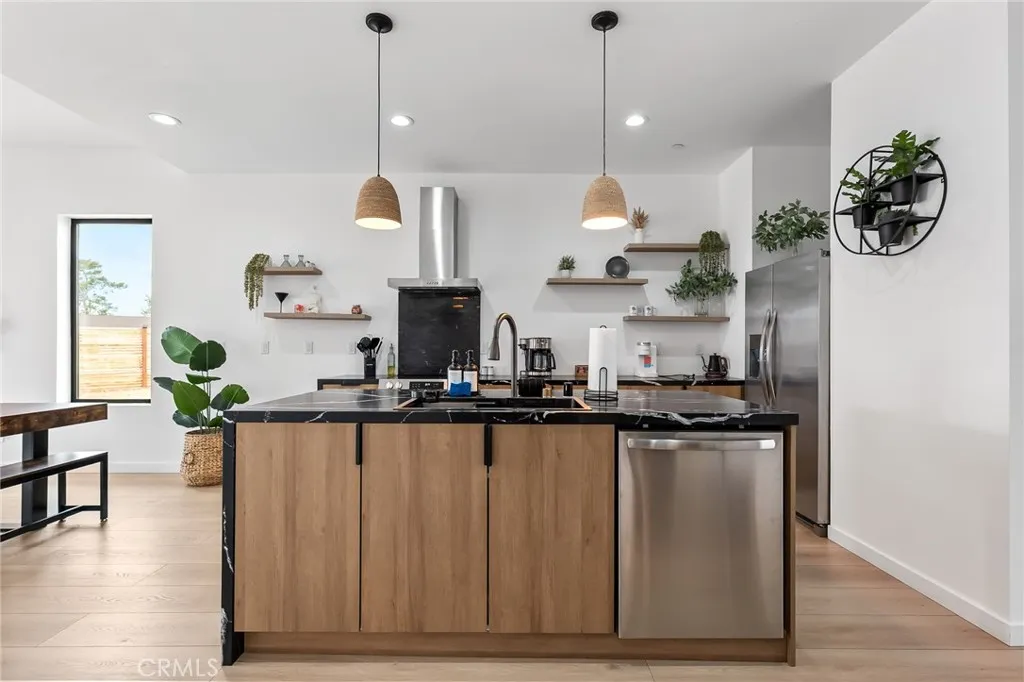 Welcome to Sunfair Palms, a soulful desert sanctuary nestled in the heart of Joshua Tree where modern luxury meets the quiet magic of the high desert. This fully electric home is as efficient as it is enchanting, featuring a paid off 10 kW solar system and a suite of smart home features designed for effortless living. From the moment you step inside, you are greeted by a warm, light filled interior where thoughtful design and natural textures create a sense of calm and connection. The living room is a true showpiece, highlighted by an inviting electric fireplace, a skylight that pours in golden desert light, acoustic accent paneling, recessed lighting, and six stunning glass doors that dissolve the boundary between indoors and out. The kitchen is both elegant and functional, anchored by striking waterfall countertops and a spacious island with sink, complemented by pendant lighting, recessed lights, and modern floating shelves that add a touch of artistic flair. The open dining area flows seamlessly between the kitchen and living room, perfect for gathering and entertaining. Each bedroom serves as a peaceful retreat, complete with mini split systems, charming wood barn closet doors, and private glass doors that open to the surrounding desert landscape. Both bathrooms are beautifully appointed, offering spa like experiences with curated finishes. One features a walk in shower wrapped in bold black tile with a sleek glass enclosure, while the other showcases a shower and tub combination adorned with blue ceramic subway tile, a glass enclosure, and a refined skirted toilet. Th