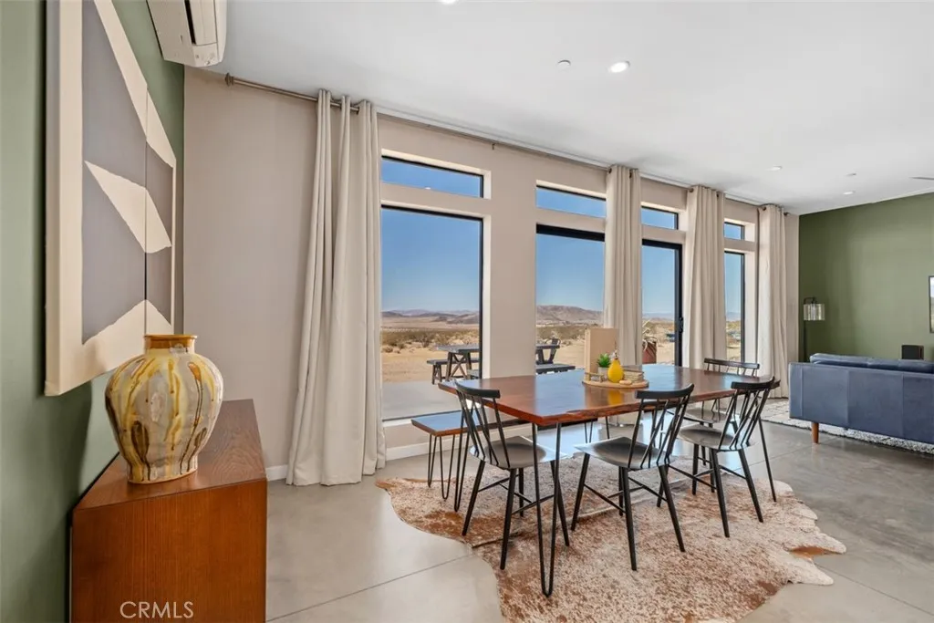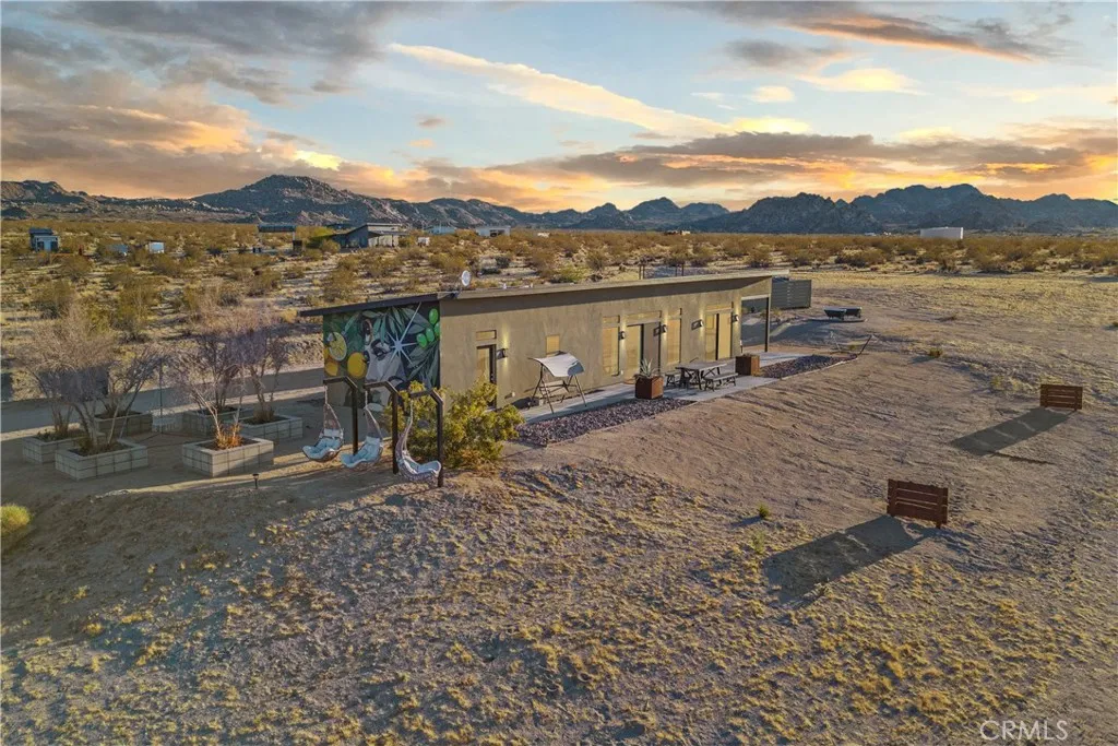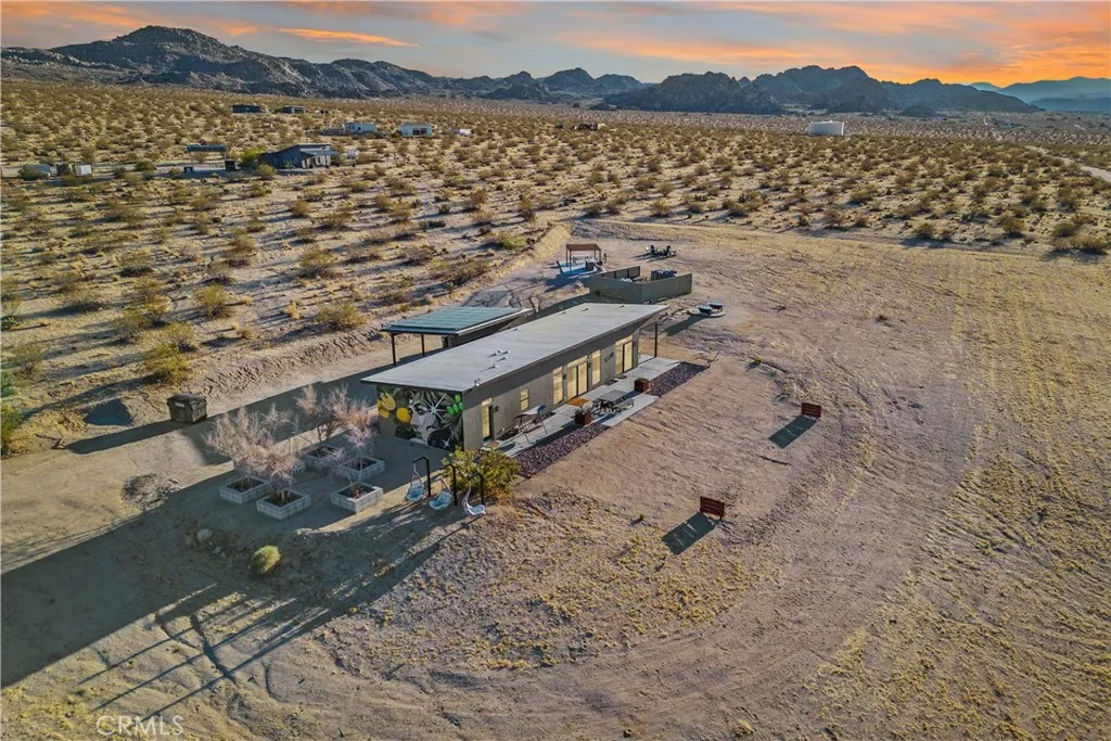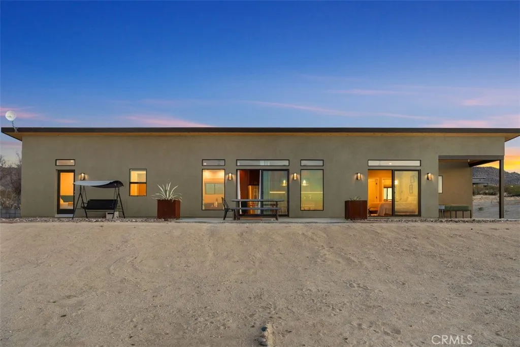 Modern 3 Bed 2 Bath Luxury eco-living in Joshua Tree, on 4.35 Acres of private land, built in 2019 with unobstructed views and direct access to hike the North Boundary of the Joshua Tree National Park. Develop your own eco conscious escape with unmatched privacy and panoramic vistas. The open concept interior is designed for seamless indoor-outdoor living. 3 bedrooms and 2 baths span 1360 sq ft of living space. Expansive windows flood the interior with natural light and miles of desert scenery while polished concrete floors, custom cedar cabinetry, stainless steel appliances, and quartz countertops add a touch of sleek, minimalist elegance. This modern single-level home is Solar powered with newly installed and fully paid for Tesla panels, a private water well, septic system, propane tank piped to the house, plus a back up water tank and generator, making this home 100% self-sustained, completely off grid and independent of all city utilities. The primary suite offers a walk in closet, patio access and en suite bath with soaking tub and separate glass enclosed shower. Two additional bedrooms, one with patio access, rest on the opposite side of the home sharing a nicely appointed bath with a walk in glass enclosed shower. Laundry and storage are hidden behind a stylish frosted glass paneled door in the hall. The 2 car covered Carport can double as another shaded entertainment area. Outdoor experiences such as swings, cast iron cold water soaking tubs, outdoor shower, day bed, a firepit, BBQ/ Dining area, and horseshoe pit enhance this chic remote experience. Truly an Oasis o
