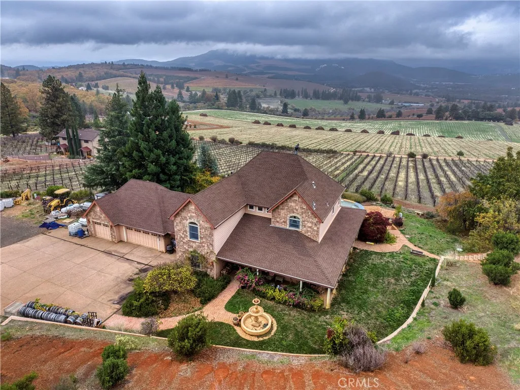 ESTATE HOME AND ADU ON 15+ ACRES! Spectacular views of vineyard and Mt. Konocti. Main residence 3372 SQ FT has 4 bedrooms, 4 1/2 bathrooms, each bedroom has its own full bathroom. Beautiful hardwood floors on first floor, private dining room with wine cellar. Commercial kitchen and granite counters. Wrap around porch to enjoy viewing of 7 acres of vineyard. Additional two-story building (ADU) 1800 SQ FT has a 1 Bedroom 1 bath upstairs with open floorplan and outside deck to enjoy the beautiful mountains and vineyards. The downstairs has many options for use, small kitchen area and 1/2 bath already in place. (Possible 2nd ADU)