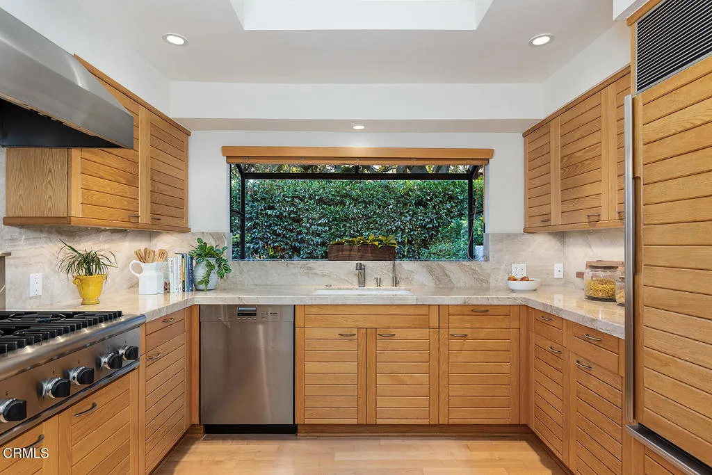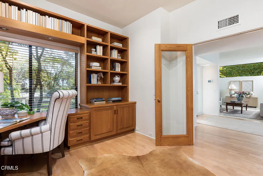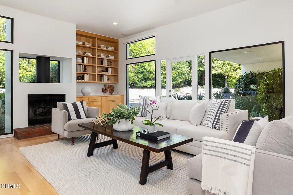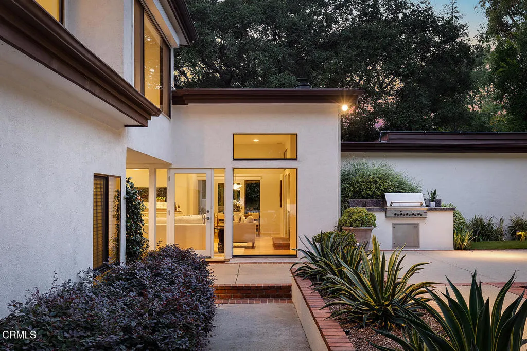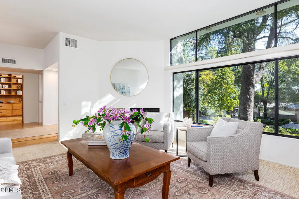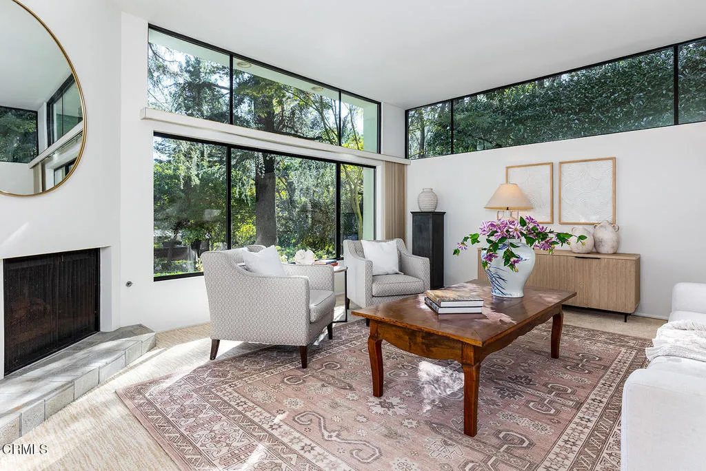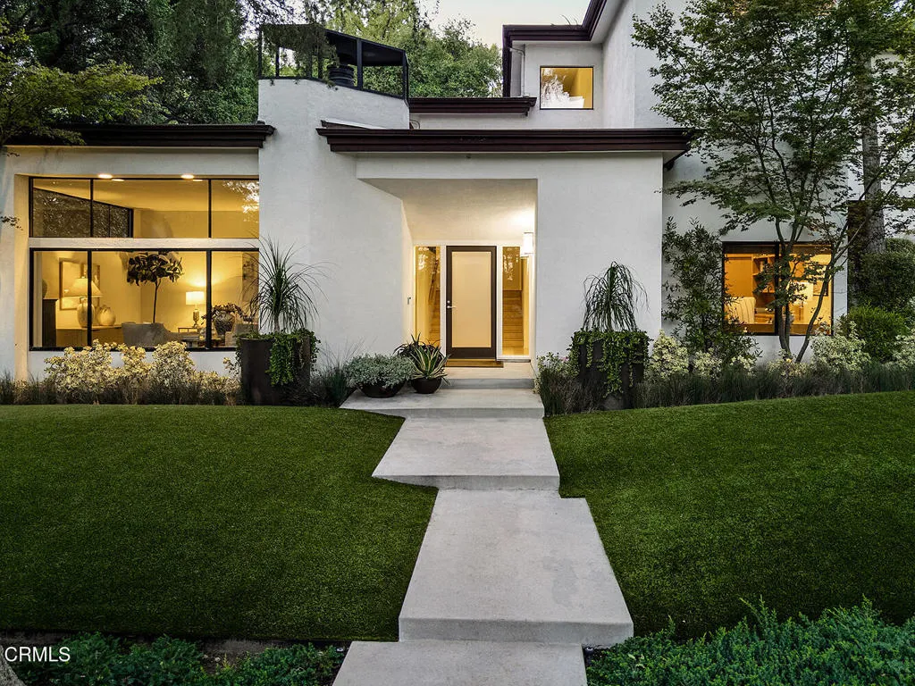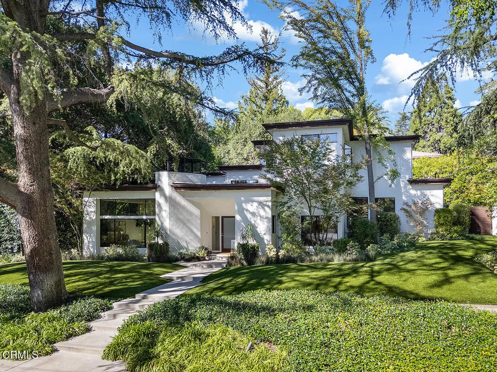 Framed by majestic deodar trees, this sculptural contemporary home blends architecturalsophistication and warm California modern living. Its striking frontage and manicured landscape offer instant curb appeal, while expansive glass walls fill the interior w/ natural light, blurring the line between indoors and out. Thoughtfully designed to frame tranquil garden views, each space embraces its lush surroundings, creating a serene, resort-like atmosphere where elegance and nature coexist in harmony. Located in one of the area's most desirable neighborhoods and within the award-winning La Canada Unified School District, this move-in ready home combines comfort, functionality, and design excellence. A flowing floor plan unites open gathering areas with private retreats, creating a seamless blend of livability and sophistication throughout. Four spacious bedrooms plus a flexible office with closet can serve as a fifth. Lauzon maple flooring, bespoke cabinetry, and European hardware highlight refined craftsmanship at every turn. One bedroom includes a built-in desk and custom Murphy bed with a quality mattress, offering dual convenience for guests or work-from-home living. Every room feels light-filled & thoughtfully connected, emphasizing calm, balance, and comfort through intentional design choices. The living and family rooms each feature gas fireplaces with recirculating systems and custom logs, adding warmth and ambiance while maintaining efficiency. The chef's kitchen serves as both a design statement and a culinary hub, featuring custom cabinetry, quartzite counters, top-ti