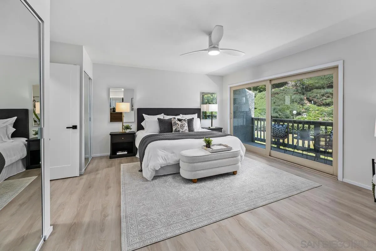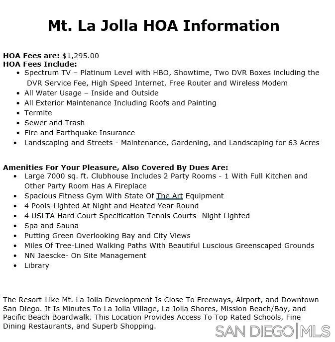 Stunningly remodeled 3BR/2.5BA 2,080 sq.ft. home tucked away at the end of a tranquil tree-lined cul-de-sac on the East Side of Mount La Jolla. This prime location has an expansive greenbelt at your backdoor— offering unmatched privacy and tranquility. The gorgeous remodeled open-concept kitchen features brand new appliances and quartz countertop with waterfall edge. Enjoy the large dining/family area and separate living room with fireplace. Beautiful luxury plank flooring throughout, fresh paint, and a bright interior orientation that floods the home with natural light. Generous primary suite with tastefully remodeled en-suite bath. Central A/C. Experience tranquility while enjoying two private greenscape outdoor patios plus balcony. The Mount La Jolla community is 63 acres and has resort-style amenities with four pools (heated year round), 4 USTA night-lighted tennis courts, Club house with large party facility with full kitchen and another meeting room with fireplace. Equipped gym with additional stretching room and steam saunas. Library with children's section. Putting green. It's like living in an urban forest with walking paths and amazing tree lined streets. Private roads, great for walks! This location is minutes to La Jolla Village, La Jolla Cove, Top-Rated Schools, restaurants, shopping, Pacific Beach, Mission Bay, beaches, Boardwalk and more. This home is Ideal for families, professionals, or downsizers looking for peaceful, amenity-rich living in a prime La Jolla location.