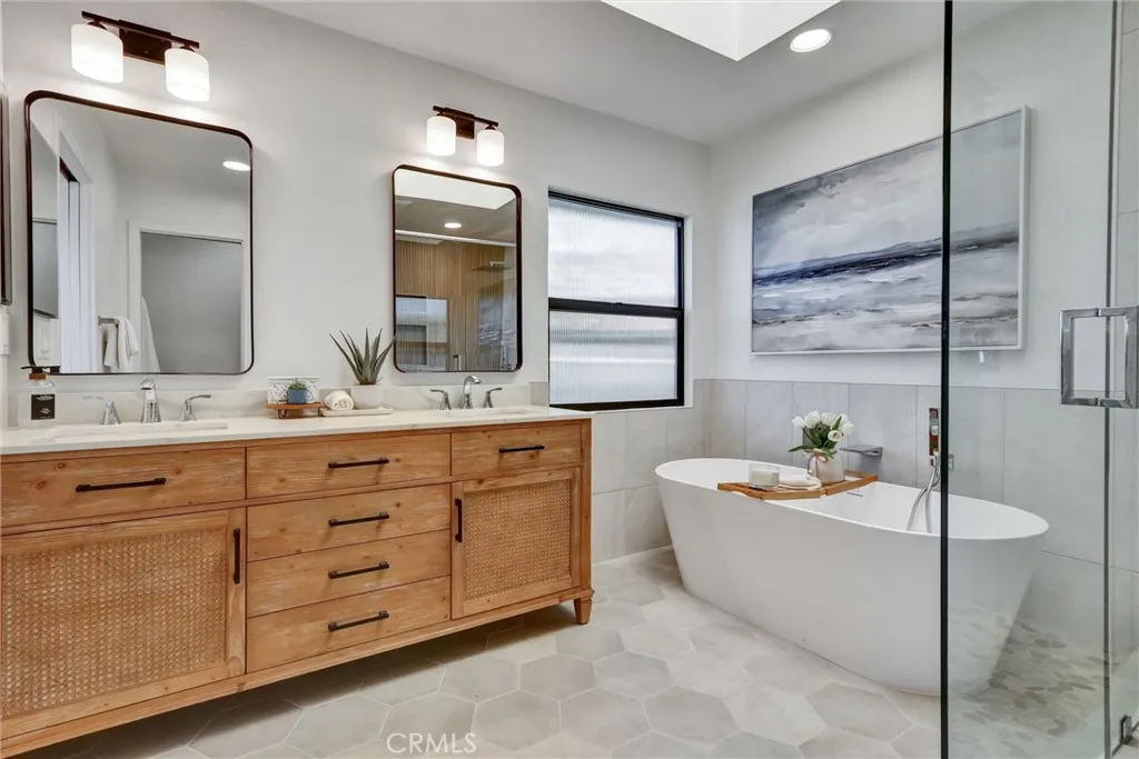 Modern coastal elegance in a prime La Jolla location! Tucked on a quiet street, this stunning single-story home sits on a spacious ~9,900 sq ft lot with 5 beds, 3 baths (incl. bonus suite) and approx. 2,847 sq ft of beautifully remodeled living space. New kitchen features Shaker-style soft-close cabinets, quartz countertops, countertop-to-ceiling backsplash, under cabinet lights, and stainless steel appliances. New baths, floors, paint, doors, and lighting throughout. The inviting primary suite offers a dual-sink vanity, freestanding tub, and frameless shower. Enjoy skylights, a cozy gas fireplace, peek-a-boo mountain views. Front yard features drought-tolerant landscaping with Wi-Ficontrolled drip irrigation and lighting, while the backyard offers artificial turf for a low-maintenance outdoor living. Finished garage with epoxy floors and long driveway. Brand-new energy-efficient heat pump HVAC system and ducts. Newer Dual Paned Windows. No HOA. Minutes to beaches, UCSD, and top-rated La Jolla schools. Link to video & 3D Matterport & more info: (https://blueskypixs.hd.pics/5515-Thunderbird-Ln/idx)