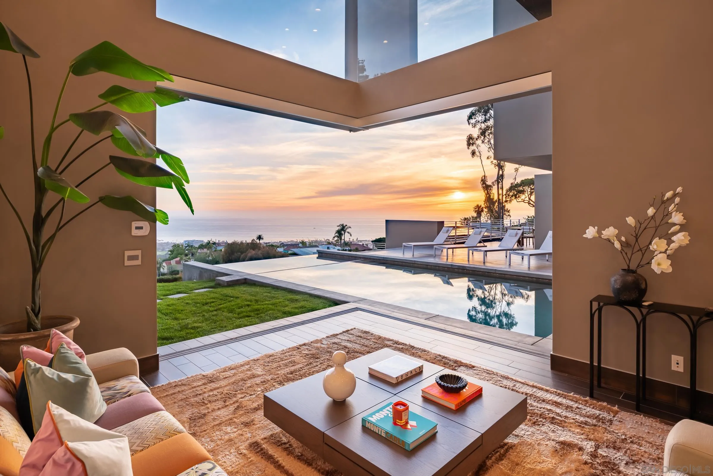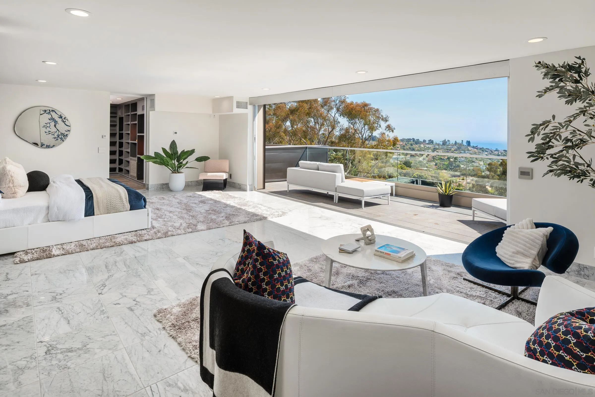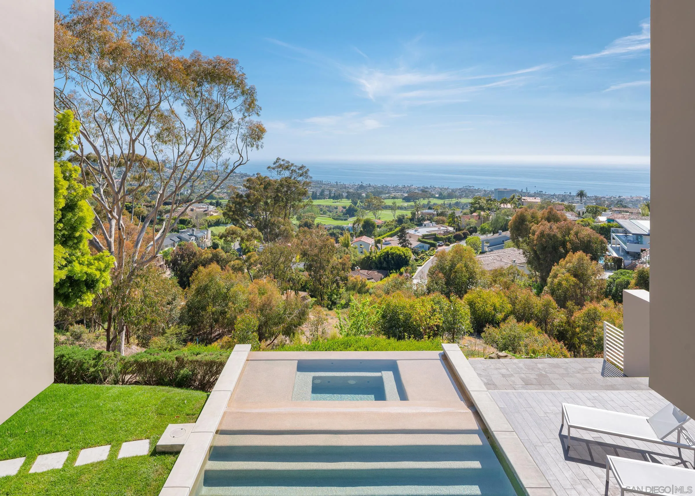 Perched above La Jolla’s prestigious Country Club, this award-winning contemporary estate by Jorge Ozorno is a true work of art. Designed to embrace the breathtaking surroundings, floor-to-ceiling glass walls fully retract to expansive decks and terraces, creating seamless indoor/outdoor living and capturing panoramic views of the Pacific Ocean, golf course, and village below. This minimalist masterpiece offers 6 bedrooms, 7 bathrooms, a private office, detached gym/yoga studio, infinity-edge pool and spa, sauna, and fire pit. The chef’s kitchen is outfitted with sleek custom cabinetry and a dramatic natural stone island—perfect for entertaining or quiet nights at home. The entire third floor is dedicated to the luxurious primary suite, featuring a private view deck, spa-inspired bath with a sculptural freestanding tub overlooking the ocean, and a newly reimagined boutique-style walk-in closet. Set on over half an acre with room to add a sport court, garden terraces, or outdoor lounge areas, this is a rare opportunity to own a timeless architectural statement in one of La Jolla’s most sought-after locations.