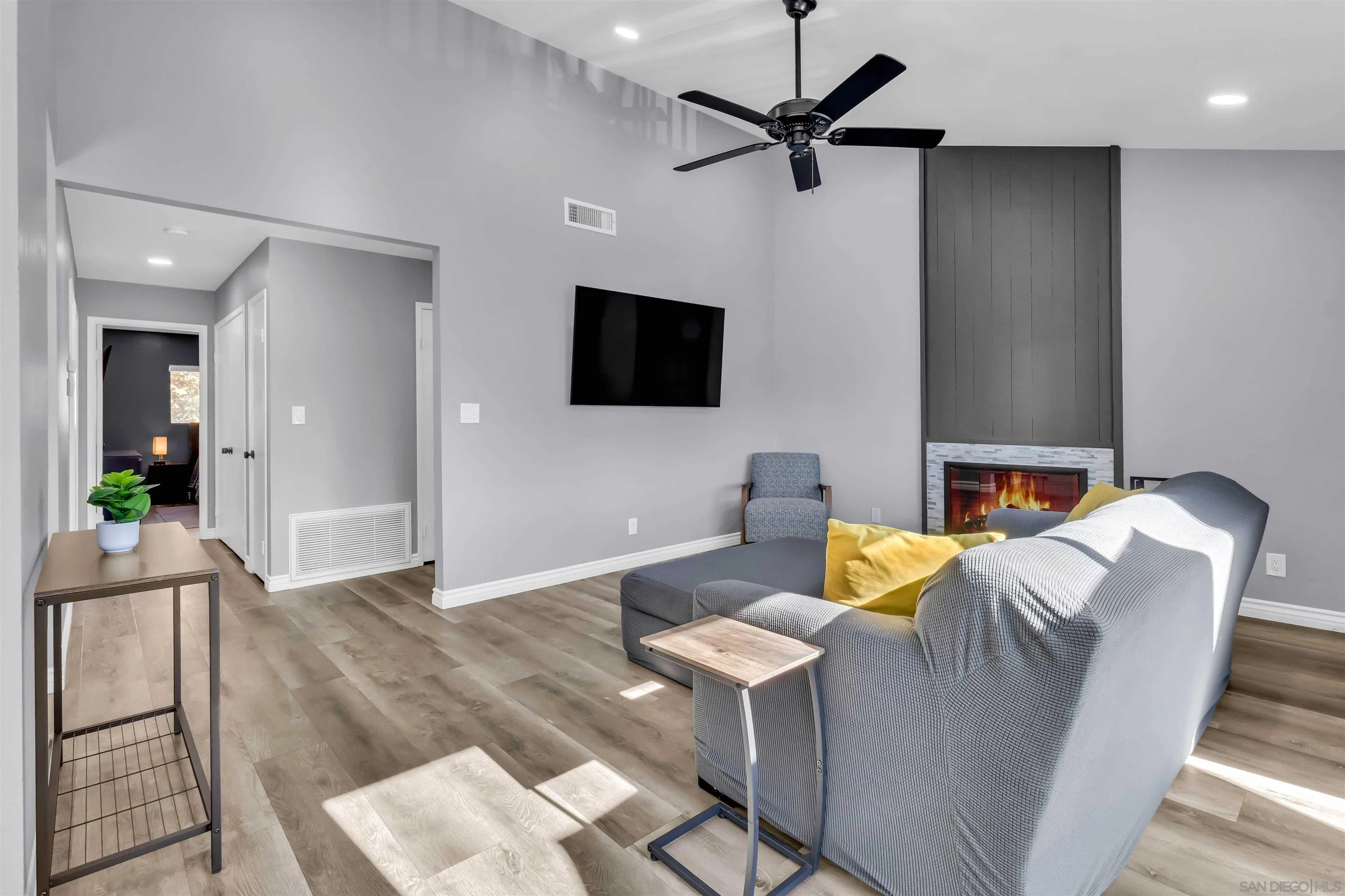 This VA approved total turn-key, top-floor end unit blends modern comfort with a bright, open layout. The spacious living room features a vaulted ceiling & a cozy wood-burning fireplace—perfect for relaxing or entertaining. The completely remodeled kitchen offers shaker-style cabinetry, quartz countertops, ample prep space, newer appliances & opens seamlessly to the dining area for easy hosting. Luxury vinyl plank flooring runs throughout the home, complemented by central A/C for year-round comfort. Both bathrooms showcase stylish subway-tile showers & the large primary bedroom easily accommodates a king-size bed with additional furniture. The balcony includes a convenient laundry closet with side-by-side washer & dryer. Two designated parking spaces—a carport with small storage closet plus an additional uncovered space—both located close to the unit. Parkway Manor offers a well-maintained community with a sparkling pool and spa, lush landscaping, & reasonable HOA fees that include Cox cable TV. The HOA is well-funded for long-term peace of mind. Conveniently located near Lake Murray, shopping, dining, Grossmont Hospital, and major freeways, this home delivers both comfort & accessibility.