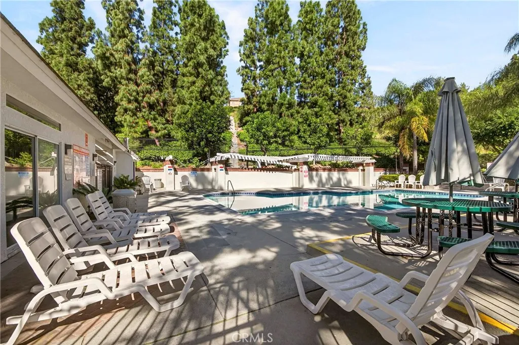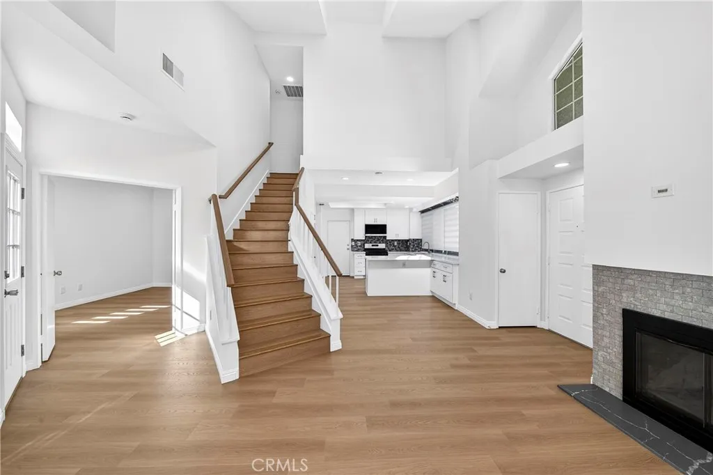 THE GLEN" IS TRULY ONE OF THE MOST DESIRABLE NEIGHBORHOODS IN LA MIRADA'S HILLSBOROUGH COMMUNITY. This highly desirable three-bedroom, two-bathroom condo is move-in ready and offers all the updates you are seeking, including a one-bedroom downstairs. Upstairs, you will find two spacious bedrooms with a brand-new Jack and Jill bathroom. Upon entering, you will be greeted by the spacious living room, featuring vaulted ceilings and an inviting fireplace. The living room and dining room are open to the kitchen, creating an open floor plan. Numerous windows make this property exceptionally light, bright, and airy. The completely remodeled vinyl plank flooring runs throughout the interior. The brand-new kitchen boasts white shaker-style cabinets, quartz countertops, a stylish backsplash, a large pantry, a deep stainless-steel sink, and stainless-steel appliances. The first-level bedroom is a good size with private entry to the first-level full bathroom and overlooks a private patio area. Upstairs, the two additional bedrooms both feature vaulted ceilings, ample closets, and share the second full bathroom with a dual sink vanity. Both bathrooms have been updated with white shaker cabinets, brushed stainless fixtures, and quartz countertops. The laundry is conveniently located in the hallway adjacent to the garage entry. Thepaved brick patio offers a great place to barbecue separately from guests or use as a small garden area. This property is located in a very nice development surrounded by lush mature trees and numerous greenbelts. The quiet, relaxing community ambiance and surro