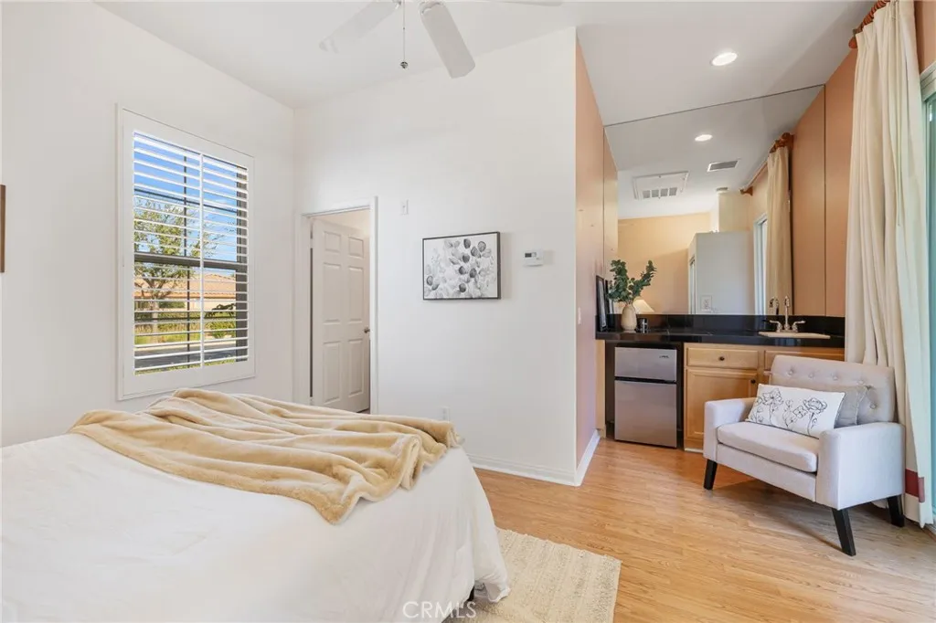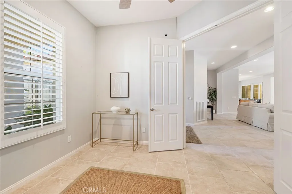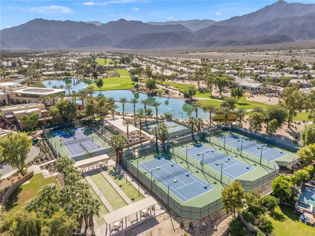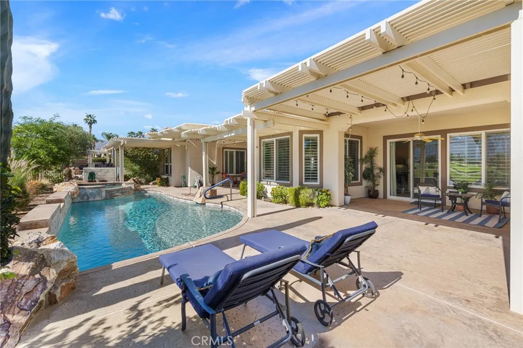 Discover one of the finest views in Trilogy La Quintas 55+ resort community. This exceptional Tamarisk modelwith over 2,700 sq. ft., 3 bedrooms, 4 baths, and a private casitaoverlooks two fairways and a serene lake, offering a truly breathtaking backdrop. Inside, the gourmet kitchen shines with stainless steel appliances, slab granite countertops, a large center island, trash compactor, custom stone backsplash, pantry, ceiling fans, and a cozy breakfast nook. The formal dining room captures beautiful views of the mountains and pool, perfect for elegant gatherings. The spacious great room is designed for comfort, featuring an entertainment niche, surround sound, ceramic tile flooring, and custom window treatments. A separate den can easily function as an additional sleeping space, and the powder room serves as a three-quarter bath for added convenience. The primary suite offers upgraded recently remodeled dual vanities, a large beautiful shower, and a walk-in closet. All bedrooms are upgraded with new carpet, custom drapes, insulating drop-down shades, ceiling fans, and updated fixtures. The casita is perfect for caretaker, guests or extended stays. Outdoors, enjoy beautiful dual paved patios with patio roof shade structures, framing a sparkling saltwater pool with waterfalls and rockwork, and spa ideal for relaxation or entertaining. The three-car garage comes fully outfitted with built-in cabinets, a workbench, and an evaporative cooler. A rare combination of luxury, comfort, all with one of Trilogys most remarkable views.