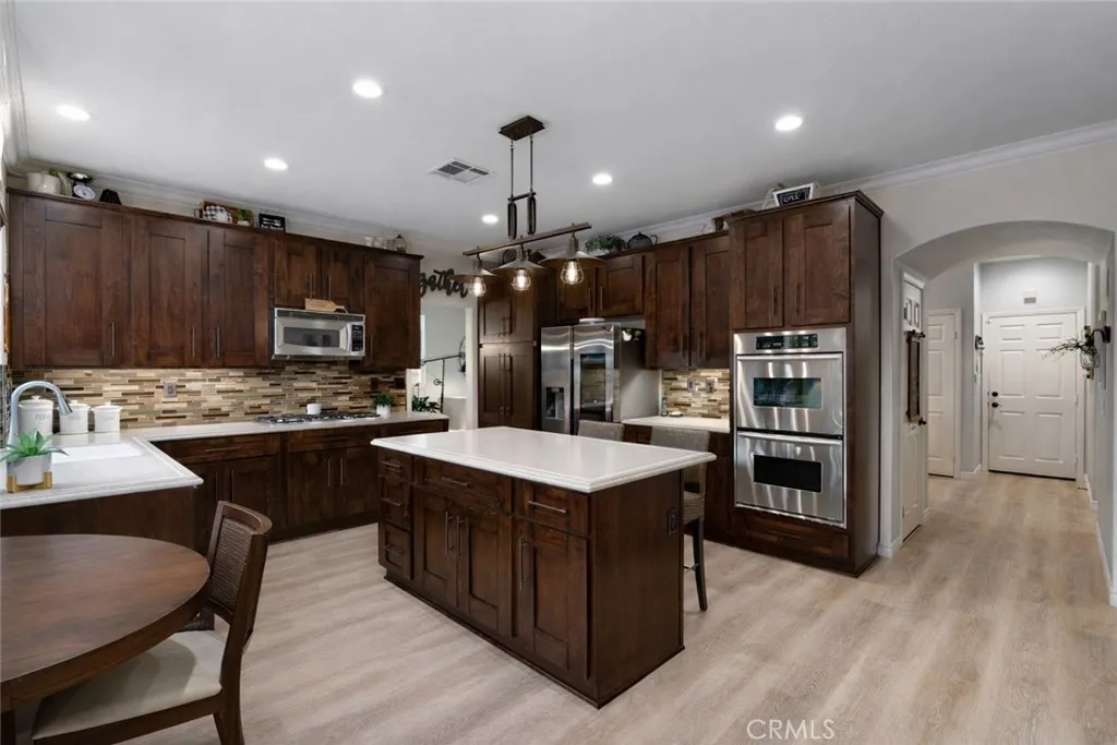 Tucked behind the gates of La Verne Heights, this thoughtfully remodeled residence blends refined interiors with a resort-style outdoor setting. Layered stonework, accent lighting, and hardscape walkways guide you through a private courtyard to a covered, arched entry with custom double doors. Inside, a two-story foyer sets the tone with an arched transom window, chandelier, wide-plank LVP flooring, and crown molding throughout. A staircase with a mid-landing, wood handrail, and dark metal balusters adds architectural presence. The living and dining rooms are filled with natural light, with the dining space highlighted by a modern chandelier and oversized mirror. The kitchen opens seamlessly to the family room and features Corian countertops, warm wood cabinetry, a glass tile backsplash, and stainless steel appliances including double ovens, gas cooktop, and built-in microwave. A center island with bar seating and pendant lighting anchors the space, while the breakfast nookframed by multiple windows and a glass dooroffers direct access to the backyard. The family room centers around a stacked-stone fireplace with built-in media cabinetry and views of the outdoor living areas beyond. The main level is completed by a private office or optional fourth bedroom, a full bathroom with walk-in shower, and an indoor laundry room with sink and storage. Upstairs, an expansive bonus room with vaulted ceilings and recessed LED lighting provides flexible use as a media room, game room, or secondary living space. The primary suite serves as a private retreat, featuring crown molding, plus