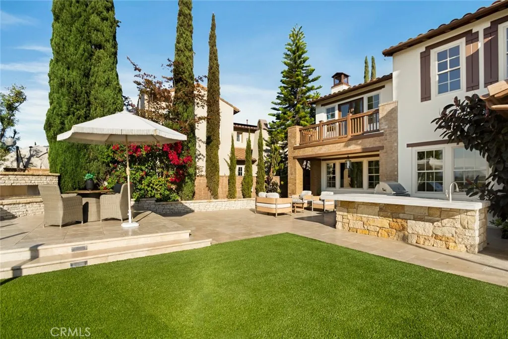 Panoramic evening light, sunset and valley views provide an ever-changing backdrop for exquisite luxury living at this magnificently upgraded Ladera Ranch estate. Located in Alisal at the end of a tree-lined cul-de-sac street behind the guard-gated entry of Covenant Hills, the home reveals its outstanding interaction with outdoor living spaces. Guests are welcomed beyond a custom arched trellis, down a long custom-finished driveway, and through a gated entry courtyard with enchanting tile wall feature. Indoors, a quest for ageless design that transcends trends and grows richer over time is immediately apparent. A rotunda foyer with inlaid tile medallion flows effortlessly to a formal living room with stone fireplace, and a formal dining room with built-in cabinetry and French doors leading to a private fireplace-warmed courtyard. Approximately 4,442 square feet, the impressively sized residence showcases a family room with fireplace, courtyard access and a seamless transition to the professionally upgraded kitchen, where new heights of culinary perfection are easily reached. Enjoy a generous island with seating, extensive white cabinetry including a built-in pantry in the breakfast nook, quartz countertops with full backsplash, a French door to the backyard, and a full suite of stainless-steel Viking appliances, including a double oven, built-in refrigerator and a six-burner cooktop with grill and matching hood. Five ensuite bedrooms and five- and one-half baths include a casita with separate entrance. The main-floor primary suite presents panoramic views, French doors open