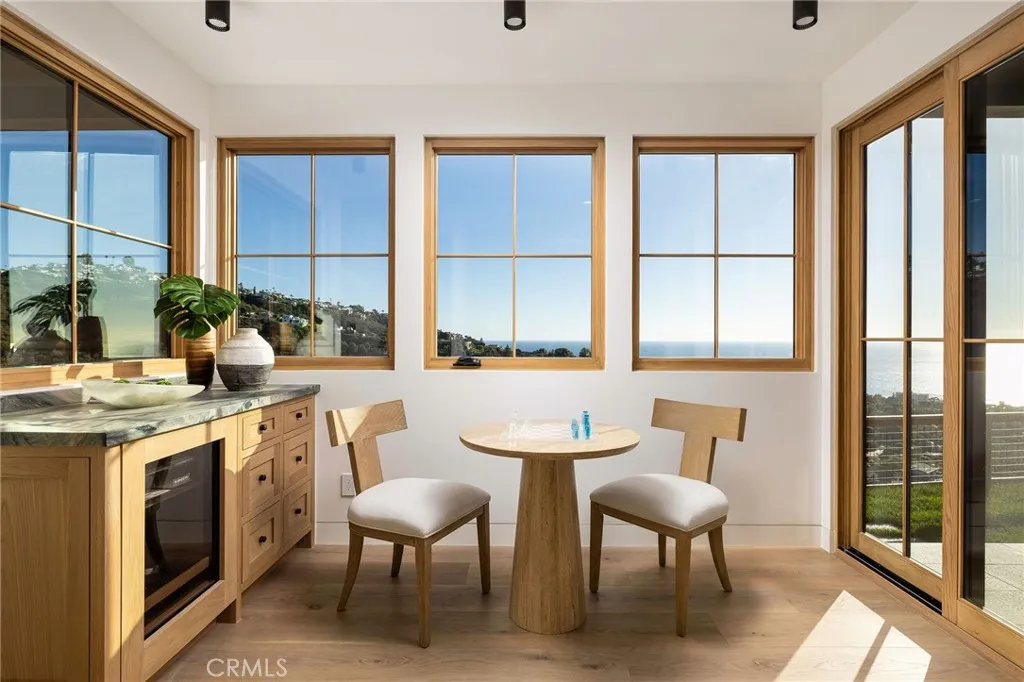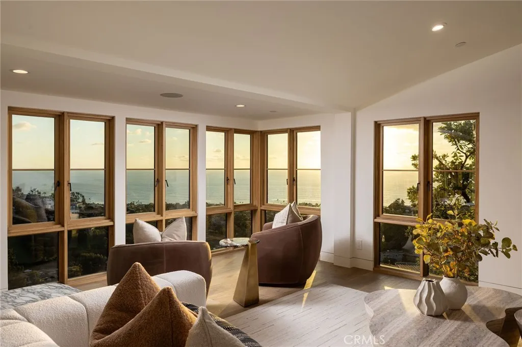 Truly a piece of art. Perched on a secluded hilltop cul-de-sac, this newly completed coastal residence captures sweeping 180-degree ocean, coastline, Catalina, and rolling-hill views across approximately 2,897 square feet of thoughtfully crafted living space. Set on a 7,410 SF parcel, the 4-bedroom, 4-bath redesign was created in collaboration with architect Marshall Innis, designer Andra Miller, and builder RLB. Glassed entry doors open to an elevated great room ideal for ocean-view lounging, dining, and taking in sunset tranquility over Catalina Island. The professional chefs kitchen features a striking quartzite fusion island, Sub-Zero wood-clad refrigerator, 48" Wolf range, and inset white-oak cabinetry. Fifteen-foot La Cantina doors connect seamlessly to an expansive courtyard with al fresco dining, BBQ center, flagstone paths, fountain, specimen trees, private alcoves, and lush professional landscapingindoor-outdoor living at its finest. The spacious ocean-view dining area with Sub-Zero wine bar leads to a generous view deck. This level also includes a flexible bedroom/den and a private primary suite with deck access, sitting area, large bath with separate shower and tub, and walk-in closet. A sea-green Zellige tile bath and laundry room complete the main level. An open staircase descends to a warm, versatile lower level offering a family/office nook, separate media lounge, ensuite bedroom with 3/4 bath, additional bedroom, another 3/4 bath, and a dedicated yoga/meditation room wrapped in glass and tranquil views. Finishes include wide-plank oak flooring, Zellige tile