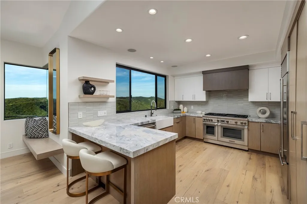 Skyline Drive -an iconic address earning its name every evening when the sun drops behind Catalina and sets the Pacific on fire. Captivating views, layers of scenic canyons, Catalina Island suspended at the edge of the Pacific beyond yourownterraces.At the crest of Mystic Hills, on just over a quarter acre overlooking Laguna Beach, this Contemporary-style residence was built in 1994 and comprehensively reimagined in 2023.The 2,780-square-foot home, with four bedrooms and four baths, presents an ideal floor plan that enhances modern living and entertaining while accommodating evolving lifestyles.The principal living spaces and primary suite open directly onto ocean and canyon-facing terraces, where first light moves quietly across the interiors and sunsets command ambience. A dedicated lower level provides private guest accommodations or ancillary bedrooms with independent terrace access separate, composed, quietly self-contained.Provenza hardwood floors, Onyx Glass windows, volume ceilings, custom millwork, and Sonos whole-home audio shape interiors that feel curated yet effortless.New HVAC and earthquake-resistant structural engineering ensure performance keeps pace with presentation.The kitchen and dining area form the gravitational center of the home Bardiglio Versilis marble countertops, Raku rift oak cabinetry, Thermador and Sub-Zero appliances, and a waterfallbarelevate everyday living experiences.Beyond the interiors, the lot and exterior descend with uncommon depth, creating opportunity for terraced gardens, expanded outdoor living, or simply the quiet luxury of s