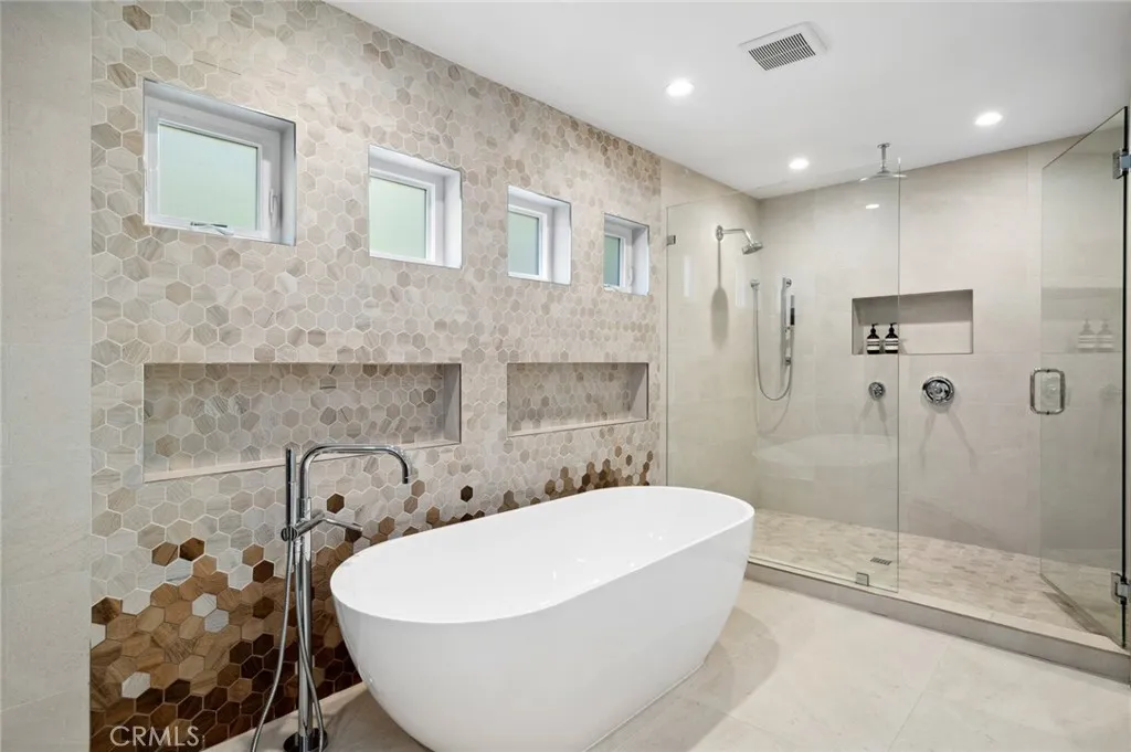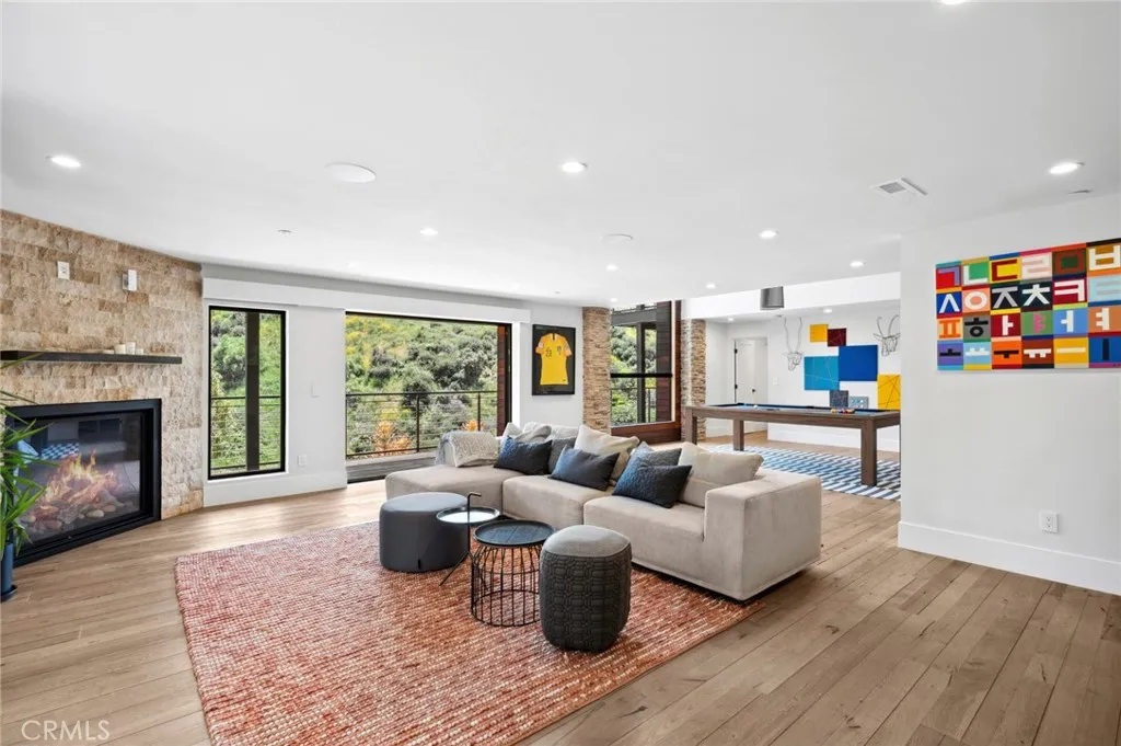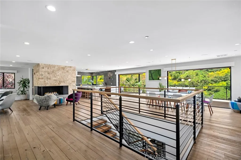 Showcasing a modern design aesthetic with exceptional architecture inside and out, this custom Laguna Beach home brings the beauty and serenity of canyon and evening-light views into fabulously open living spaces. Located on an enormous homesite of more than 53,000 square feet at the end of a cul-de-sac just moments from the vibrancy of Laguna Village, the residence reveals lush landscaping that complements stone, wood and steel exterior materials. A large glass entry door opens to a stunning interior where an organic blend of cohesive elements is embellished with on-trend decor. An abundance of natural light streams through vast windows and slide-away pocket doors, creating a seamless indoor/outdoor ambiance while illuminating approximately 5,420 square feet that includes five bedrooms, four of which are en suite, and seven baths. Each level offers easy access to the outdoors, with the main floors dining room, fireplace-warmed living areas, and kitchen flowing to a deck to create one large and open living space.Imagine the memories created while entertaining friends and loved ones during special celebrations, all with tranquil canyon vistas as a peaceful backdrop. Custom wood cabinetry and Mont Blanc quartzite countertops capture the eye in a kitchen with oversized island, open shelving and a full tile backsplash. Top appliances include a six-burner Thermador range and a built-in refrigerator and dishwasher from Miele. A junior primary suite and an ocean-view office with deck access are also featured on this floor,giving it the feel of single-level living.Follow a dramatic